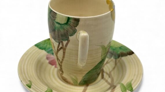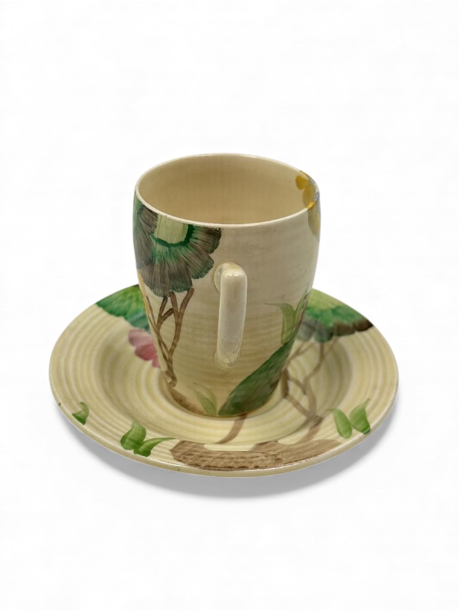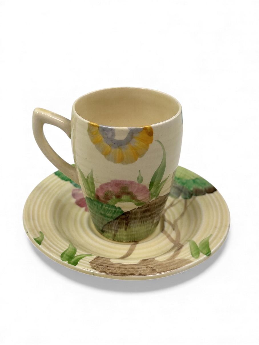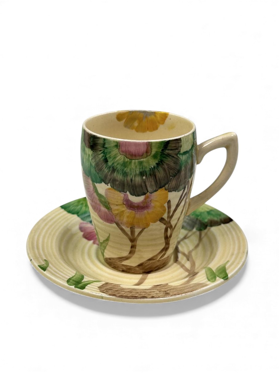 This is a lovely coffee cup & saucer, decorated with one of Clarice’s most popular patterns. Decorated saucer.