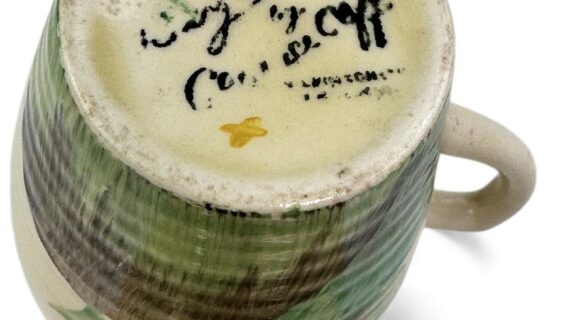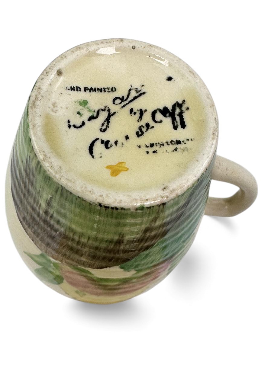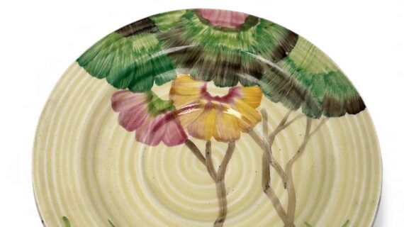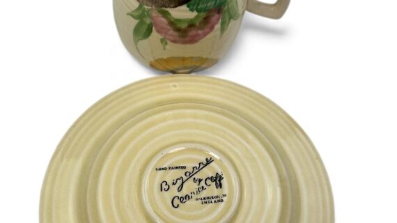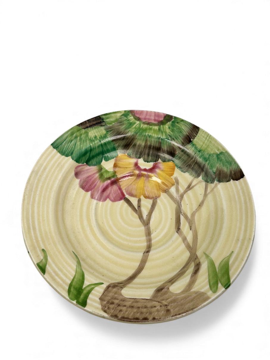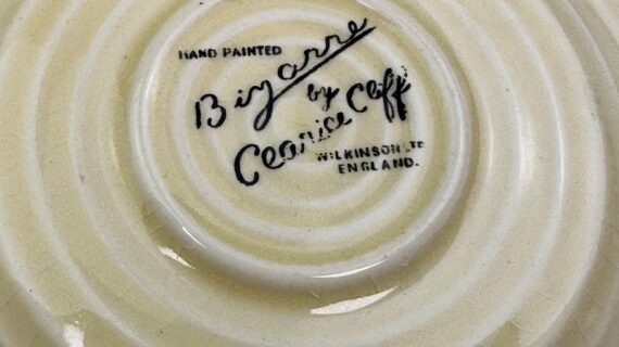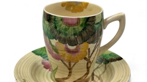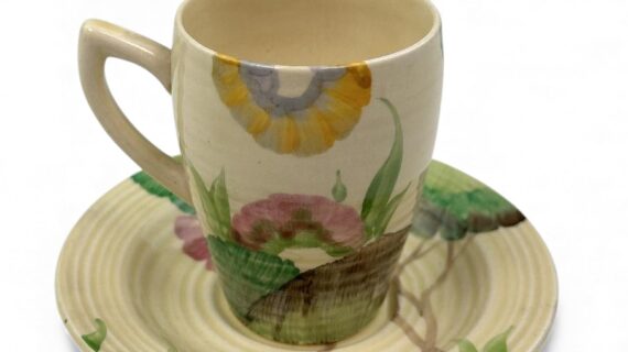 This is a lovely coffee cup & saucer, decorated with one of Clarice’s most popular patterns. Decorated saucer.