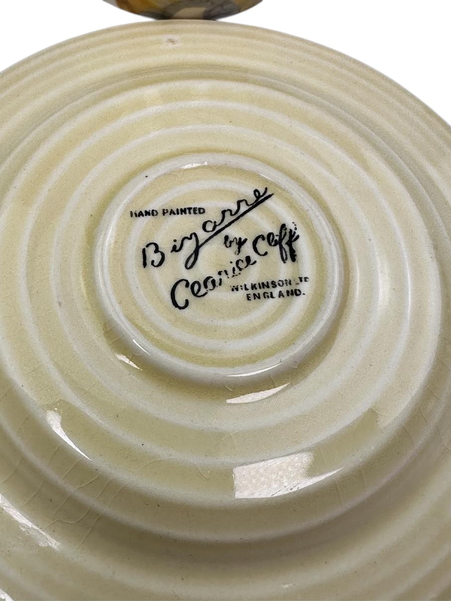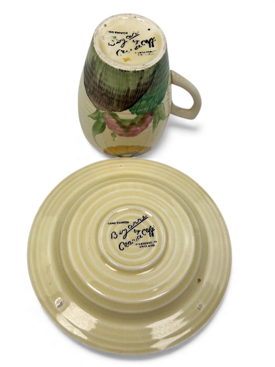 Stamped Bizarre by Clarice Cliff to the bases of both the cup and the saucer.