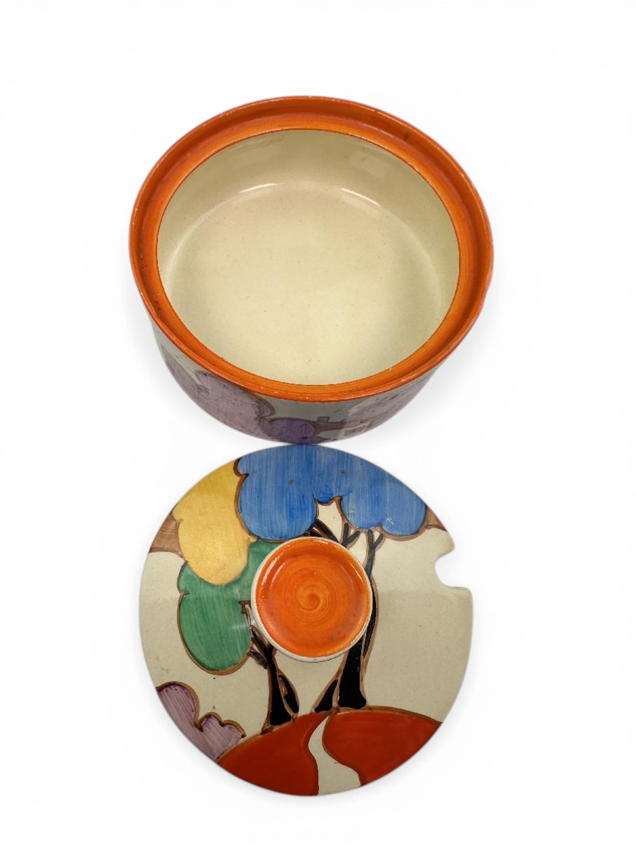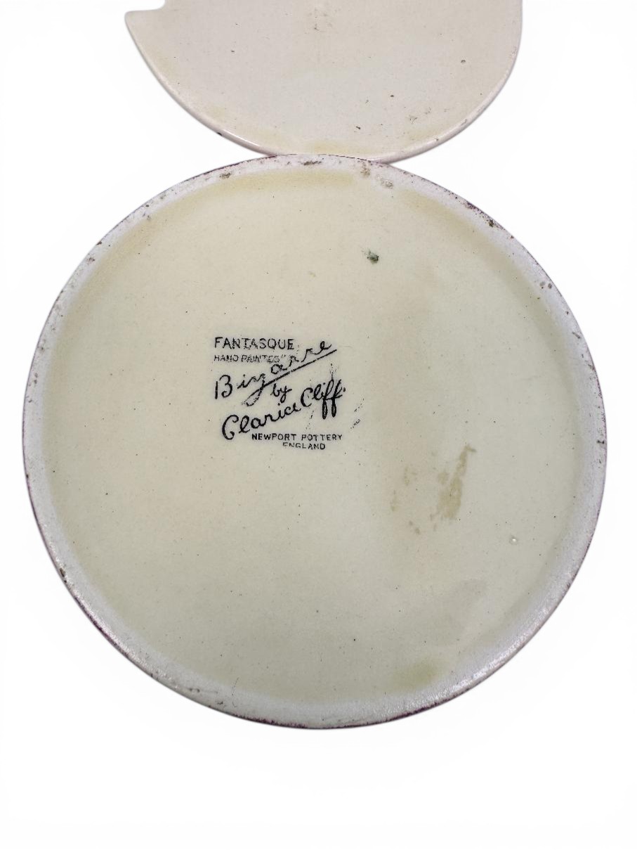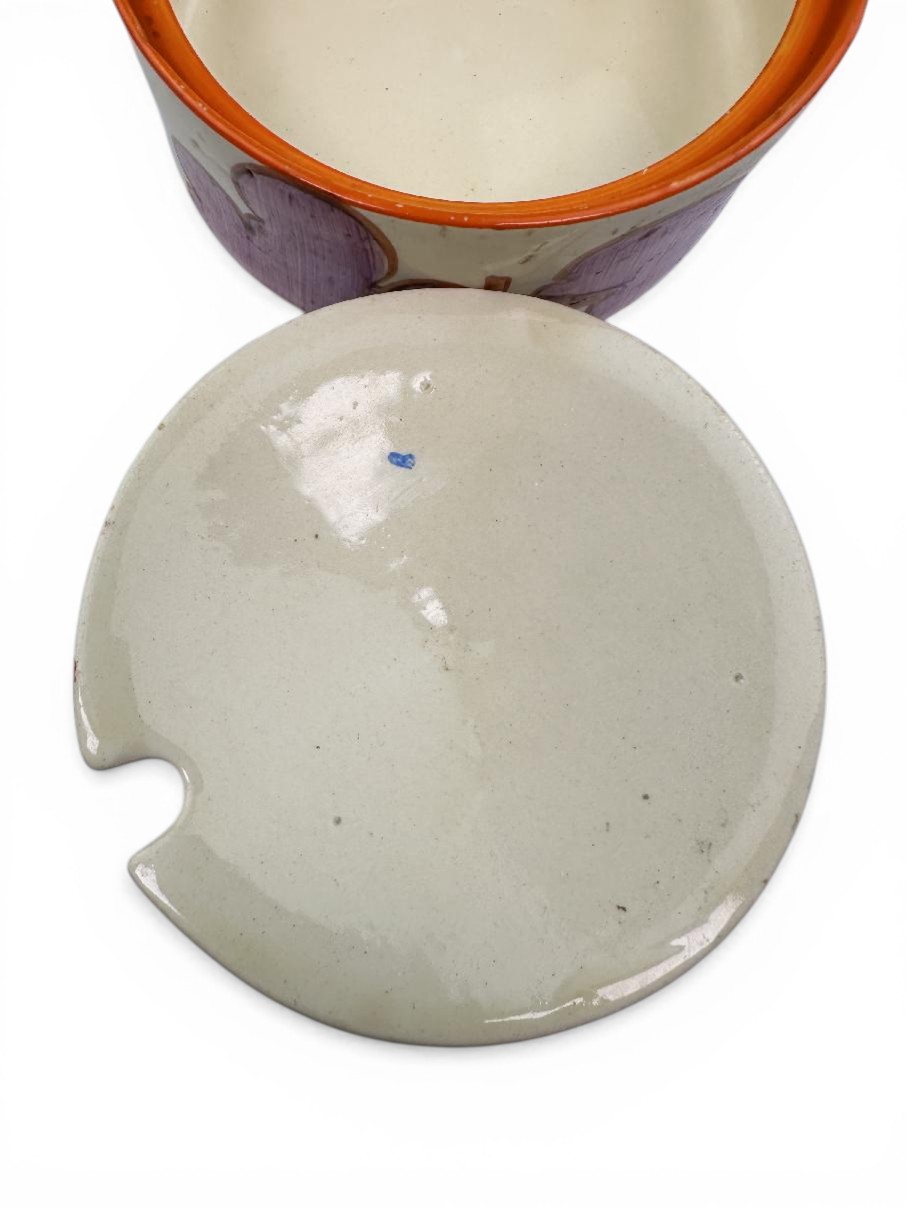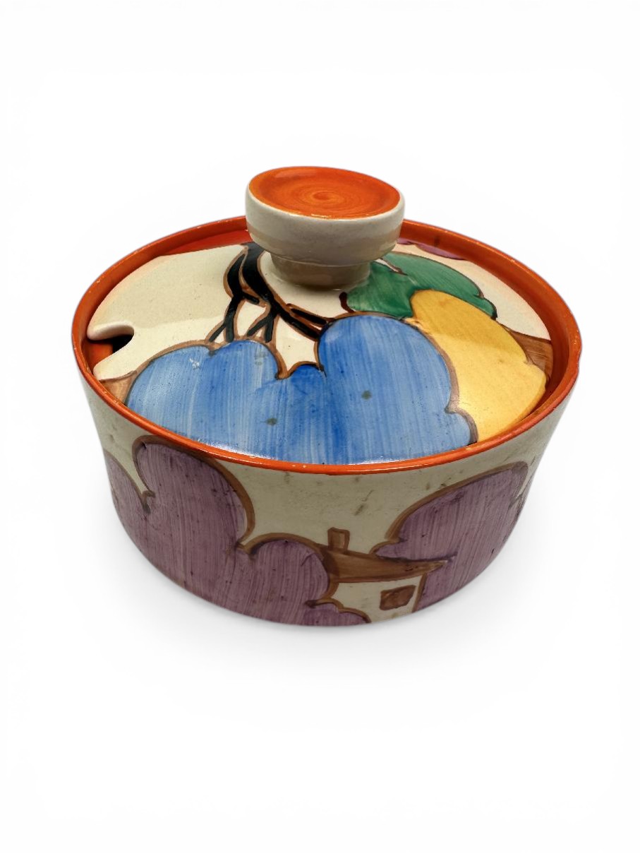 Autumn (blue) pattern bonjour shape round, flat preserve pot with lid. Circa 1932, 10.5cm.