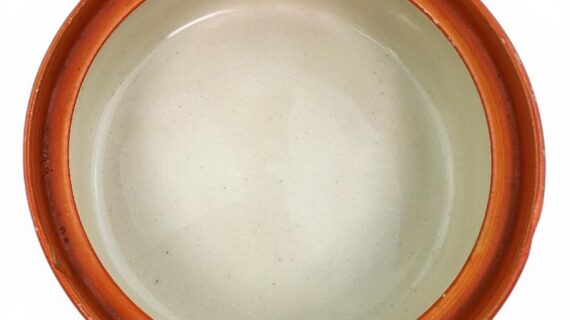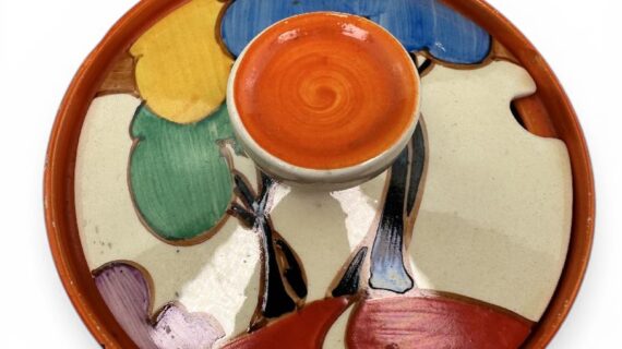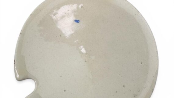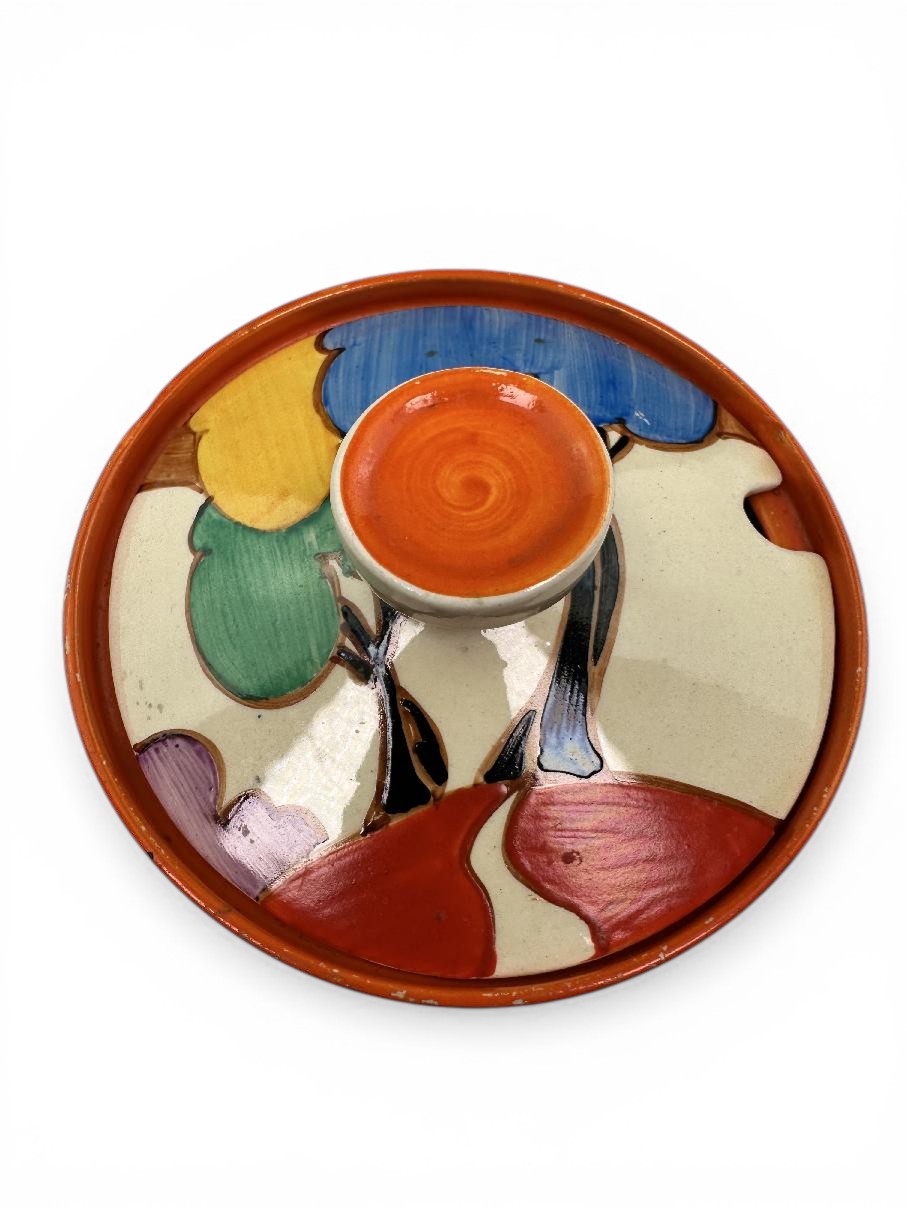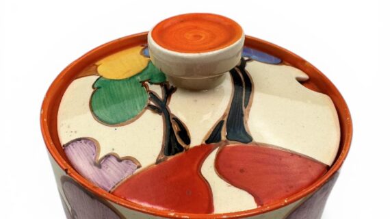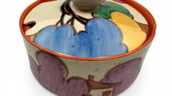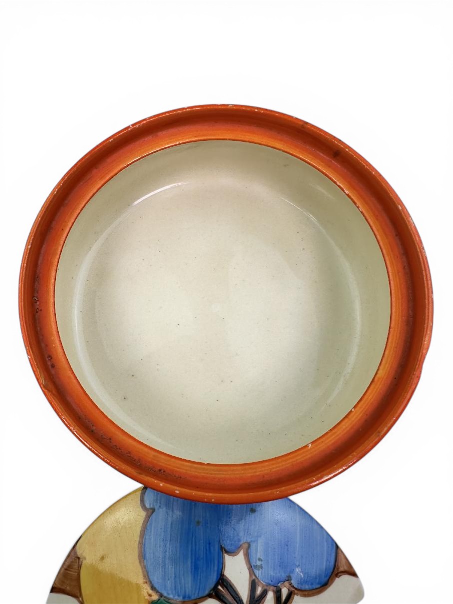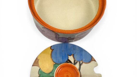 Autumn (blue) pattern bonjour shape round, flat preserve pot with lid. Circa 1932, 10.5cm.