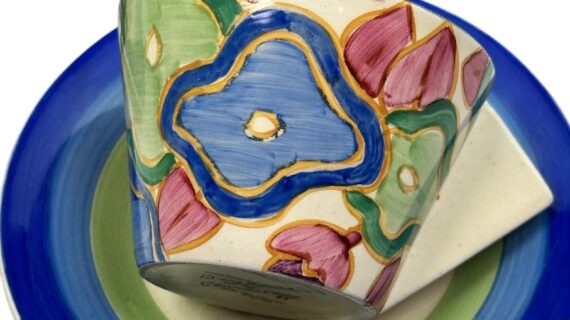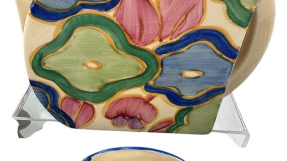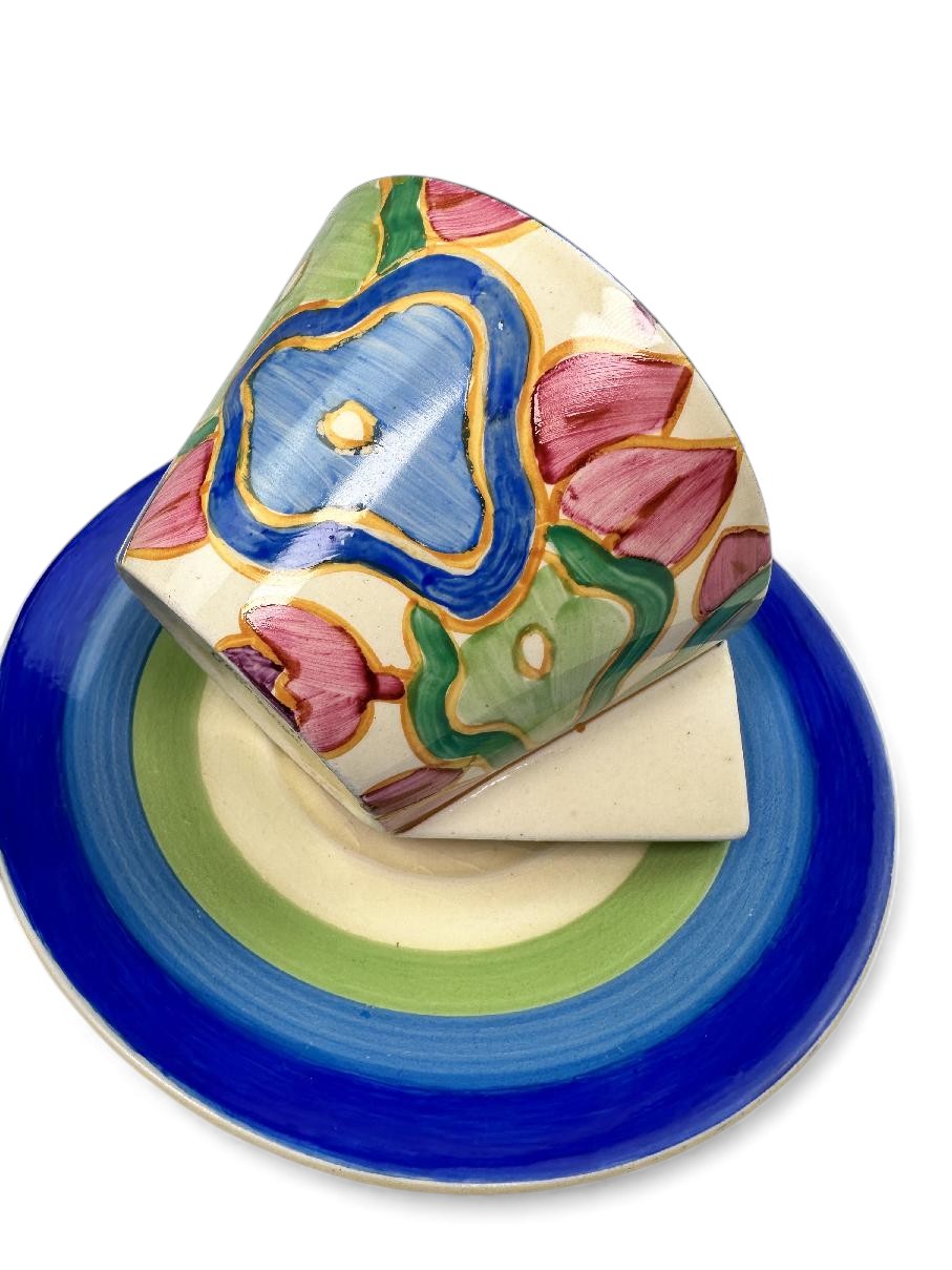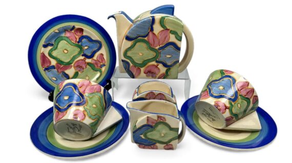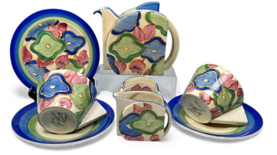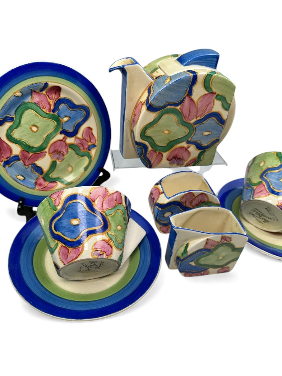 Hand painted with stylised flowers and foliage with tonal blue and green banding. Very attractive and clean with no chips, cracks or stains. There has been some professional paint refreshing to some of the dark blue areas, a minor professional repair to one cup and some light crazing. All of which don’t detract in any way from this wonderful set, but only fair to mention.