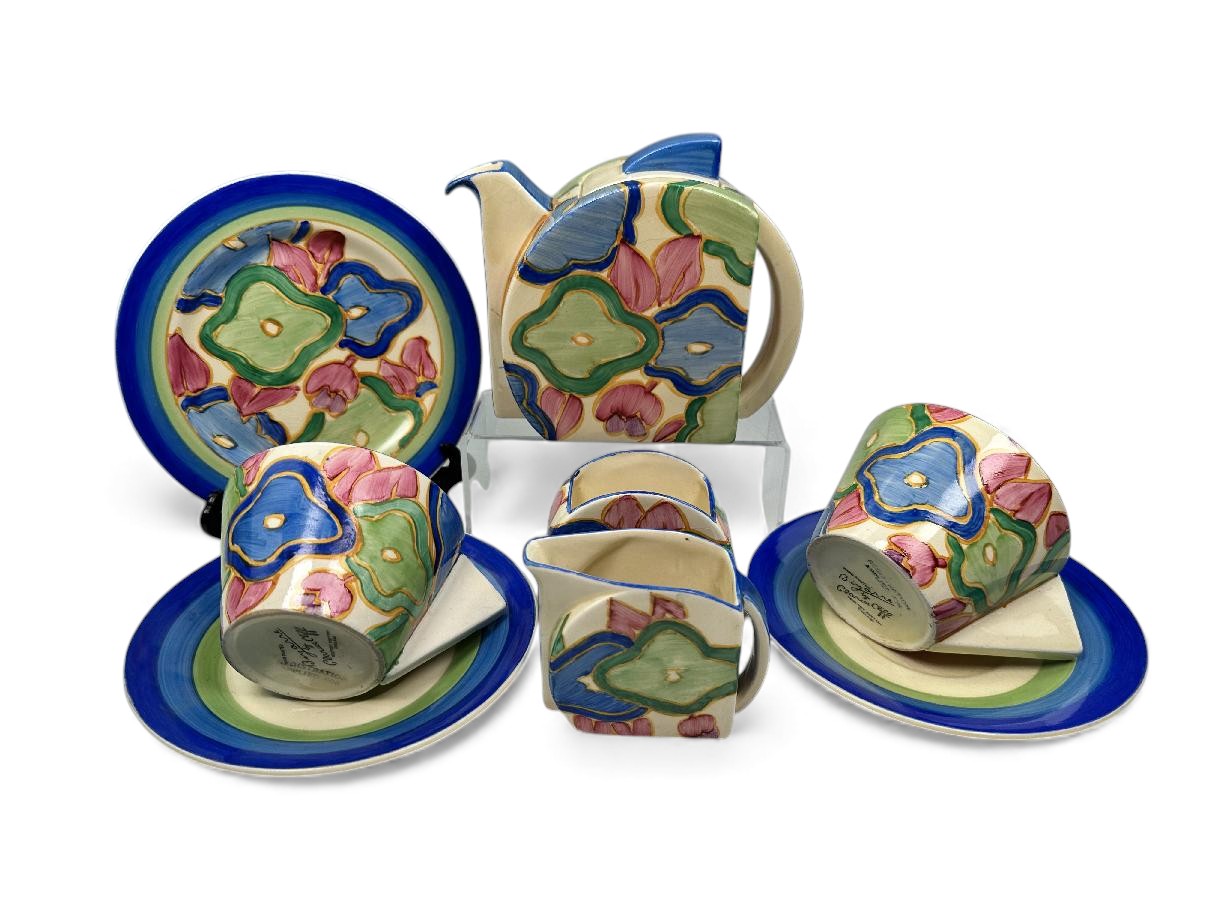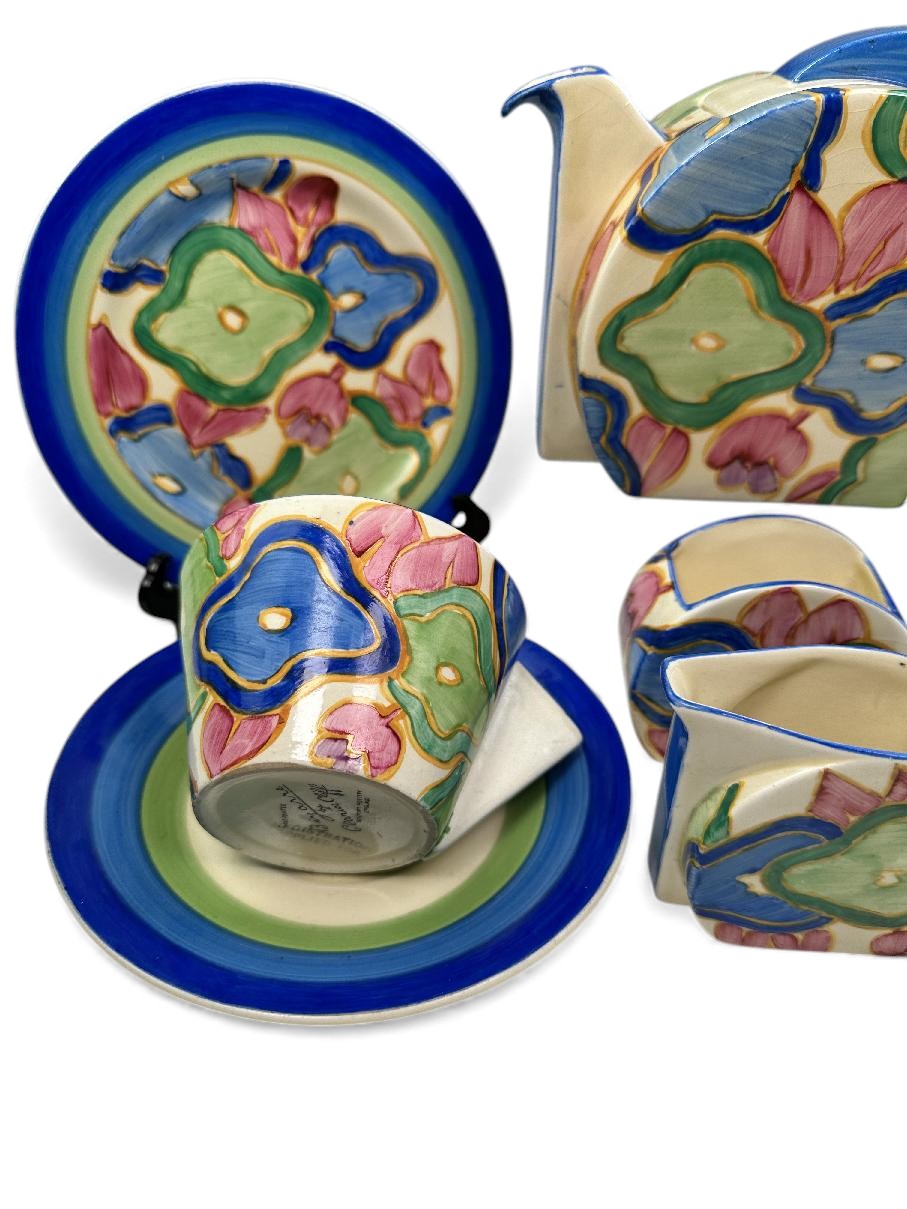 Clarice Cliff BLUE CHINTZ pattern stamford Tea-for-two teaset. Comprisiong teapot, milk, sugar, two cups and saucers and a side plate.