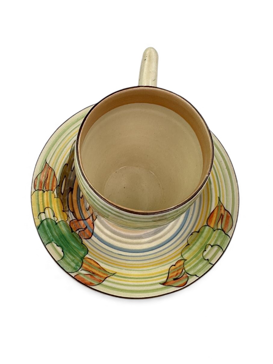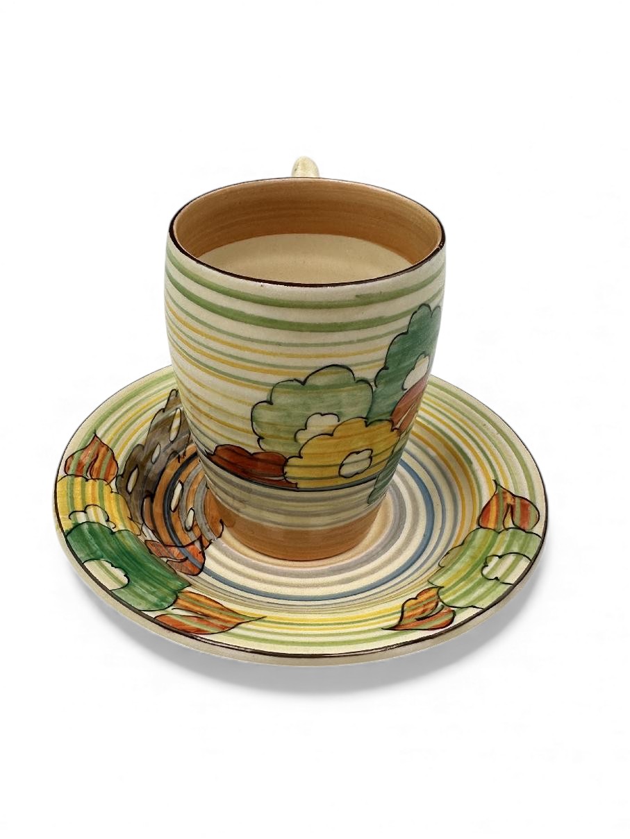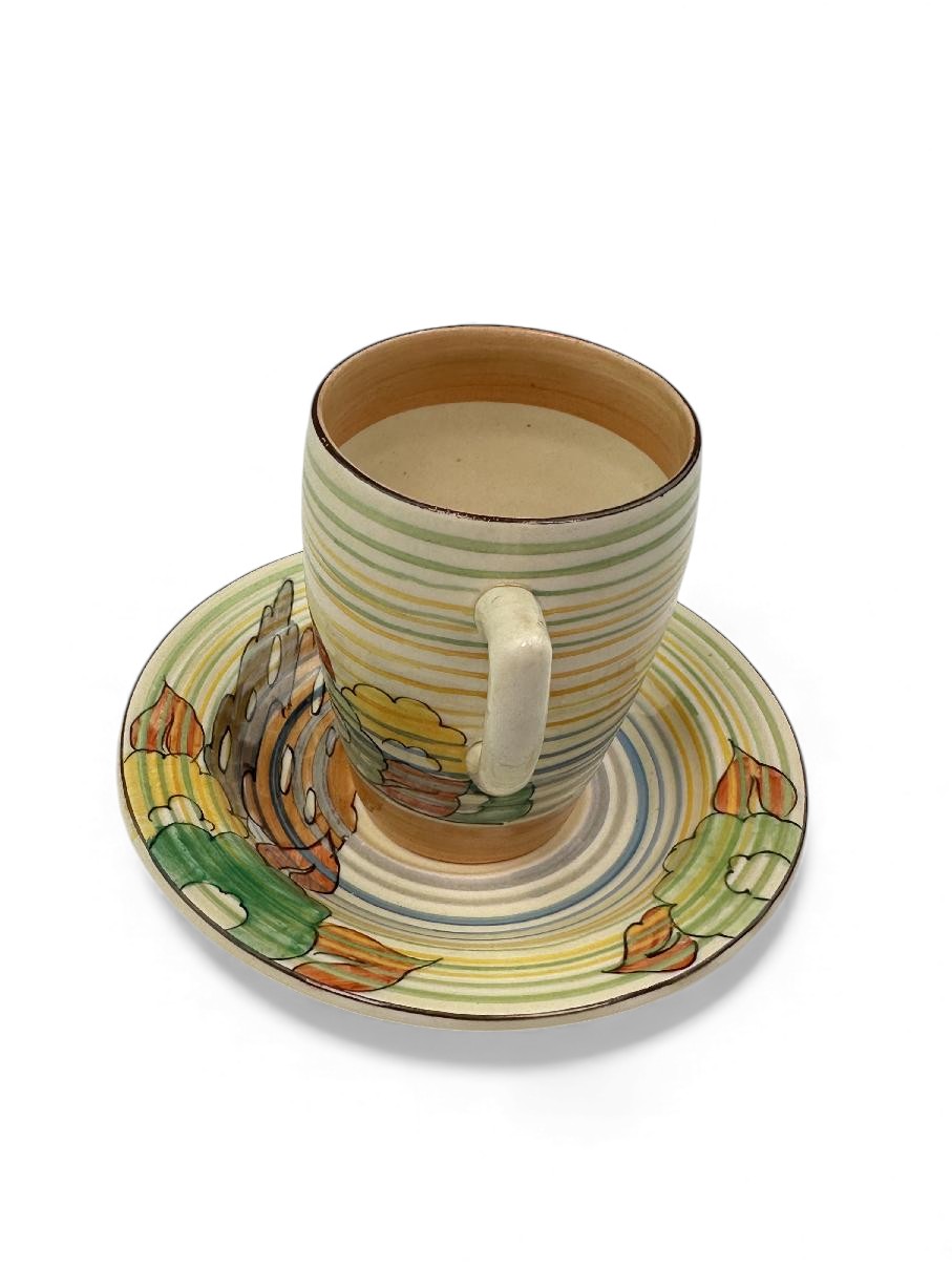 This is a lovely coffee cup & saucer, decorated with one of Clarice’s later, but still attractive, landscape patterns. Fully decorated saucer.