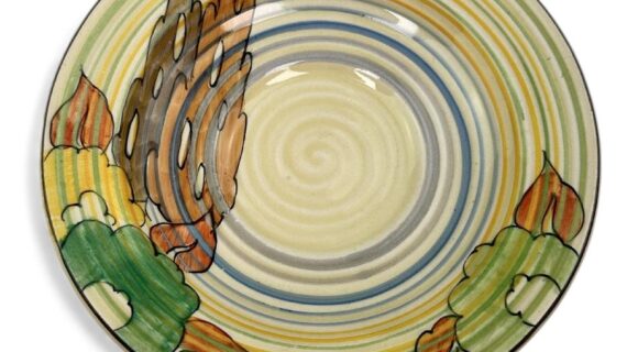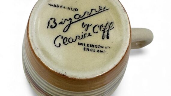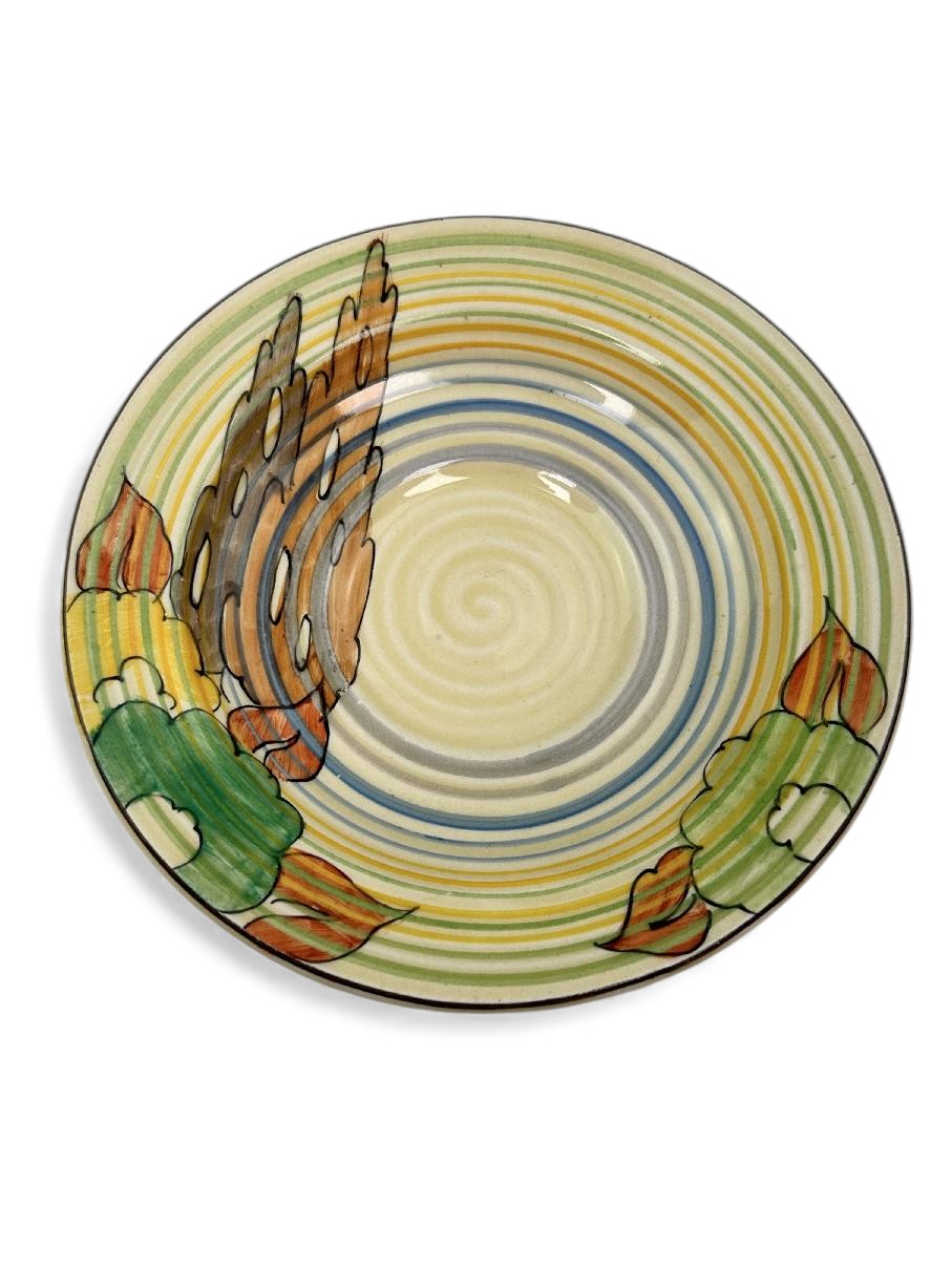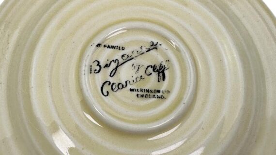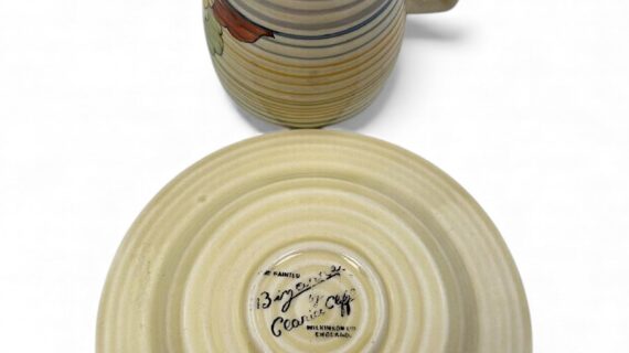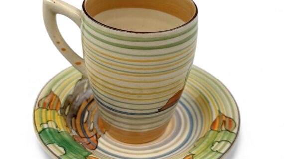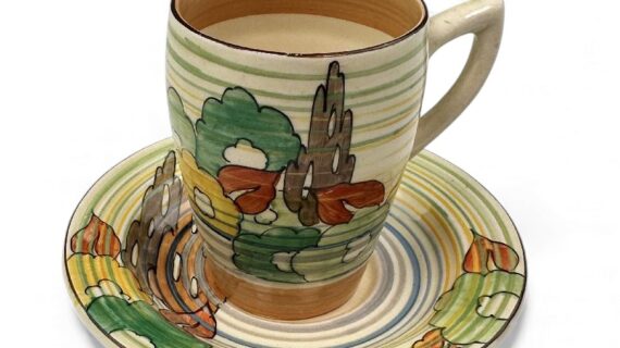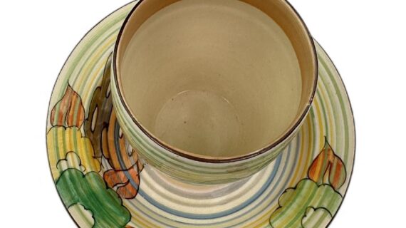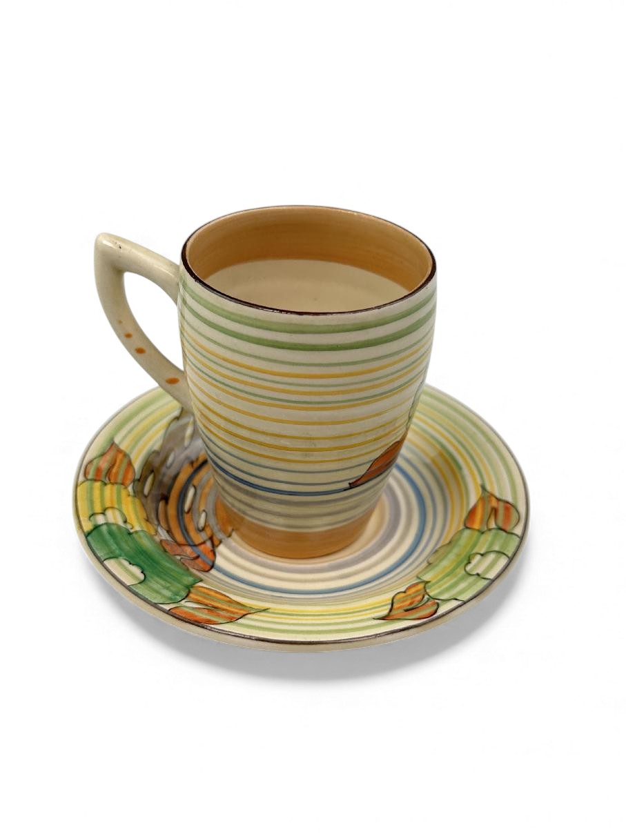 This is a lovely coffee cup & saucer, decorated with one of Clarice’s later, but still attractive, landscape patterns. Fully decorated saucer.