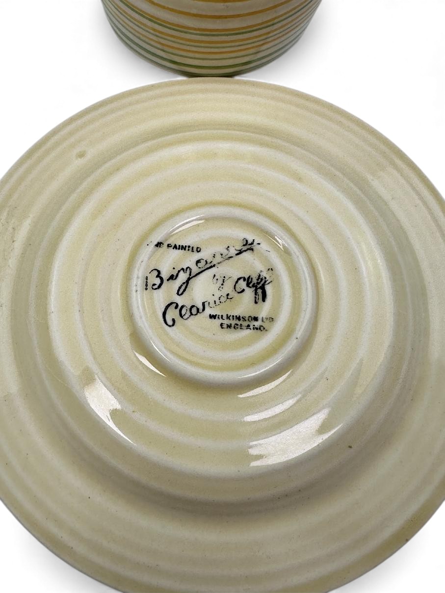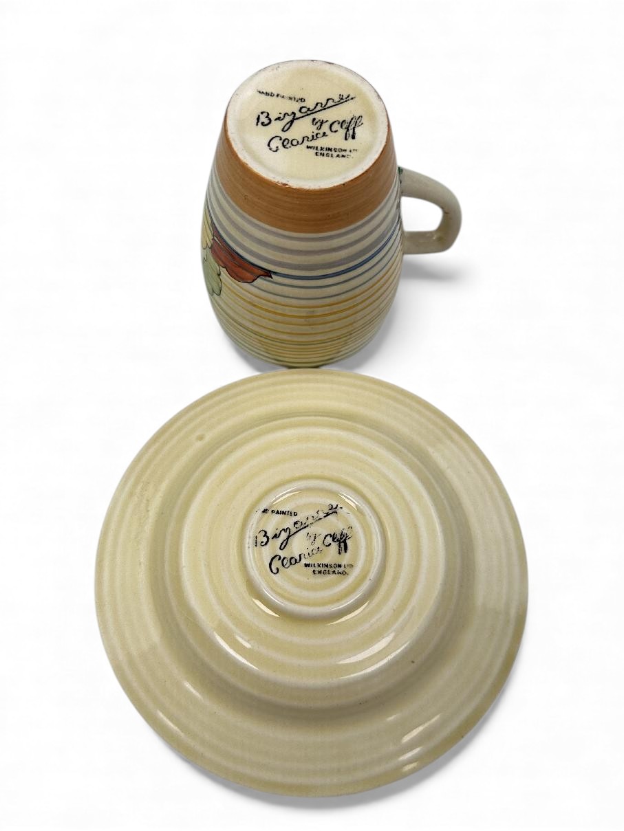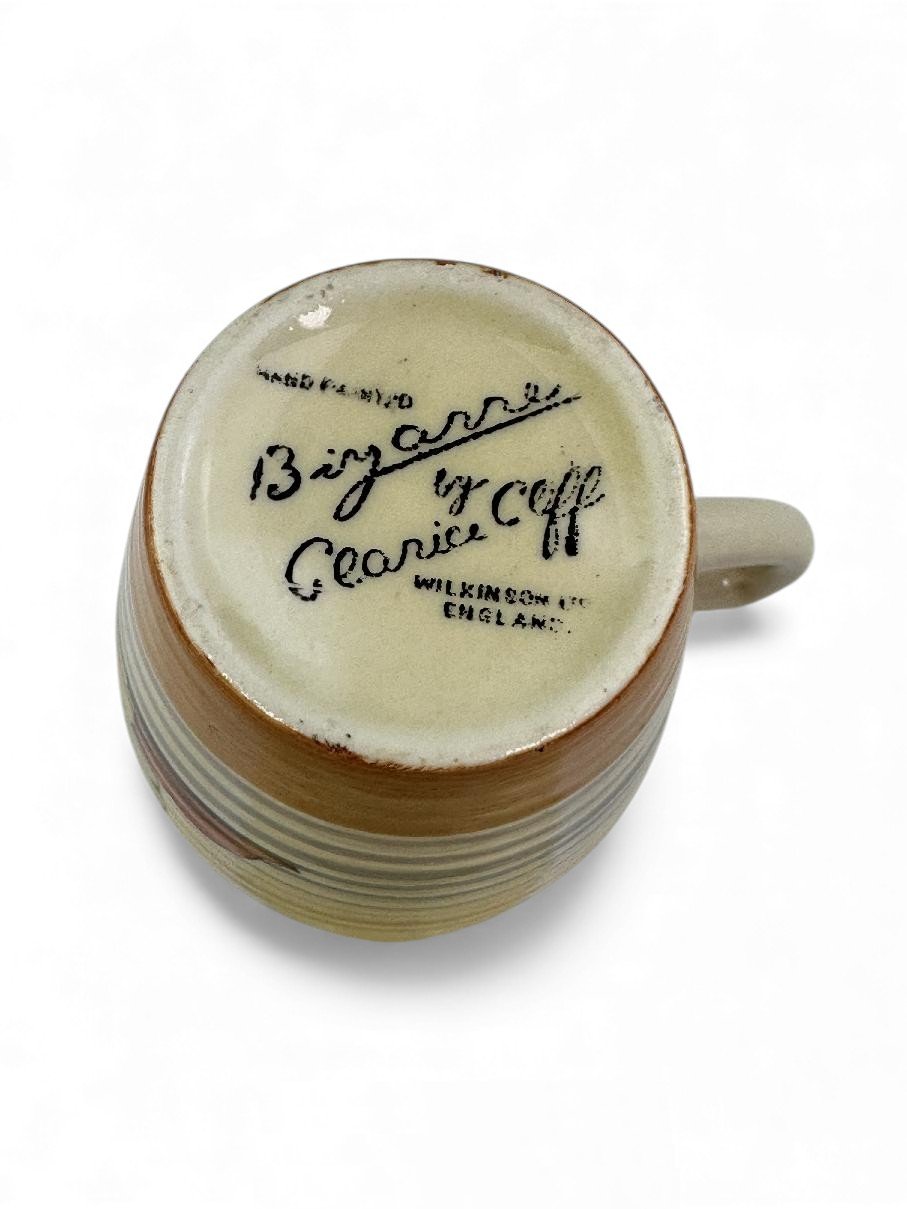 Stamped Bizarre by Clarice Cliff to the bases of both the cup & the saucer.