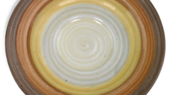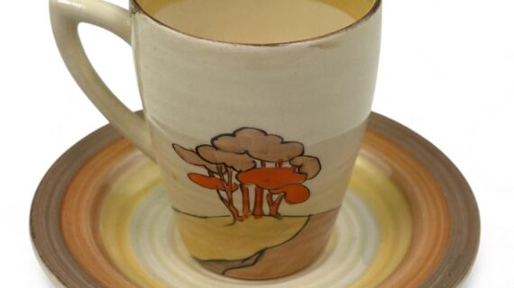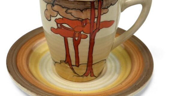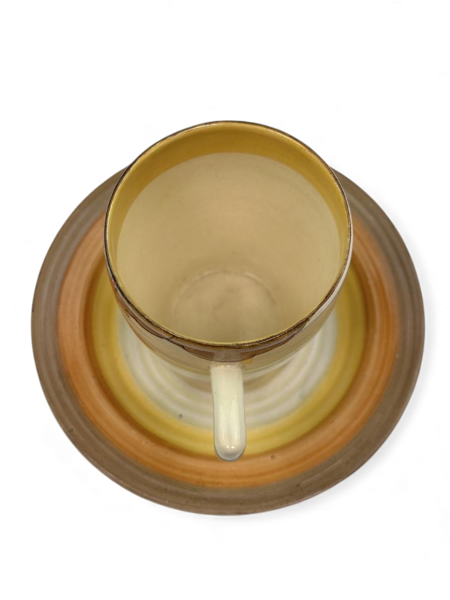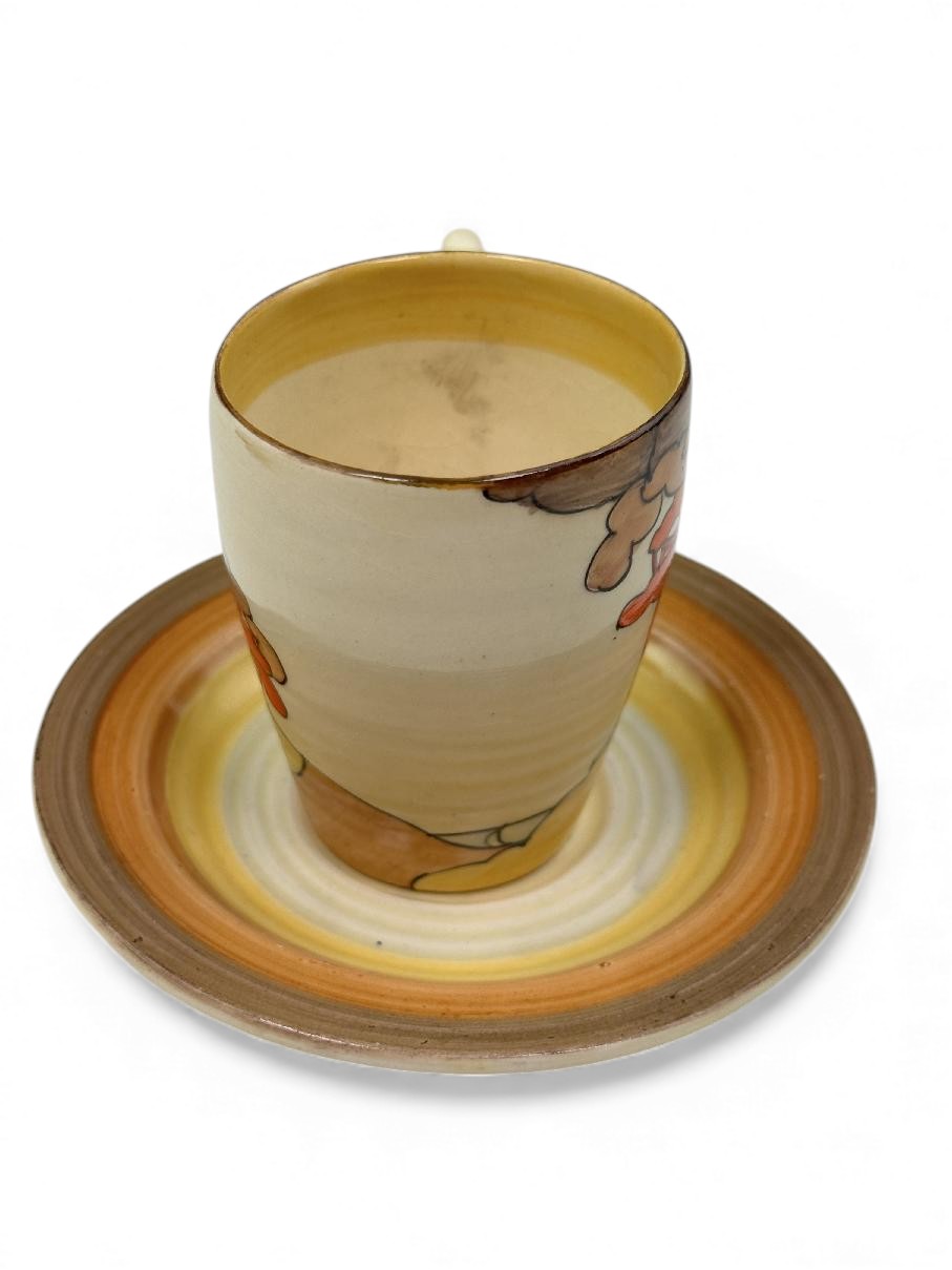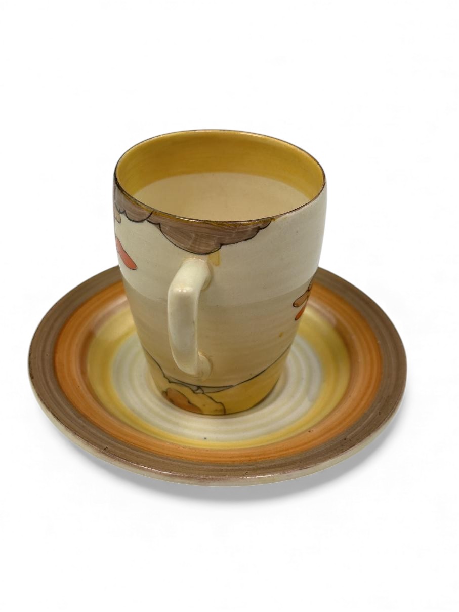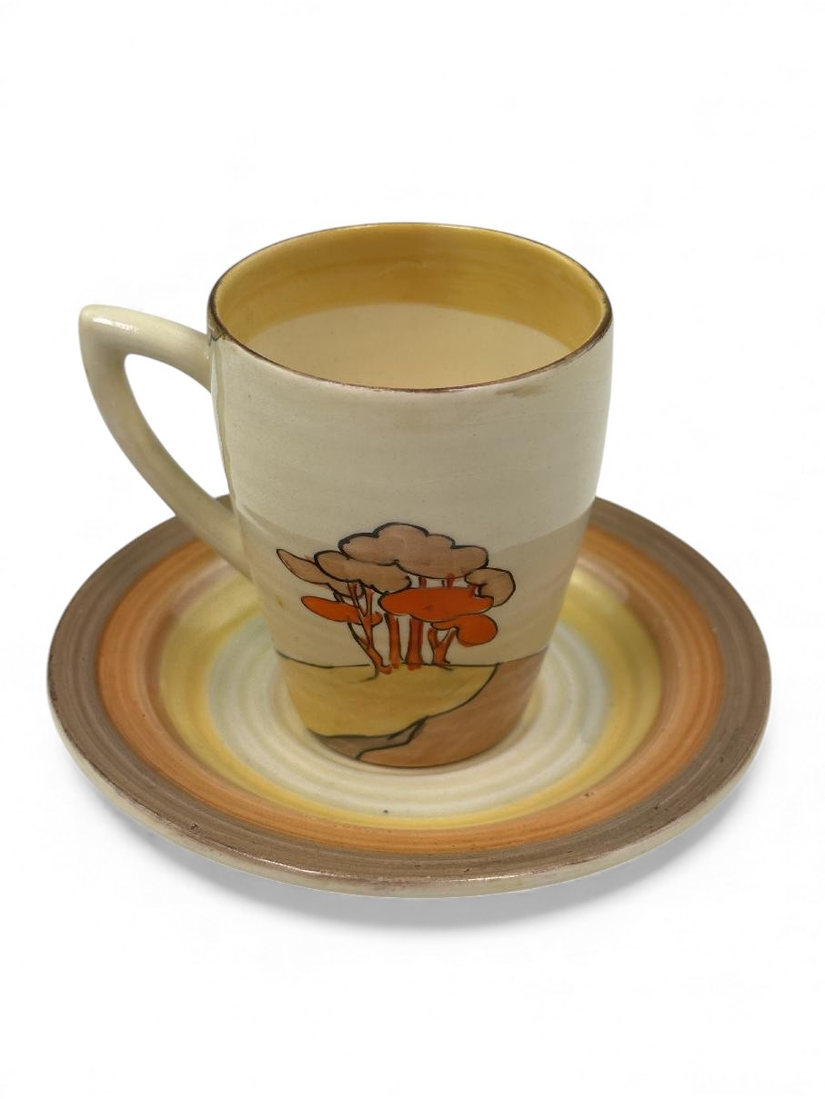 Clarice Cliff – Coral Firs – A Lynton shape coffee can and saucer circa 1933, hand painted with a stylised costal tree-lined landscape in tonal red with matched tonal brown and yellow plus appropriate banding.