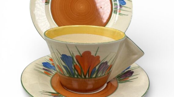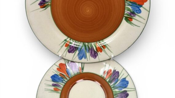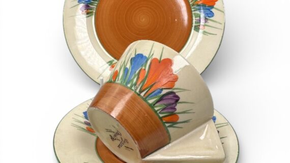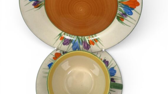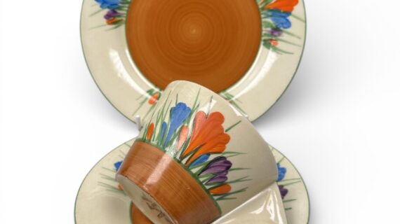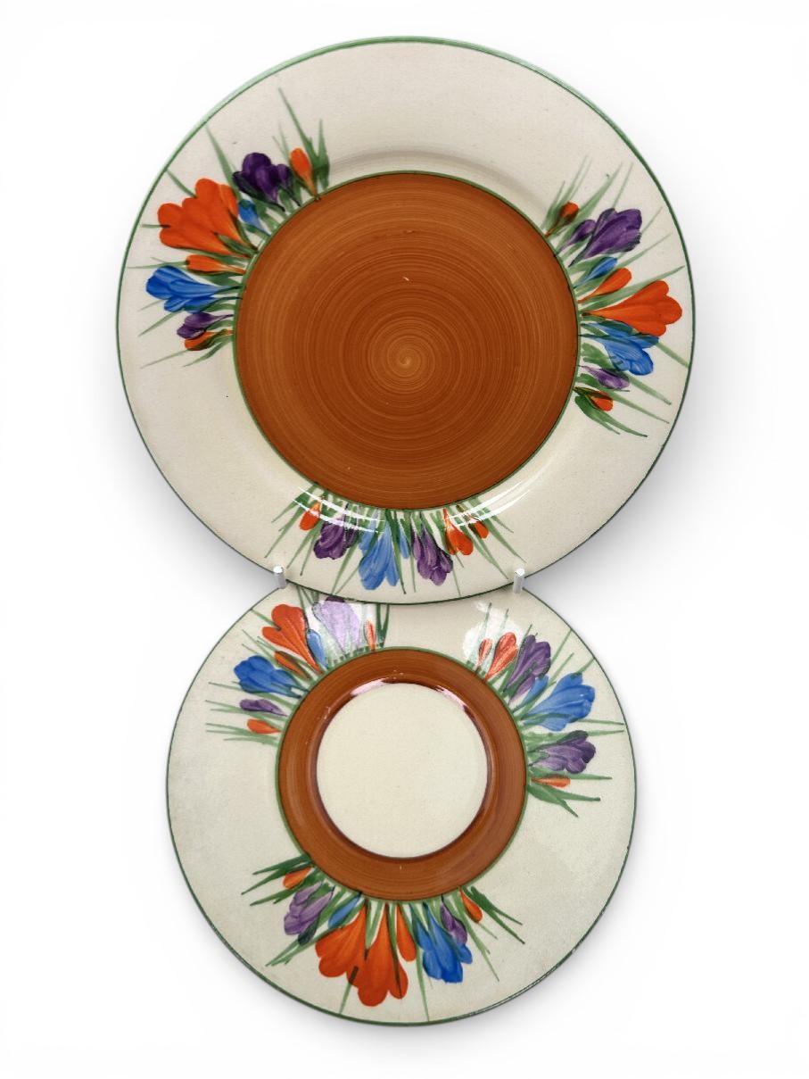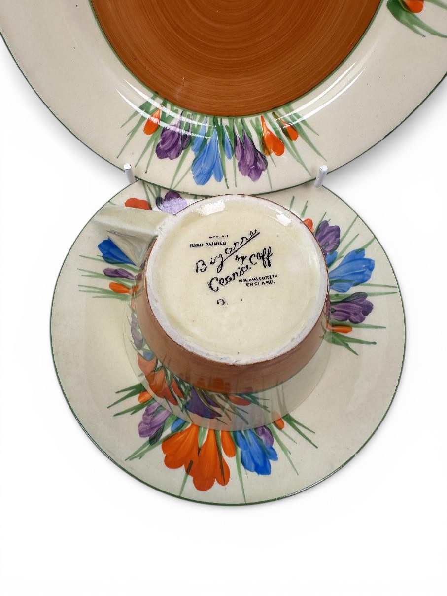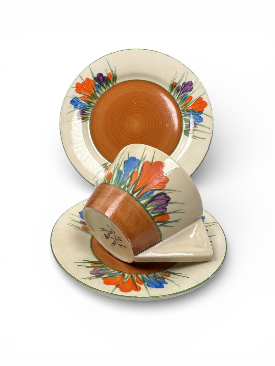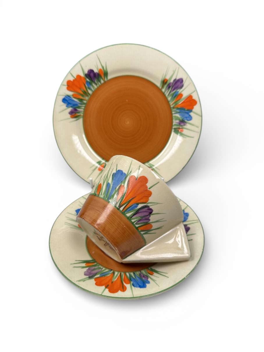Clarice Cliff CROCUS pattern conical shape trio (cup, saucer & plate).