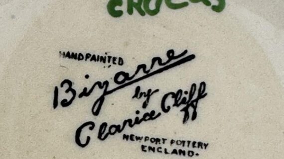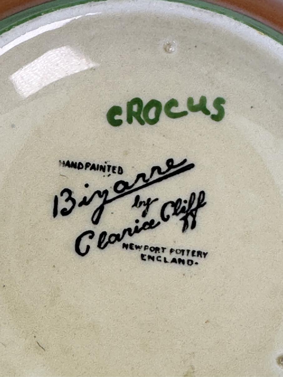 Stamped Bizarre by Clarice Cliff to the base plus a handrwitten pattern name in green.