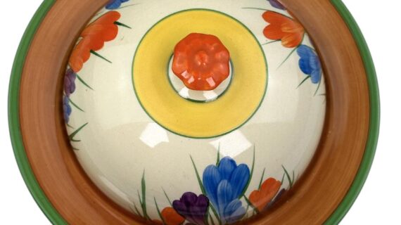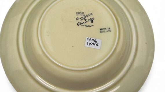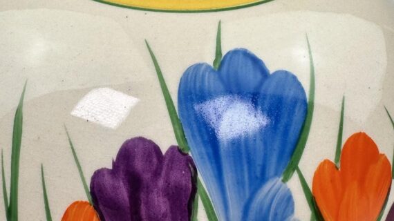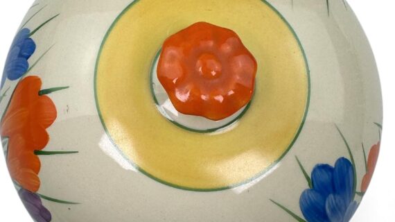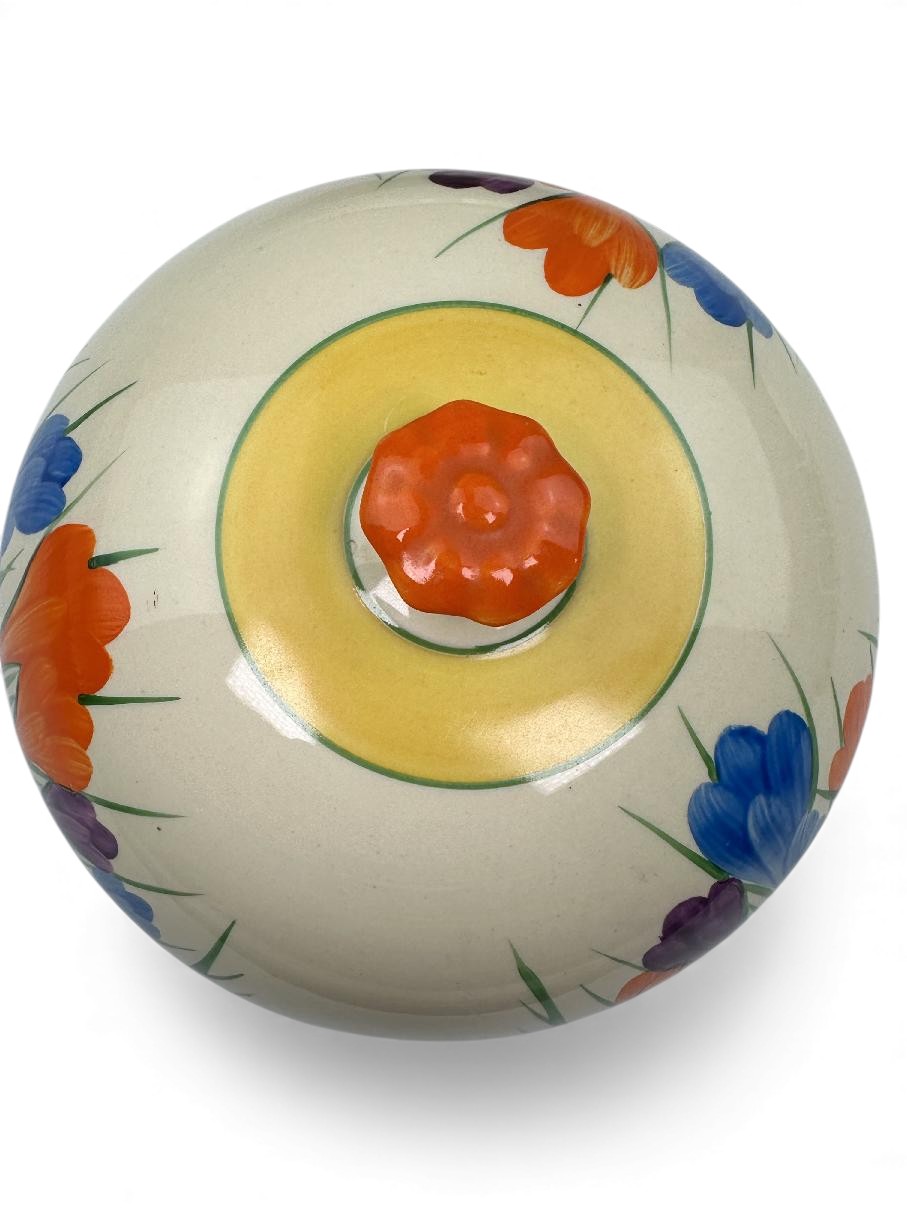 Very nicely and expertly hand-painted with huge Crocus flowers right around the lid. This is one of Clarice’s signature patterns and you can certainly see why!