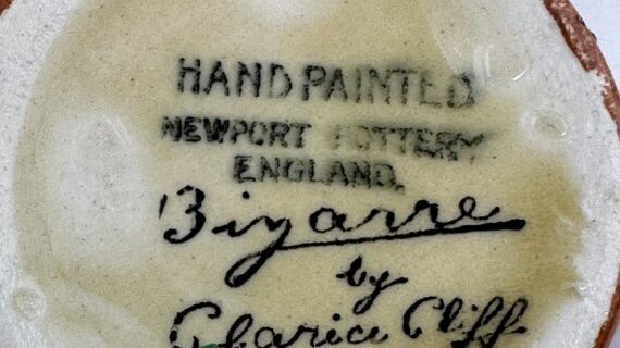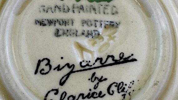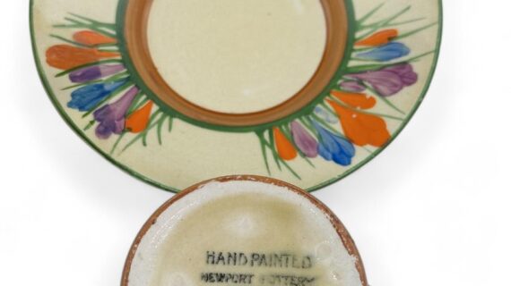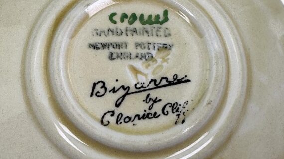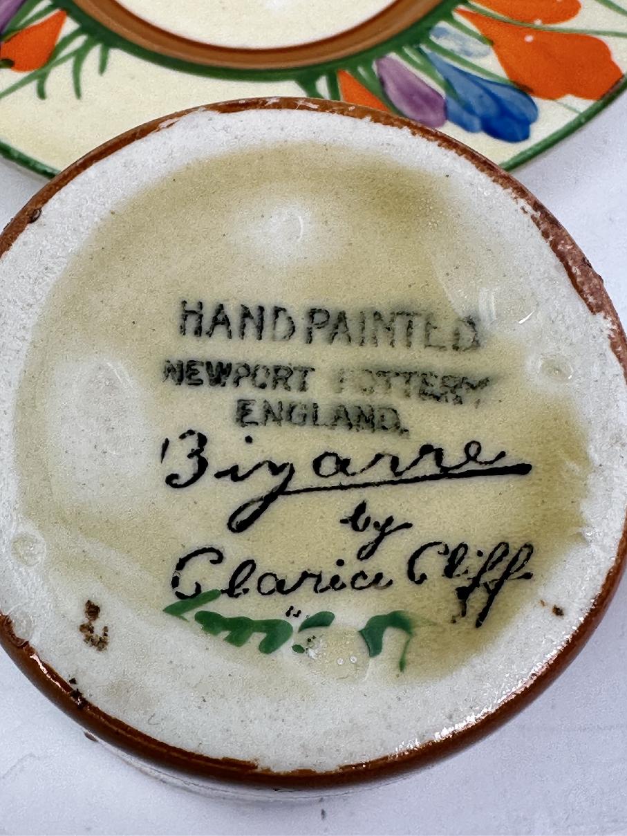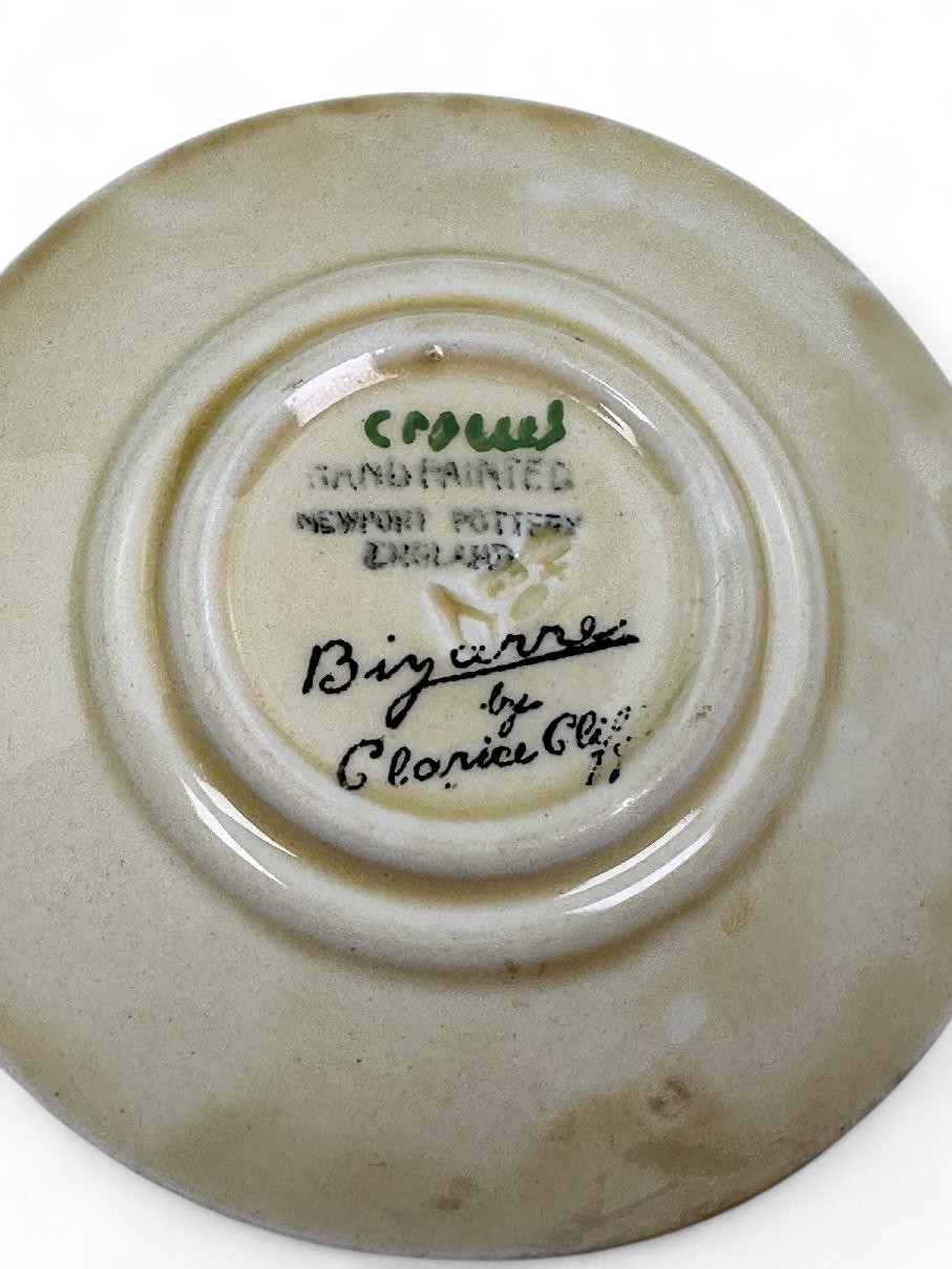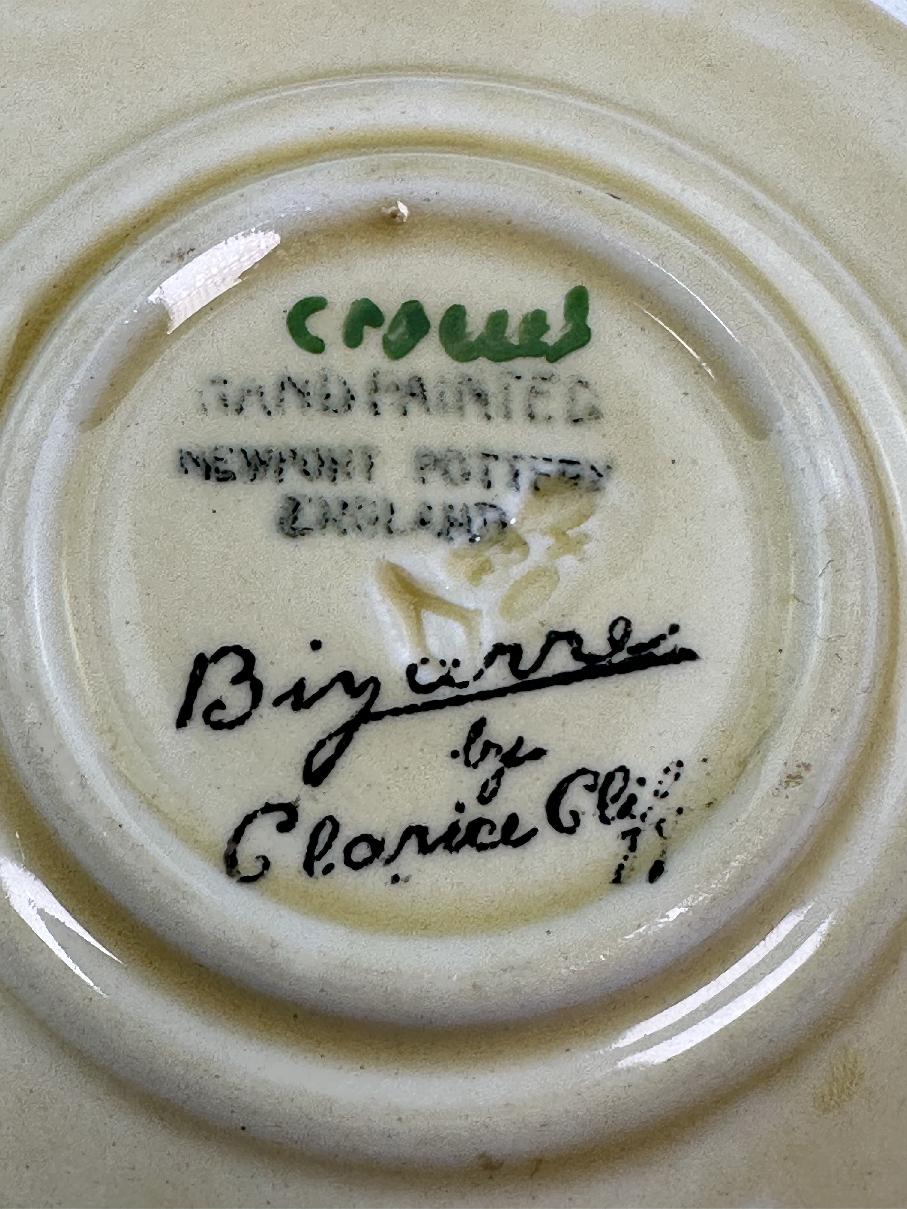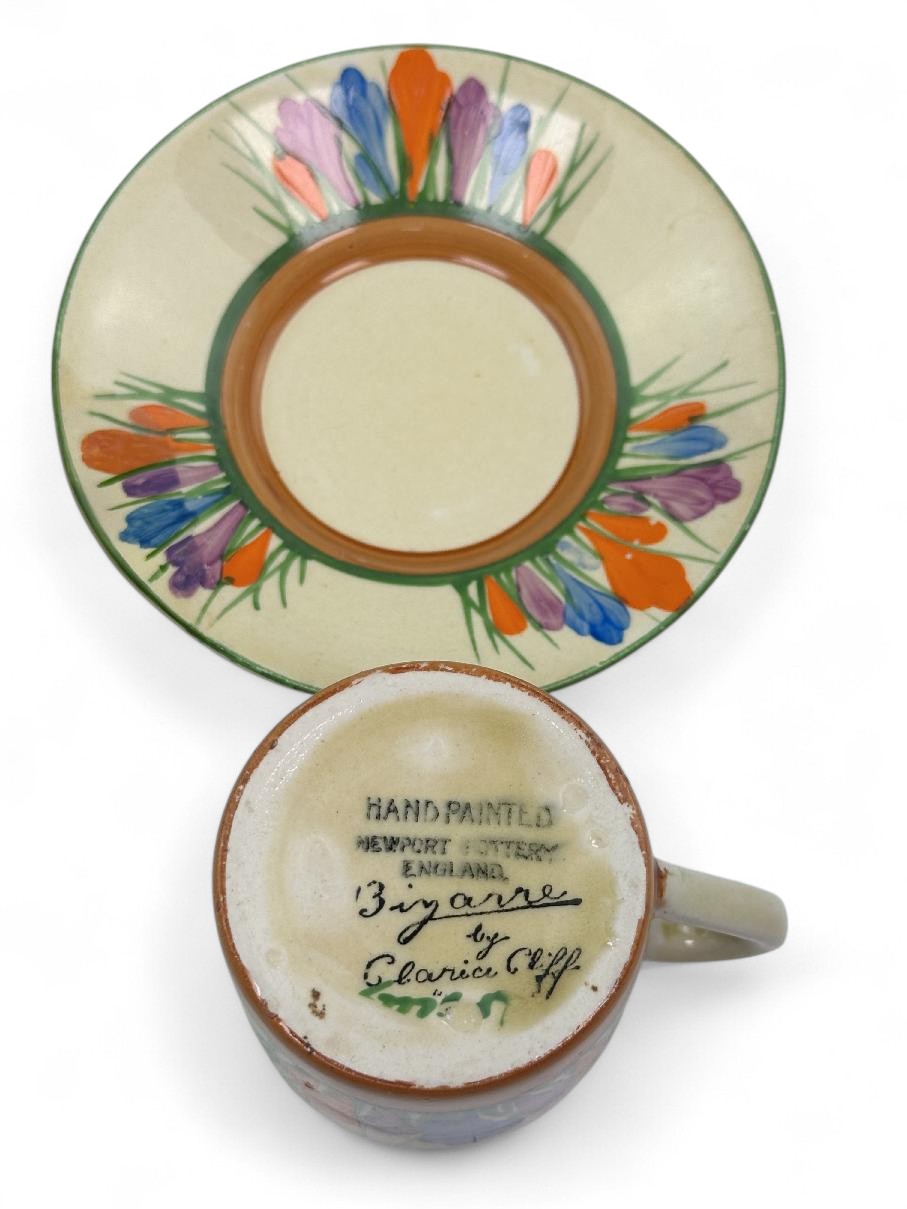 Both pieces are stamped Bizarre by Clarice Cliff and have the hand-painted CROCUS pattern name in green. The saucer has a date stamp for 1930.