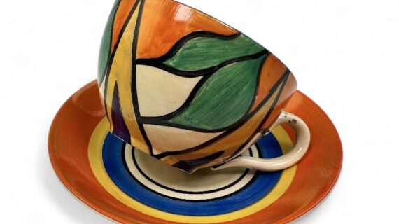 Clarice Cliff DOUBLE-V pattern globe shape cup and saucer.