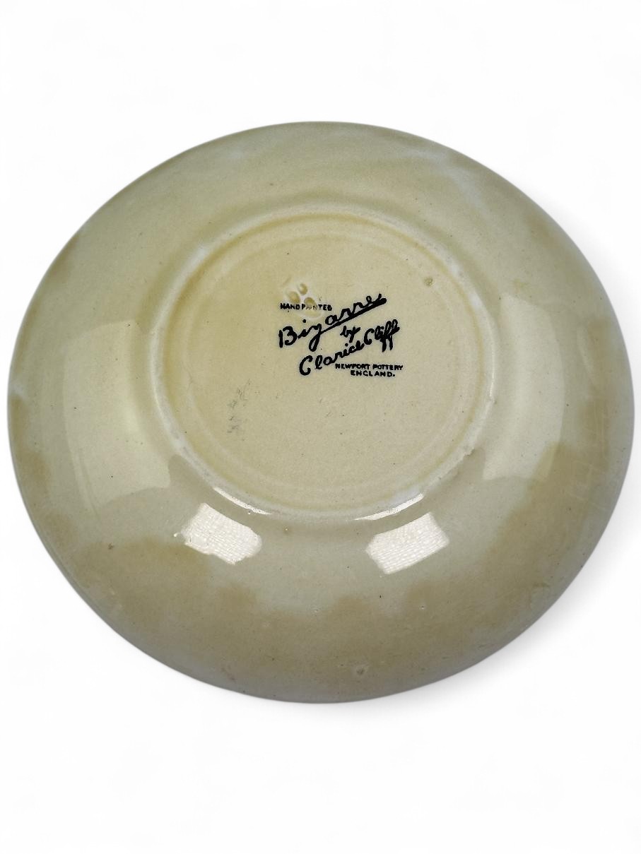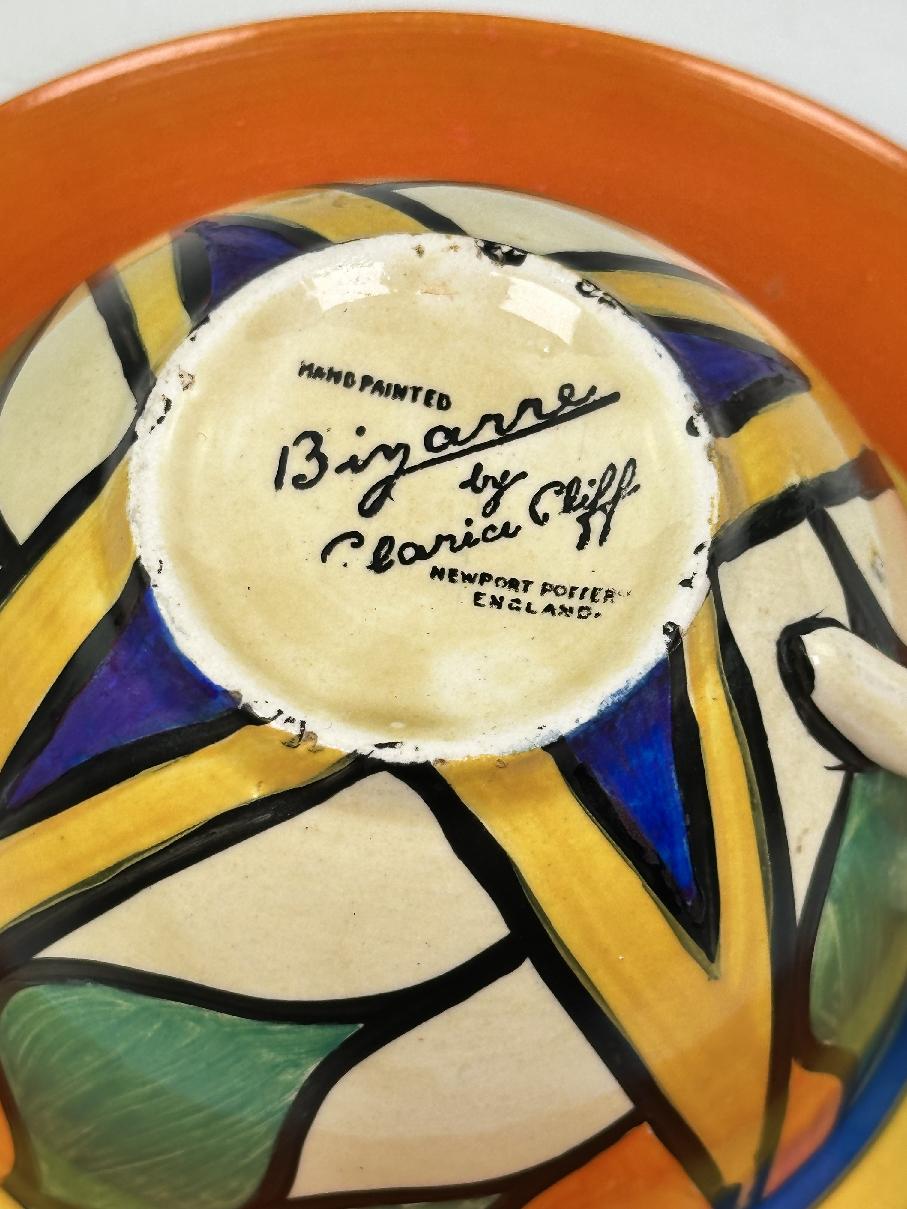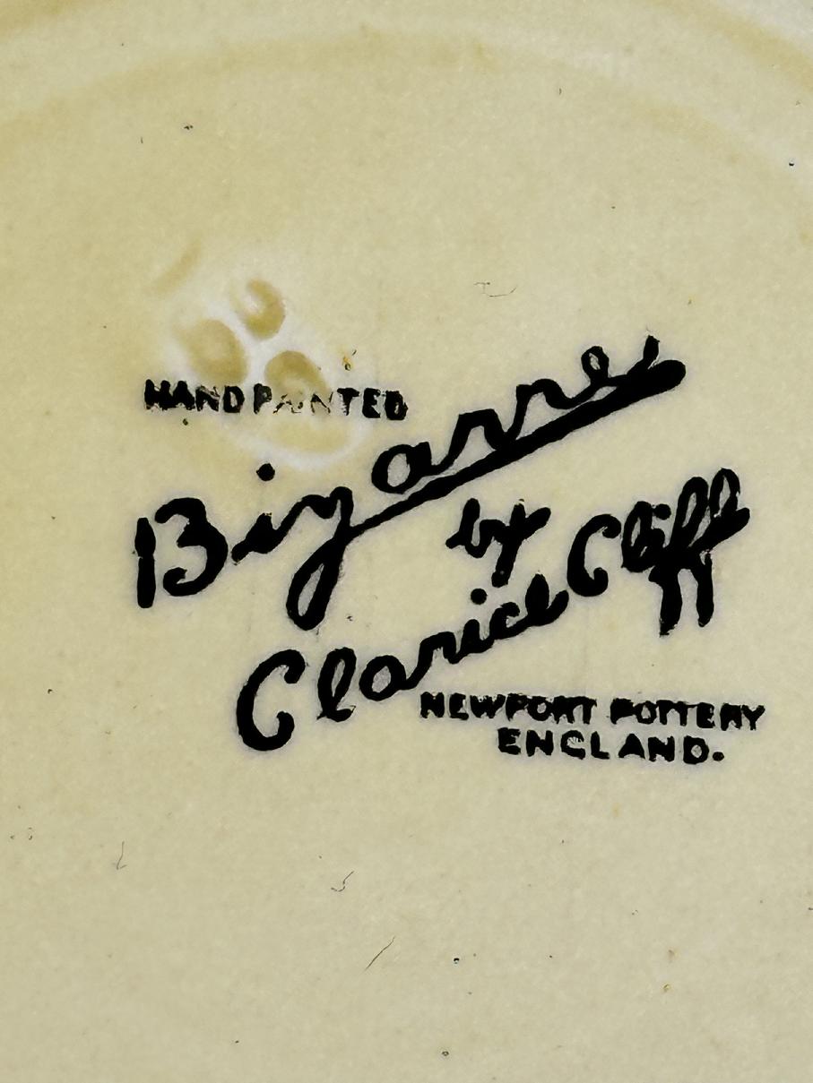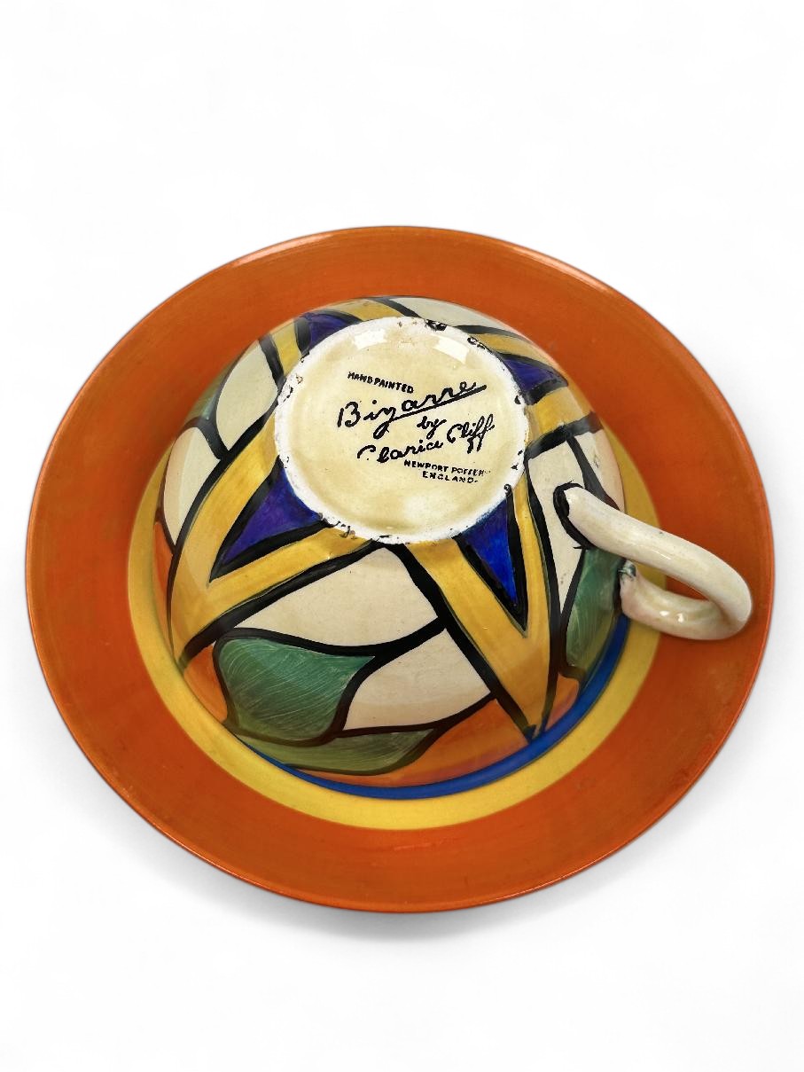 Stamped Bizarre by Clarice Cliff to the bases of both pieces. Also has an impressed date mark for 1929 on the base of the saucer (indistinct).