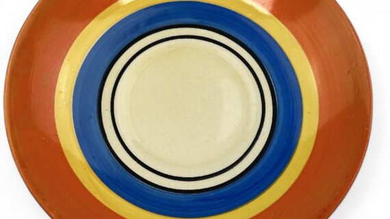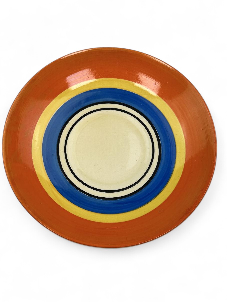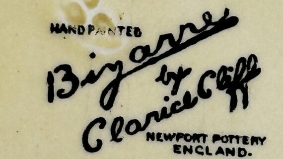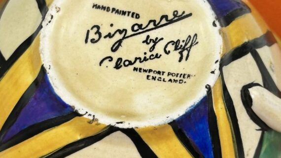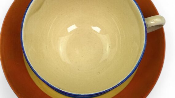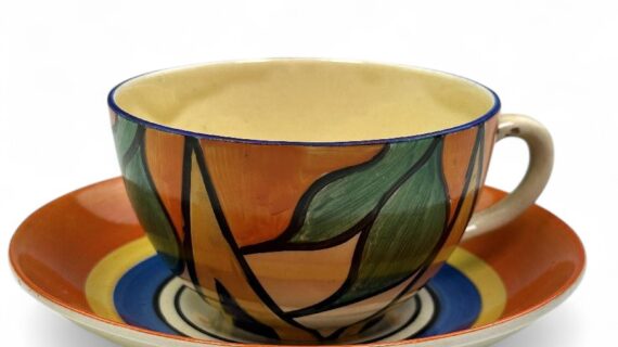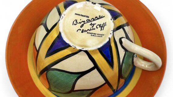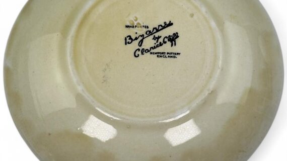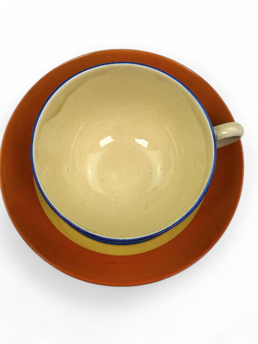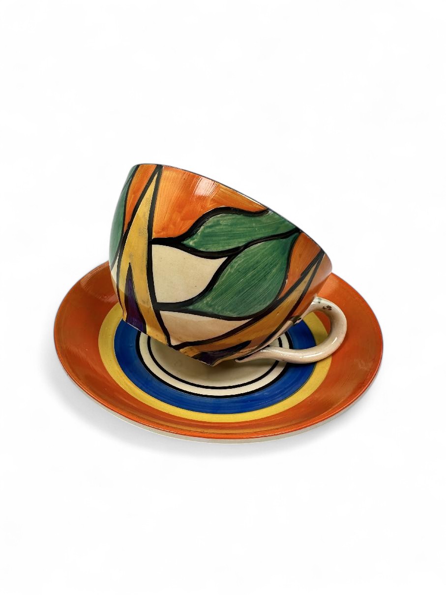 Stamped Bizarre by Clarice Cliff to the bases of both pieces. Also has an impressed date mark for 1929 on the base of the saucer (indistinct).