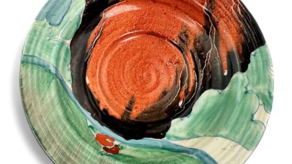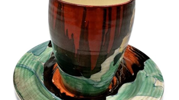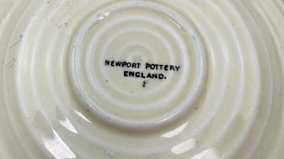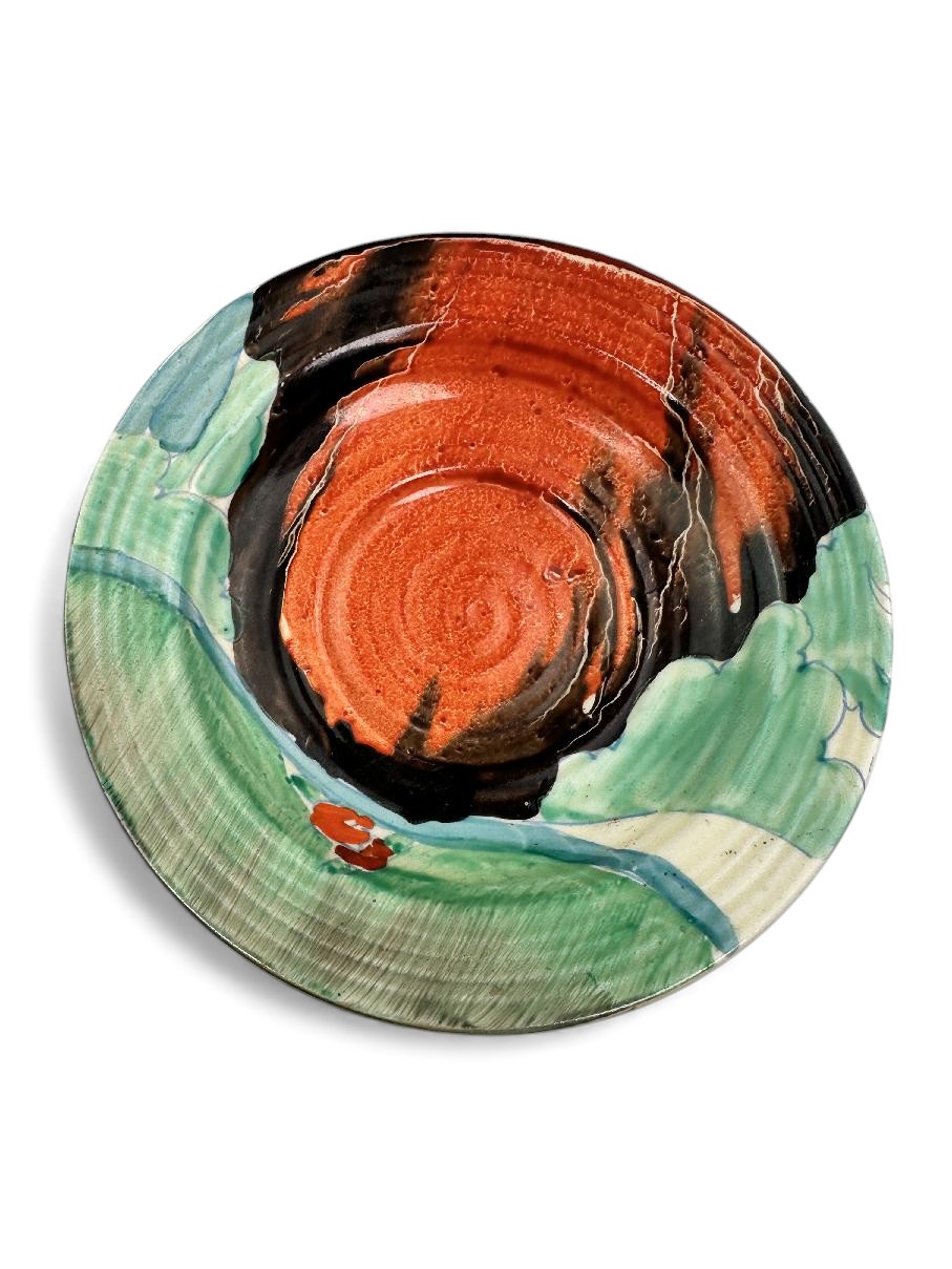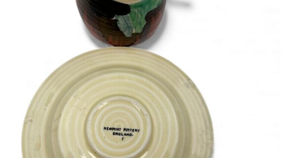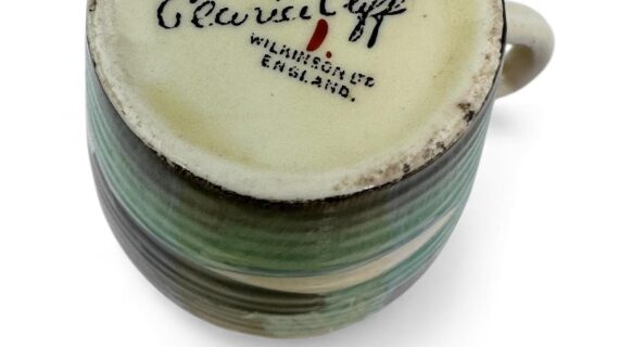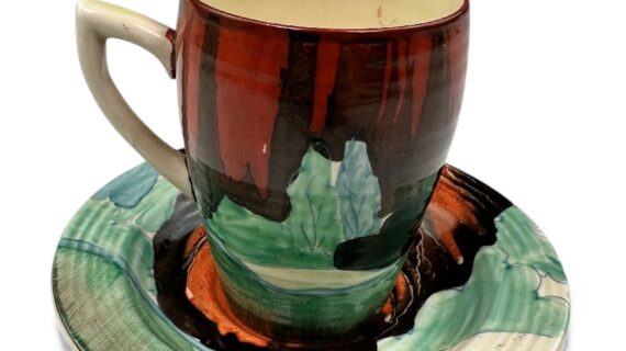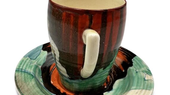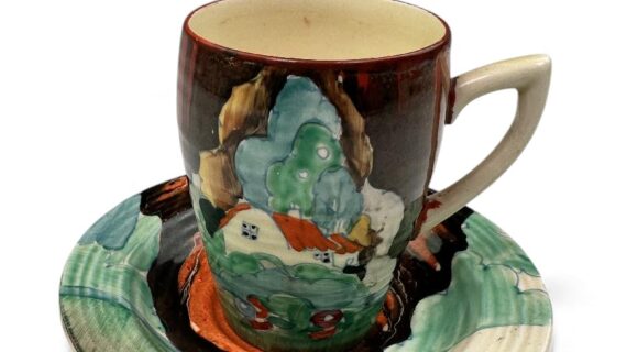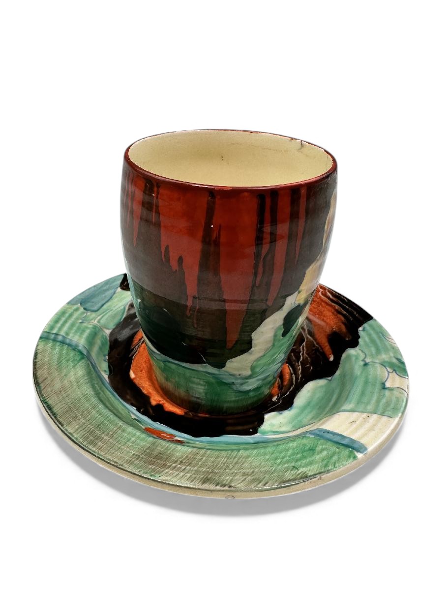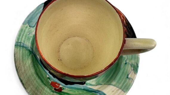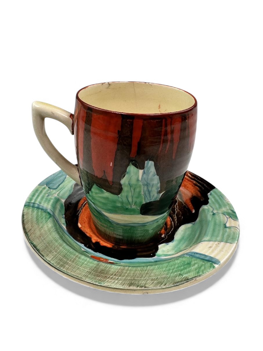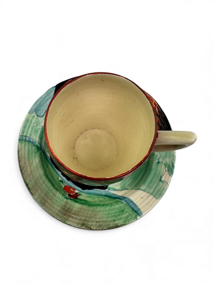 This is a lovely coffee cup & saucer, decorated with one of Clarice’s later, but still attractive, landscape patterns. Decorated saucer.