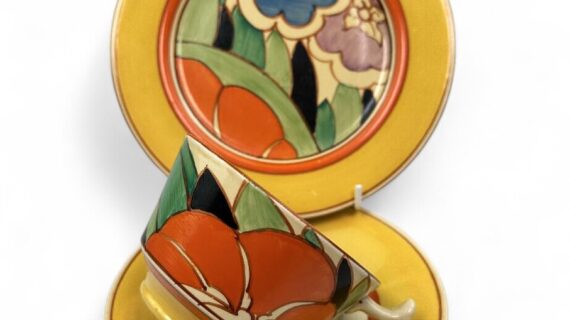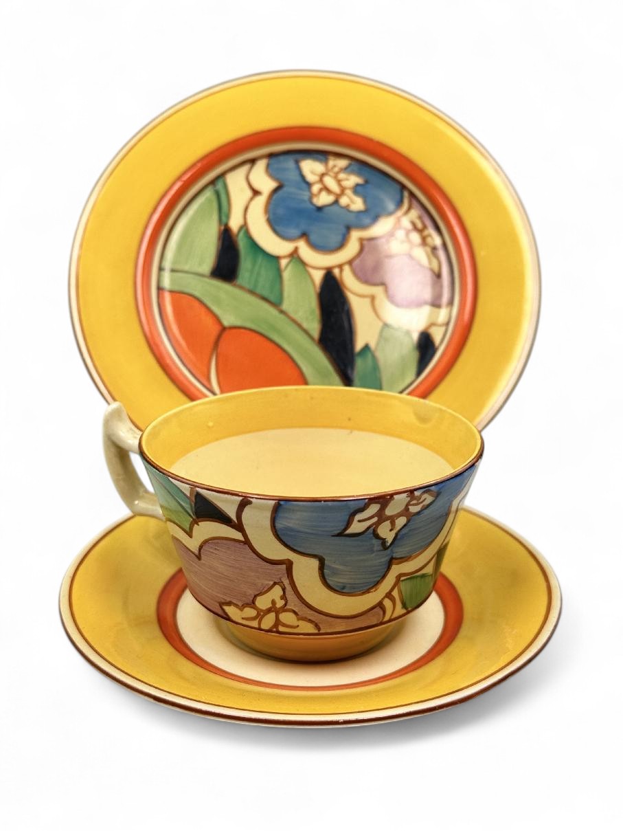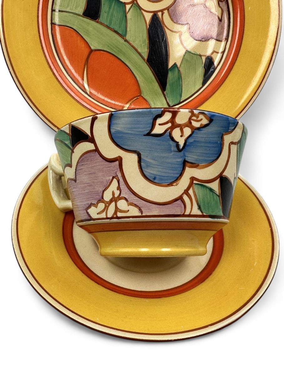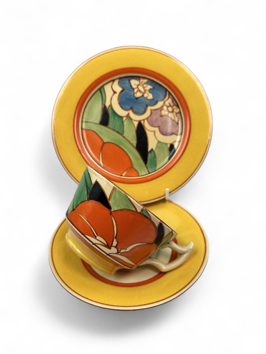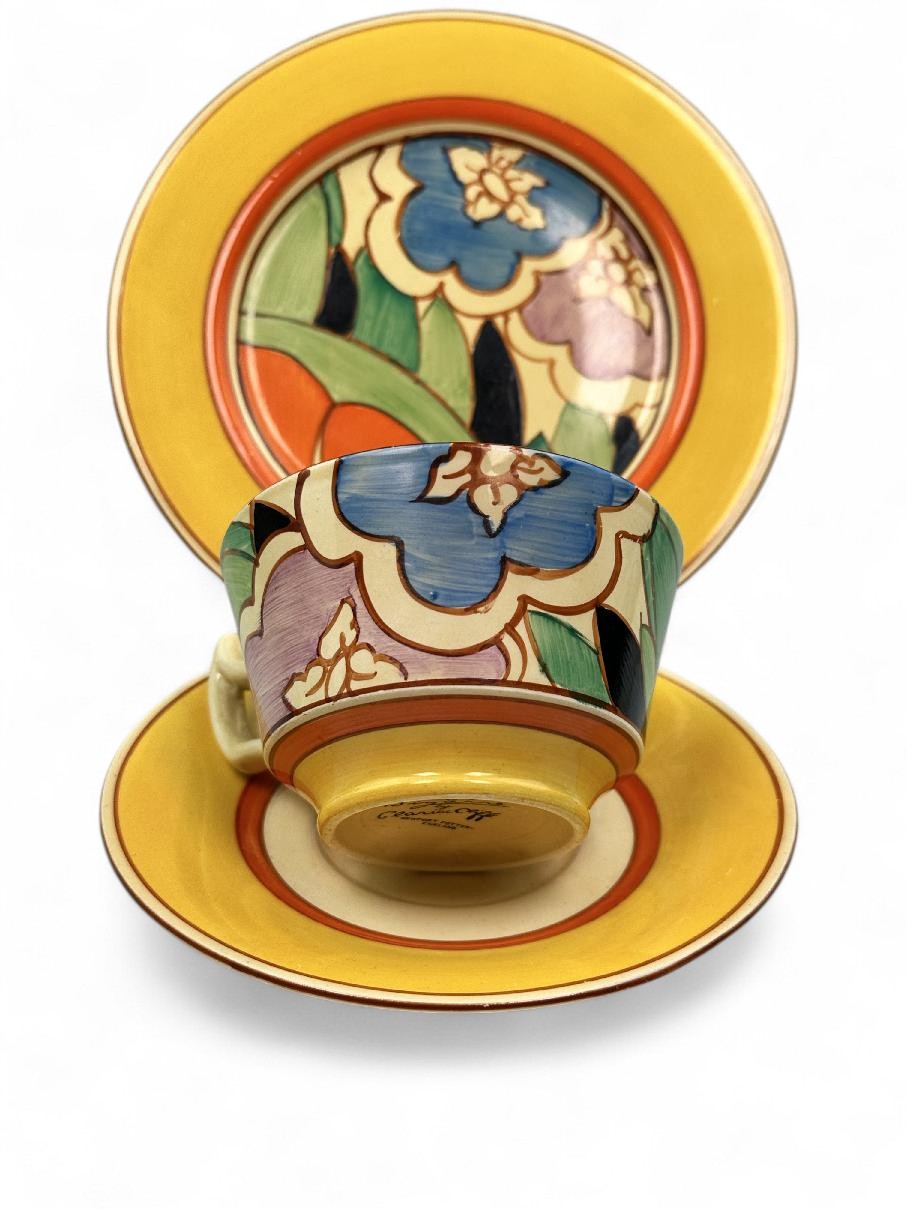 This is a lovely Clarice Cliff GARDENIA pattern Athens shape trio (cup, saucer & plate).