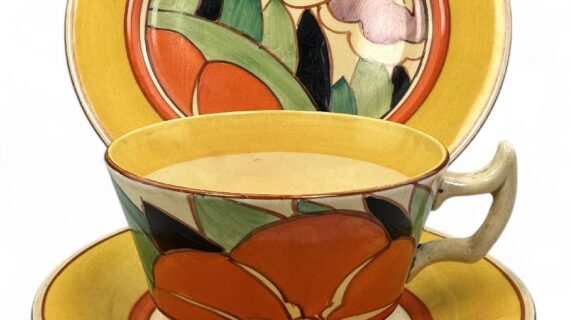 Strongly decorated to the cup and also the plate. Very eye-catching and bright.