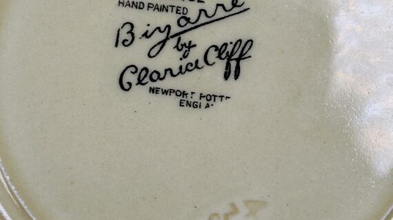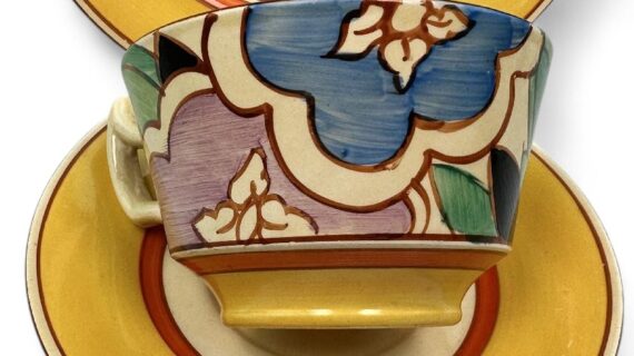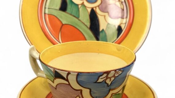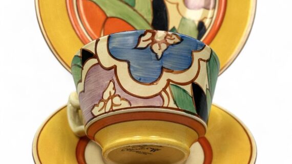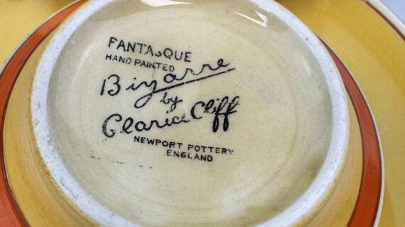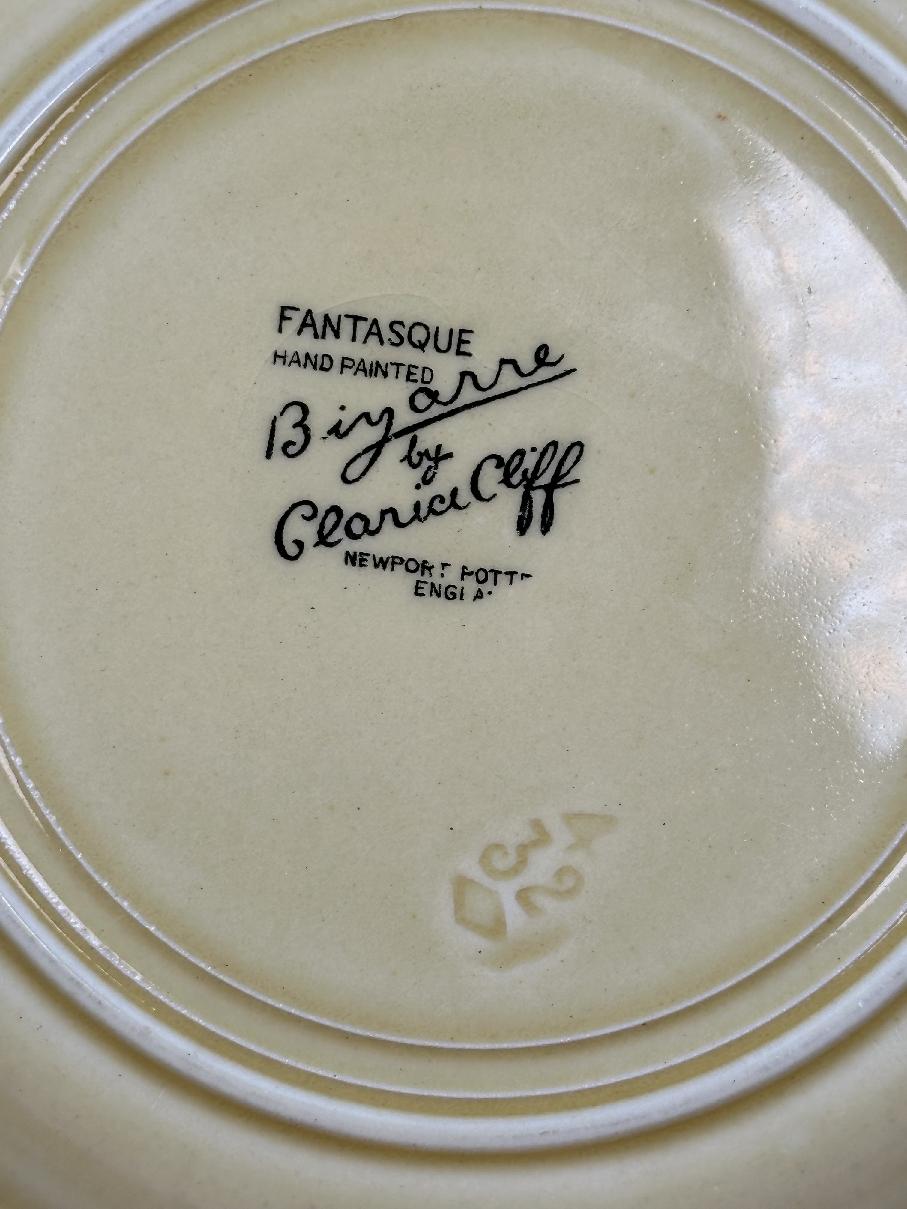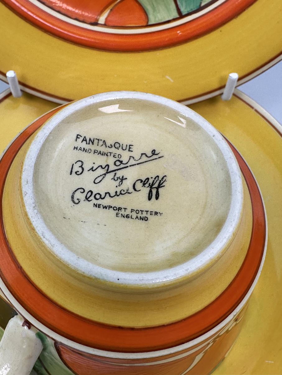 The cup, saucer and plate are all stamped FANTASQUE, Bizarre by Clarice Cliff to the base.