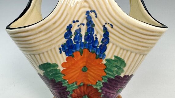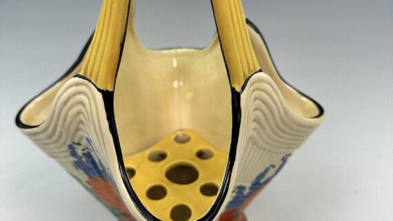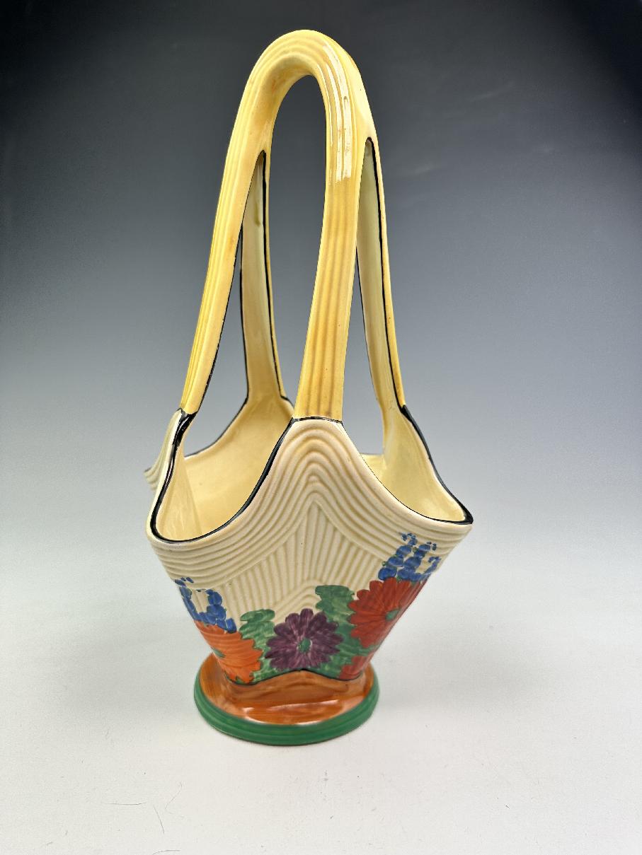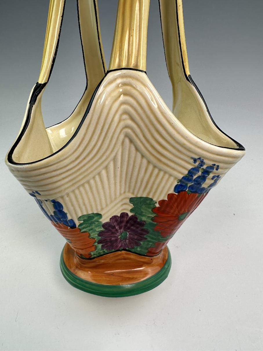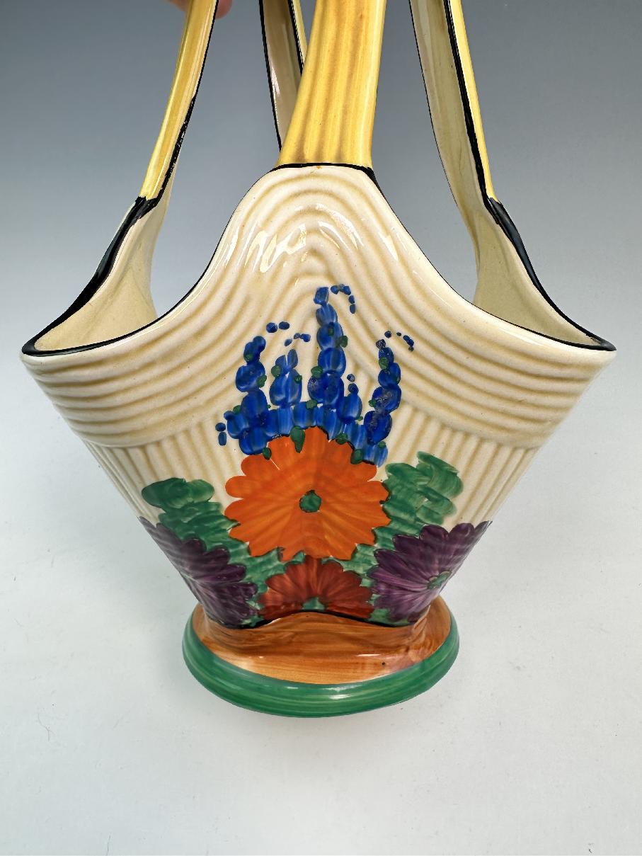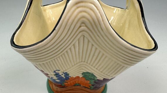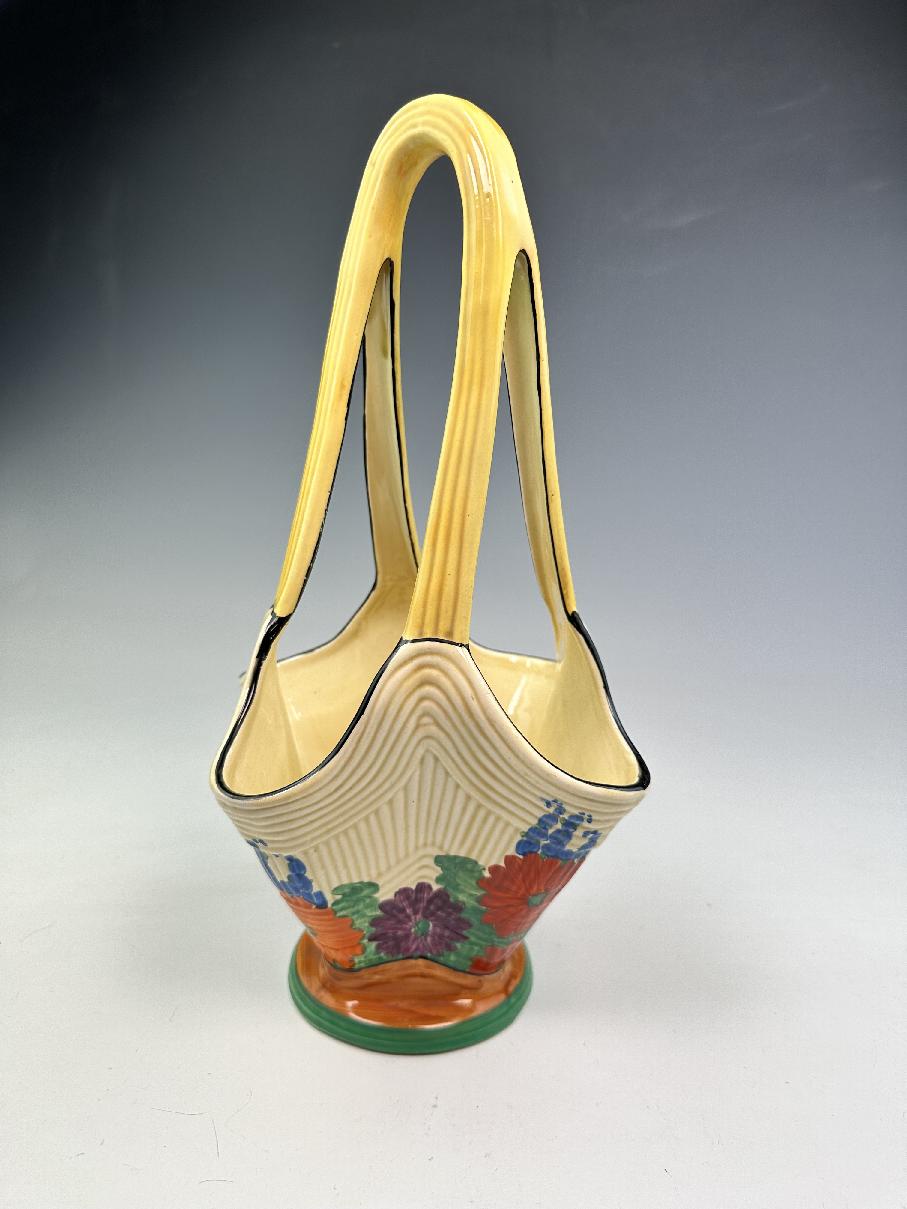 Hand painted with one of Clarice’s best known and popular patterns, which is expertly applied right around the body of the basket. This is a fairly rare shape which is not often seen. A must for any Gayday collector!