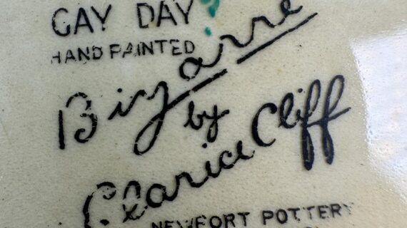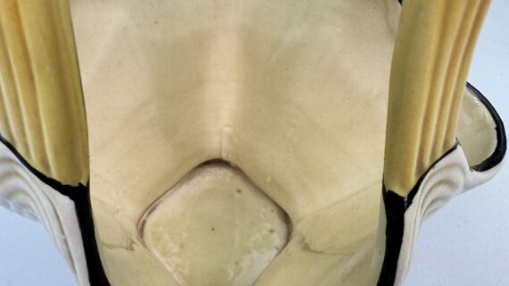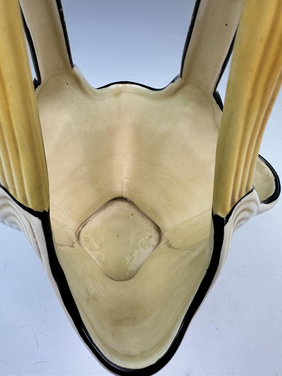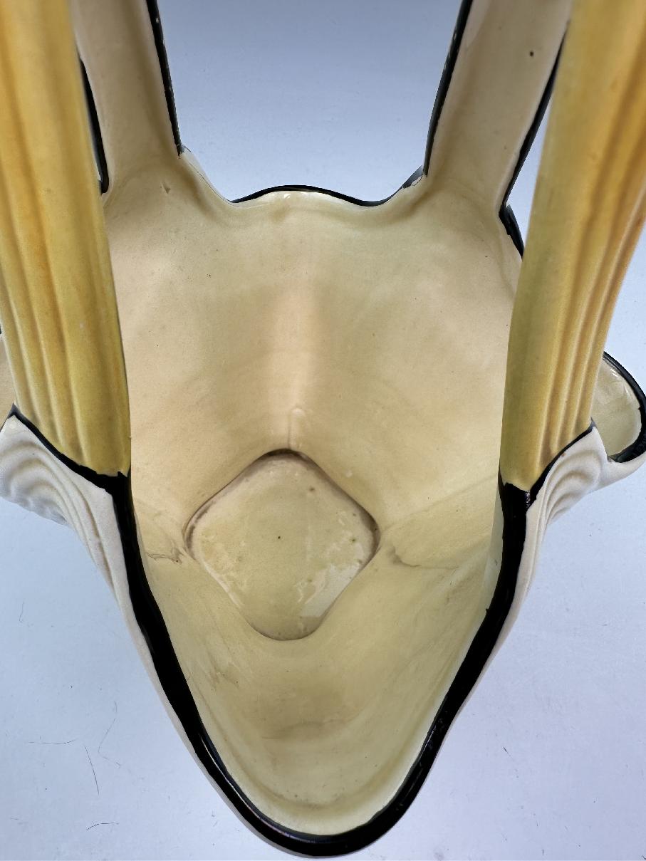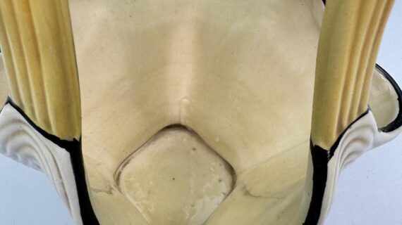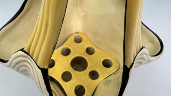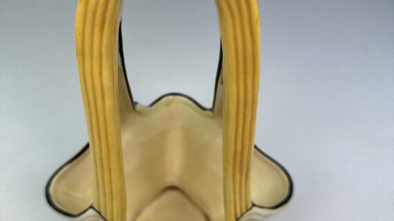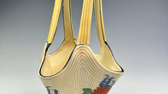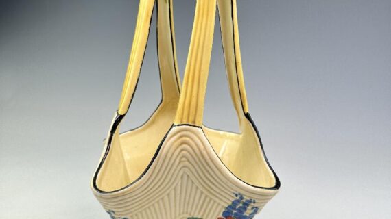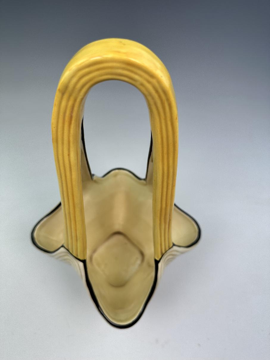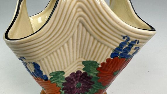 Hand painted with one of Clarice’s best known and popular patterns, which is expertly applied right around the body of the basket. This is a fairly rare shape which is not often seen. A must for any Gayday collector!