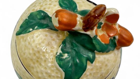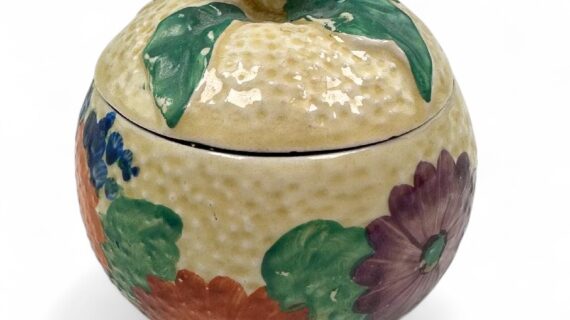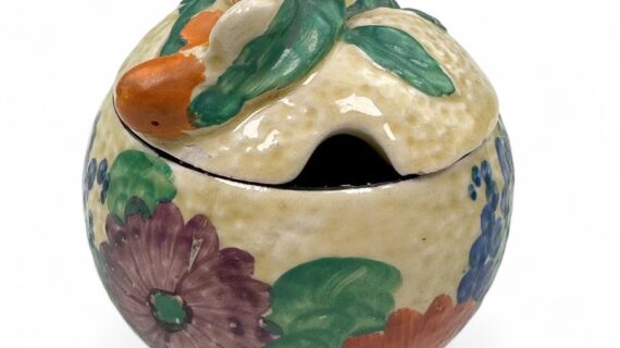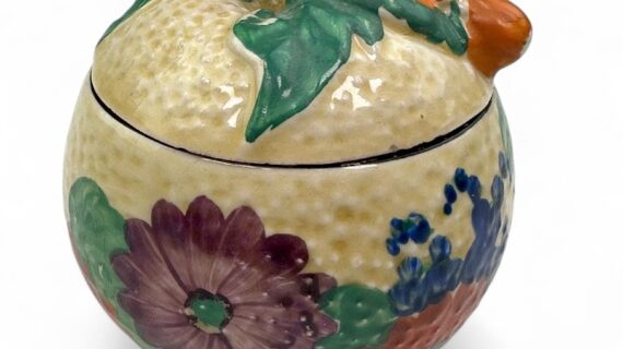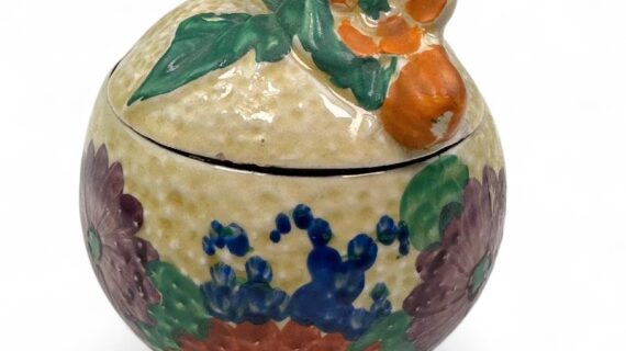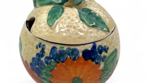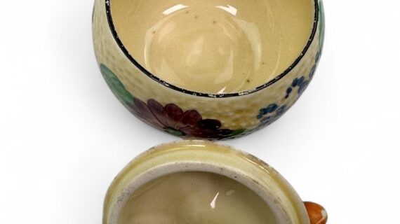 Very nicely hand painted in stylized purple, orange and red flowers. This is one of Clarice’s all-time popular patterns.