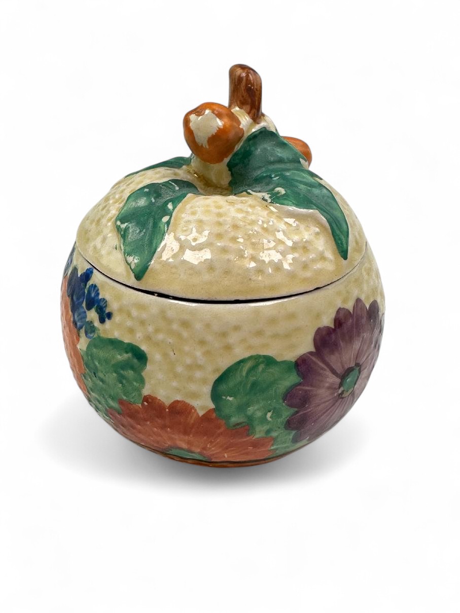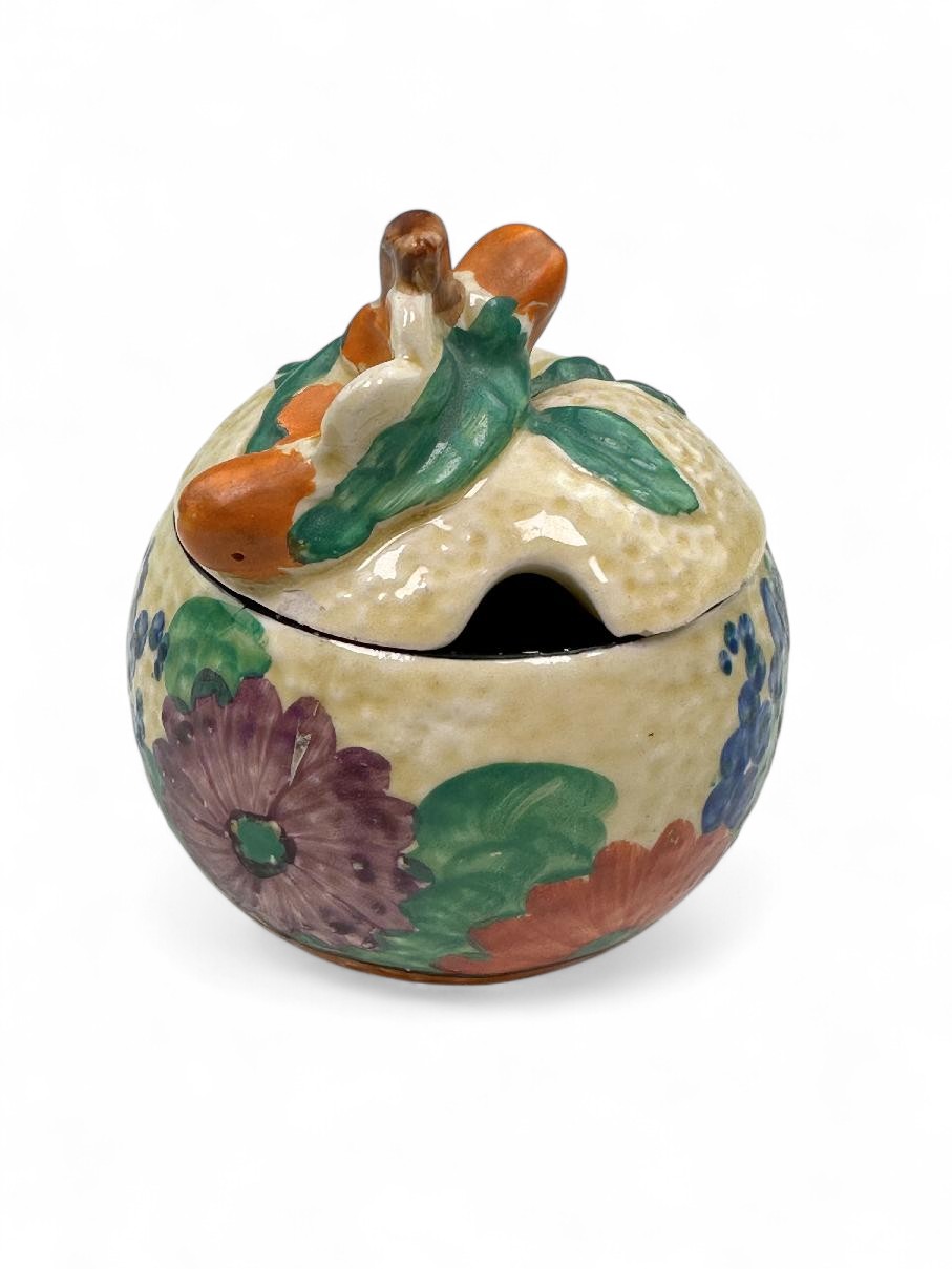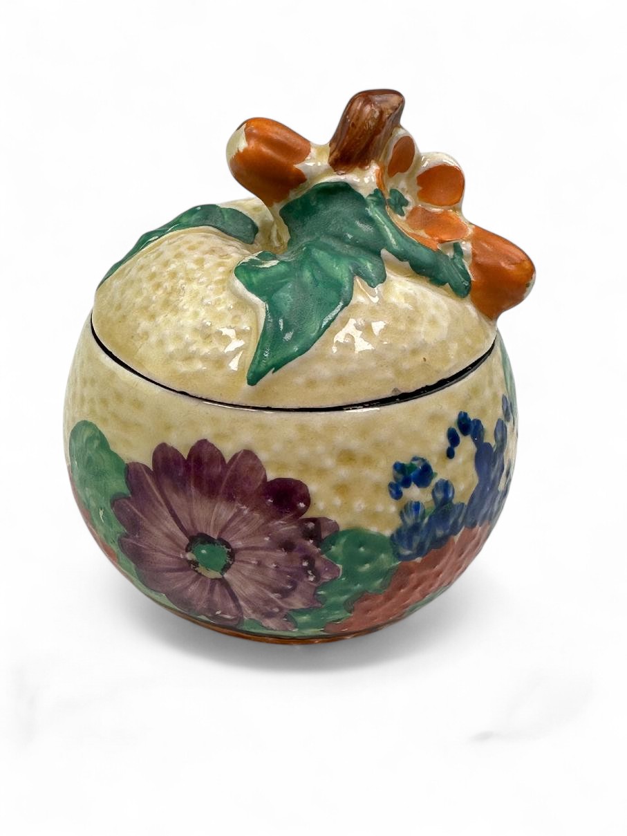 Clarice Cliff GAYDAY pattern small orange shape preserve pot and lid.