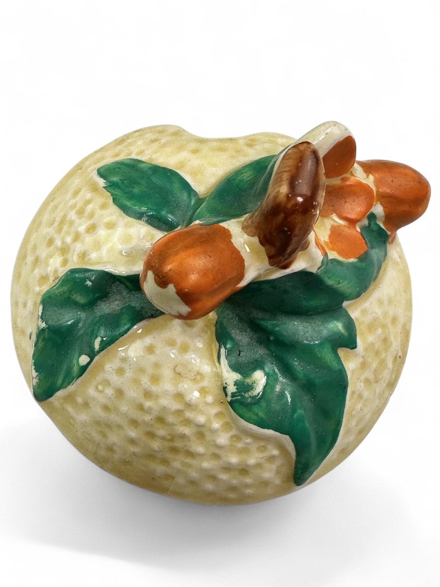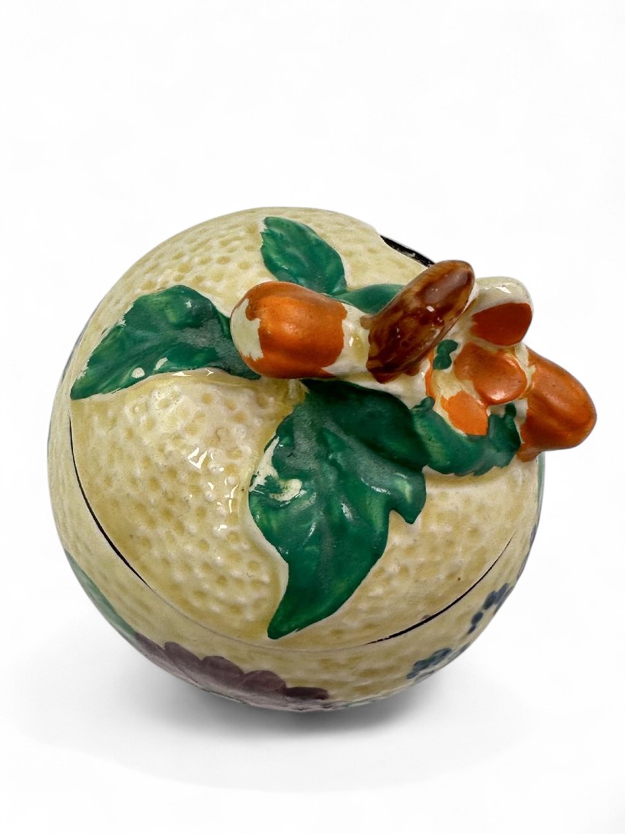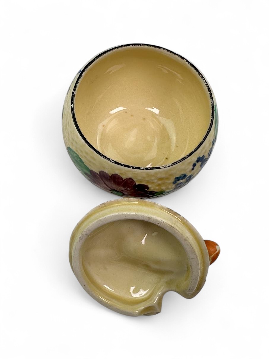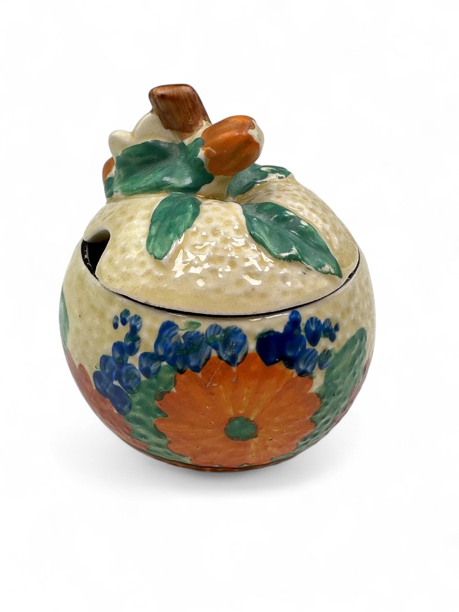 Clarice Cliff GAYDAY pattern small orange shape preserve pot and lid.