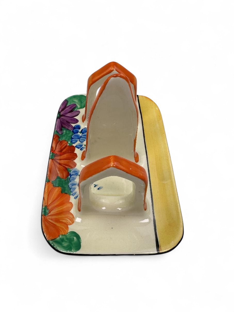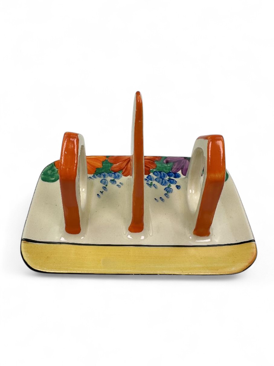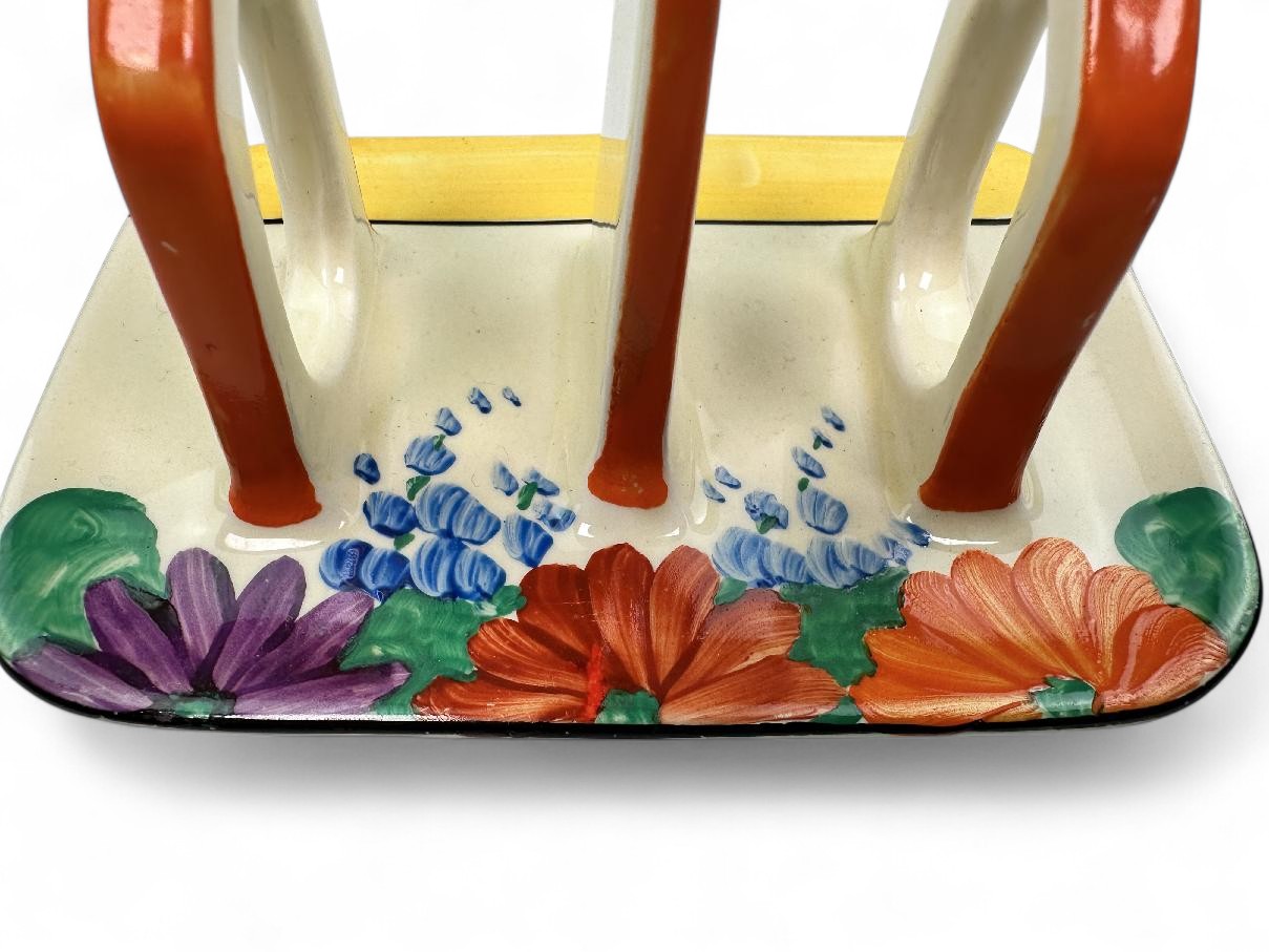 Clarice Cliff GAYDAY pattern three-prong toast rack.