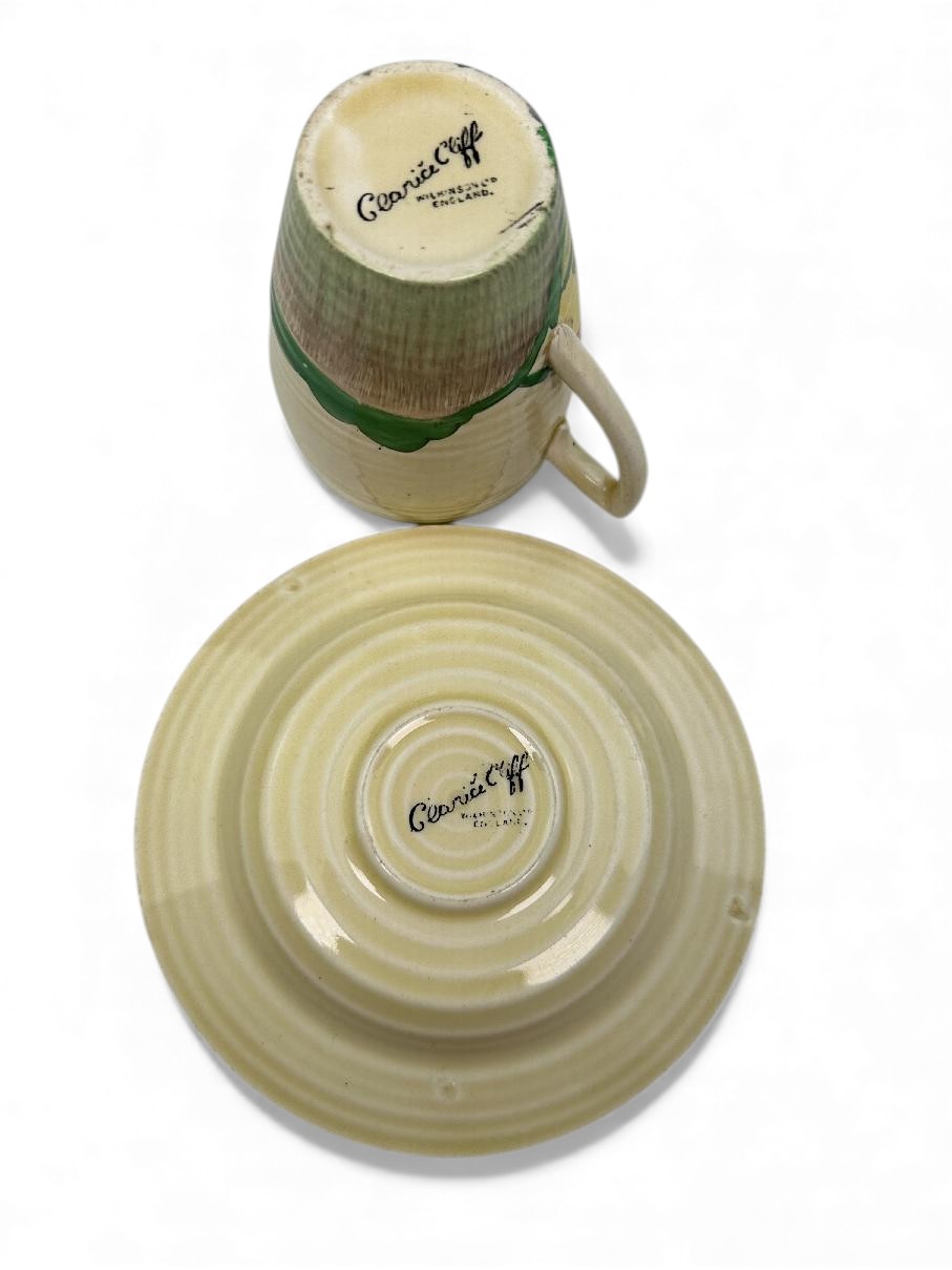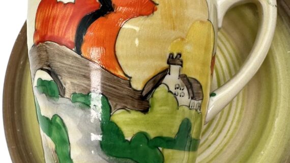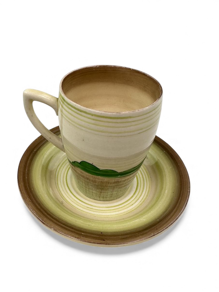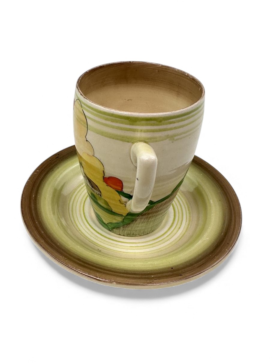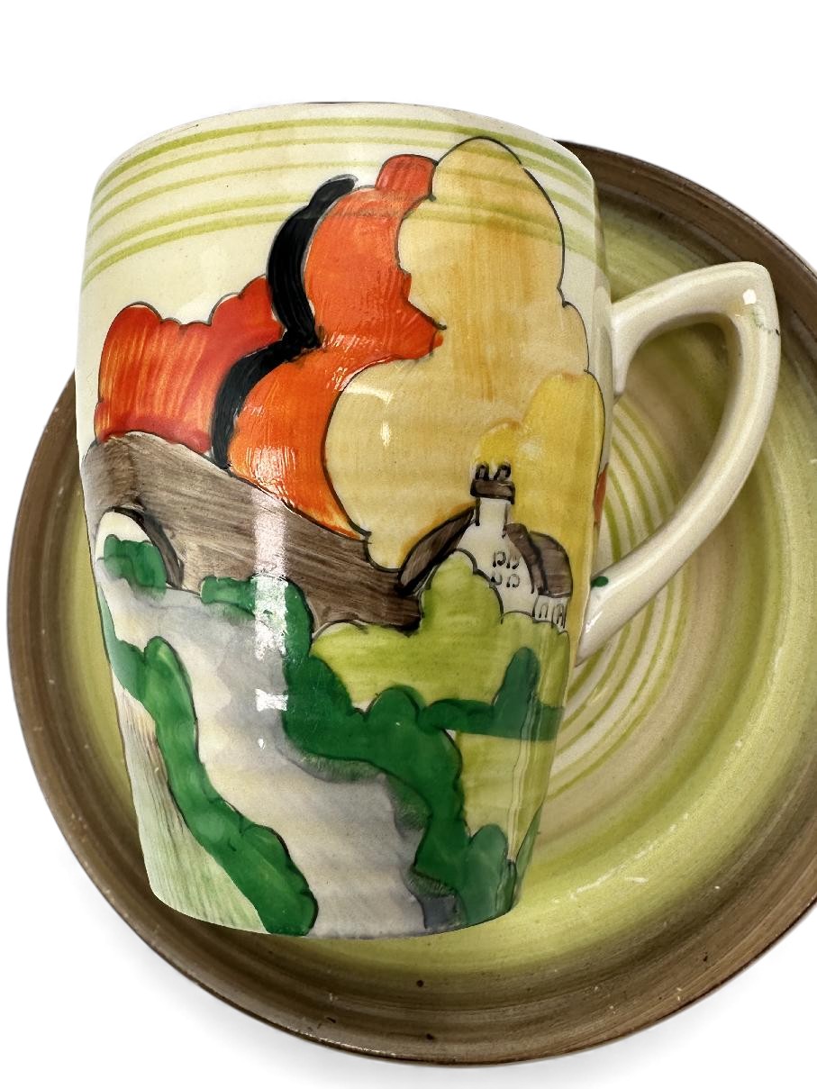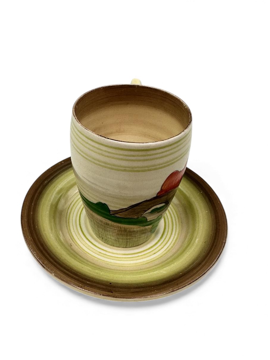 This is a lovely coffee cup & saucer, decorated with one of Clarice’s rarer, but attractive, landscape patterns. Banded saucer.