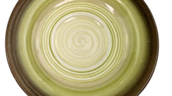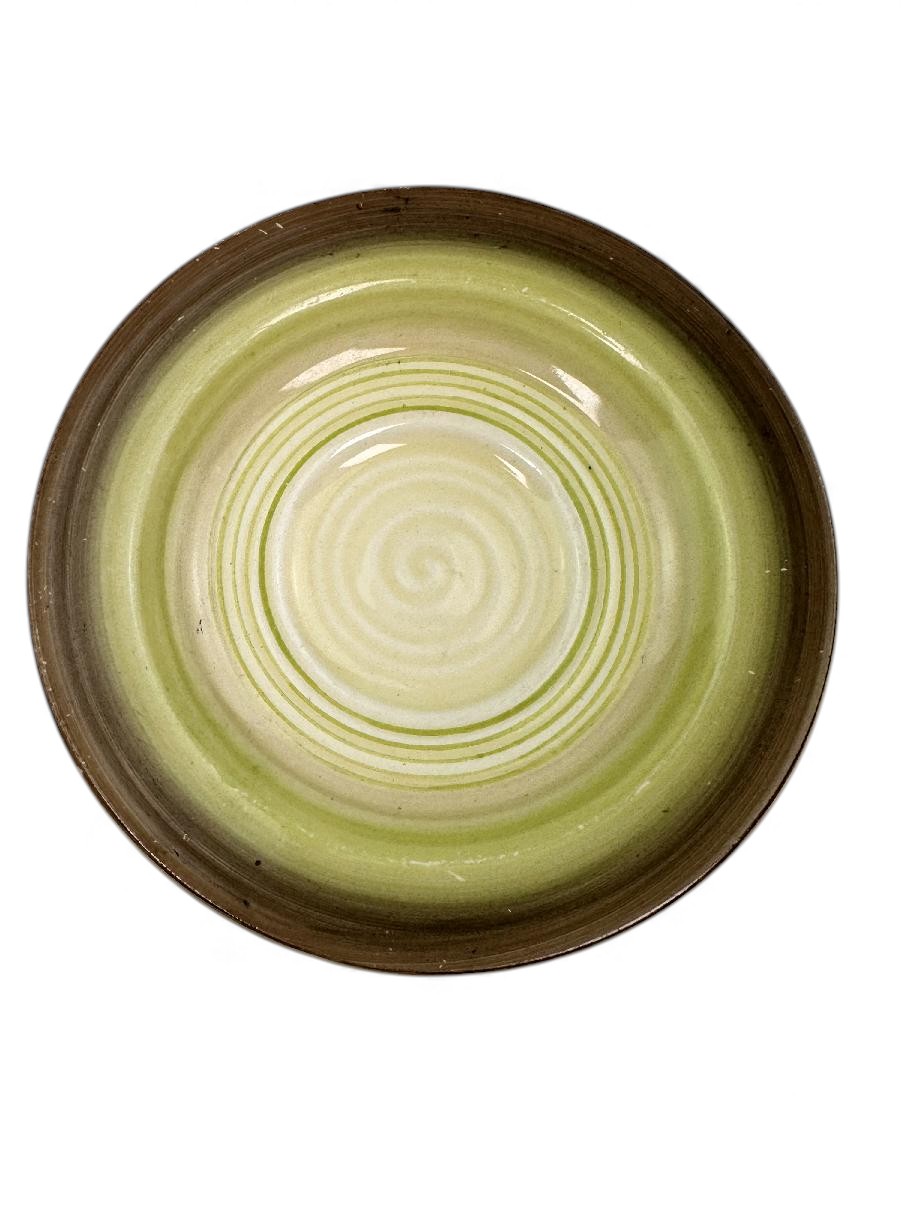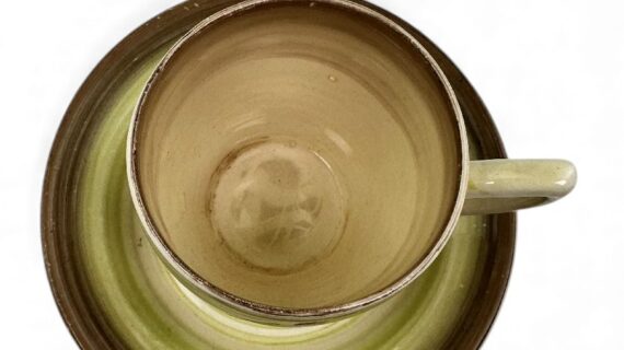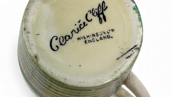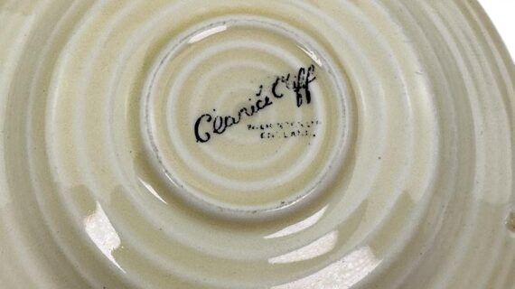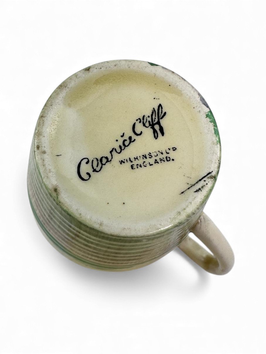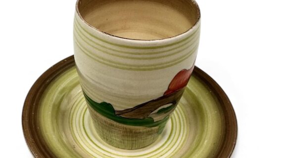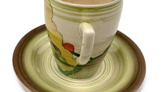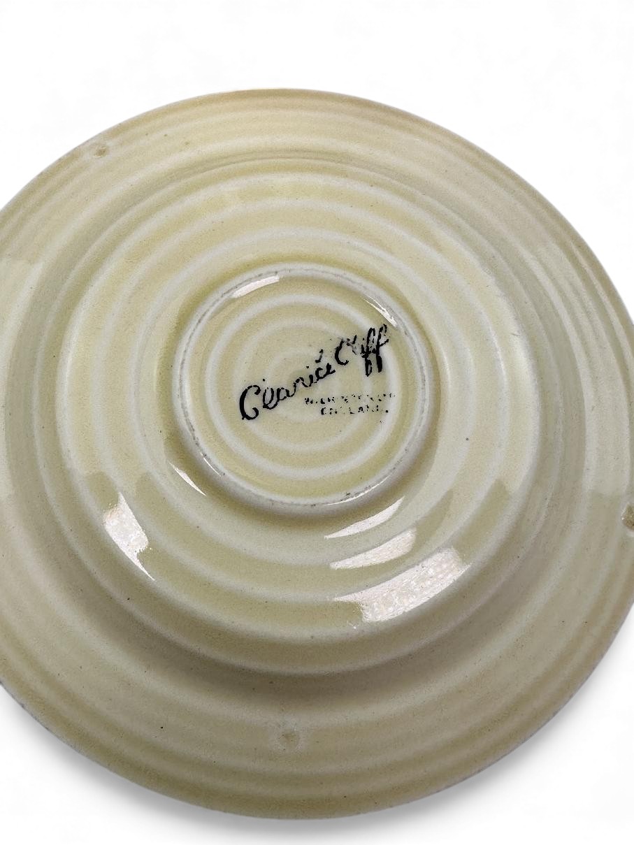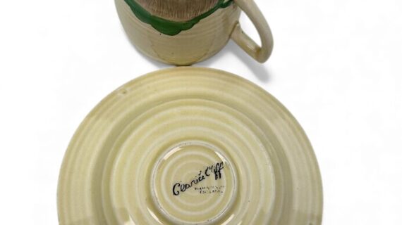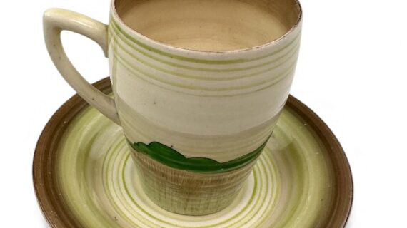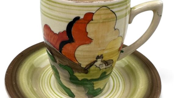 This is a lovely coffee cup & saucer, decorated with one of Clarice’s rarer, but attractive, landscape patterns. Banded saucer.