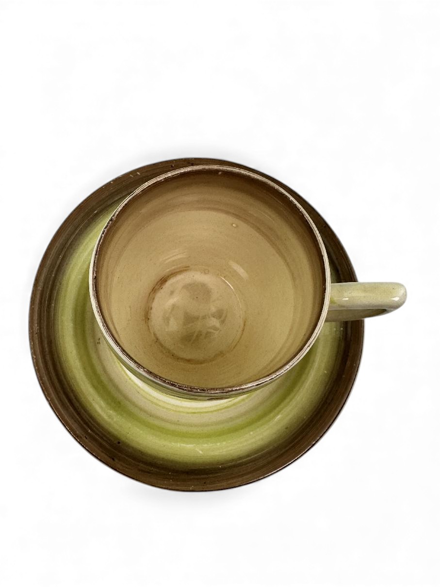 Clarice Cliff LORNA pattern, Lynton shape (ribbed) coffee cup (7.5cm high) & saucer (11.5cm diameter).