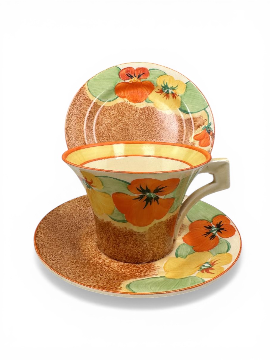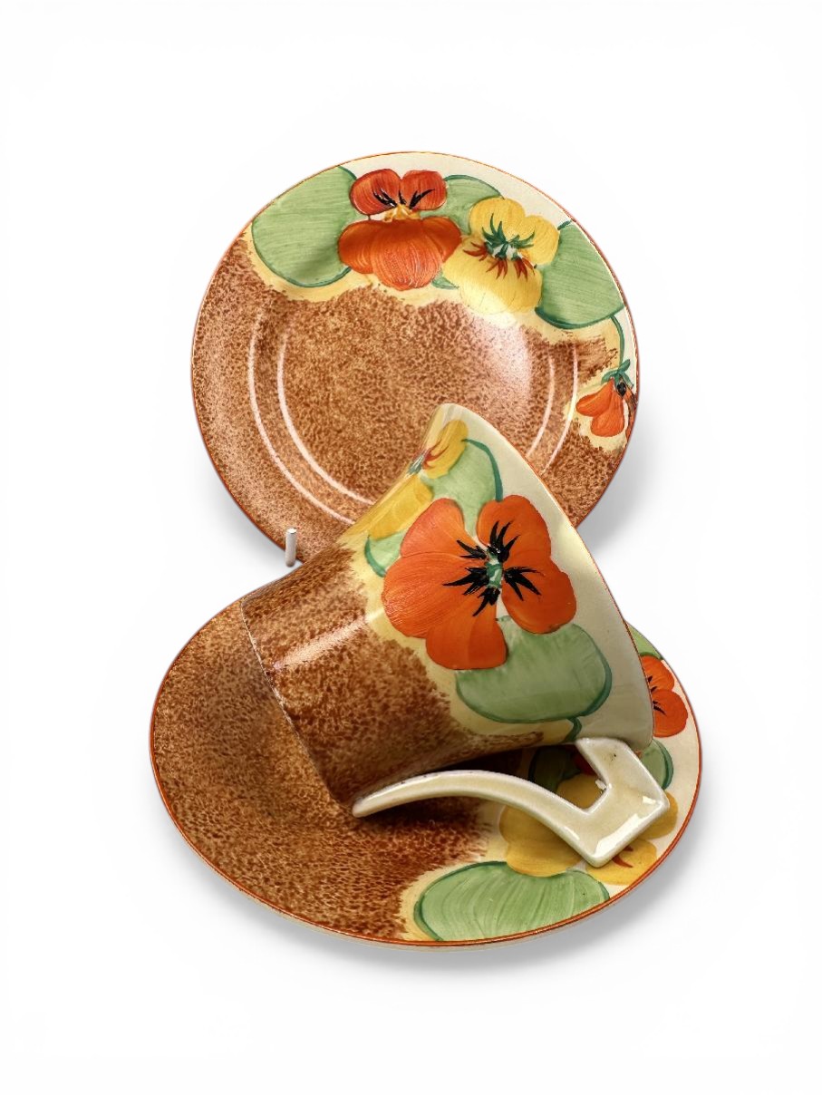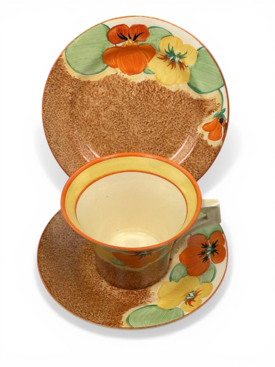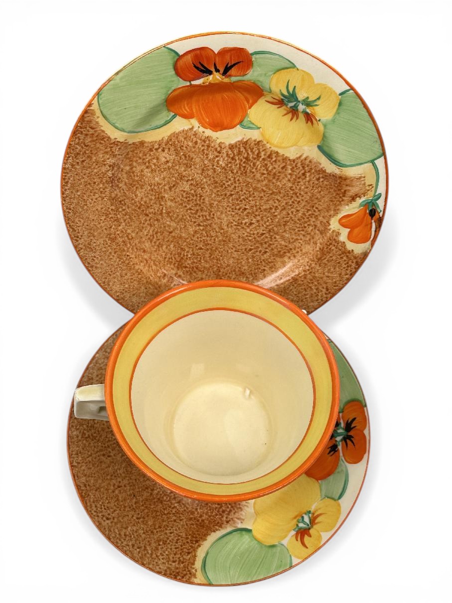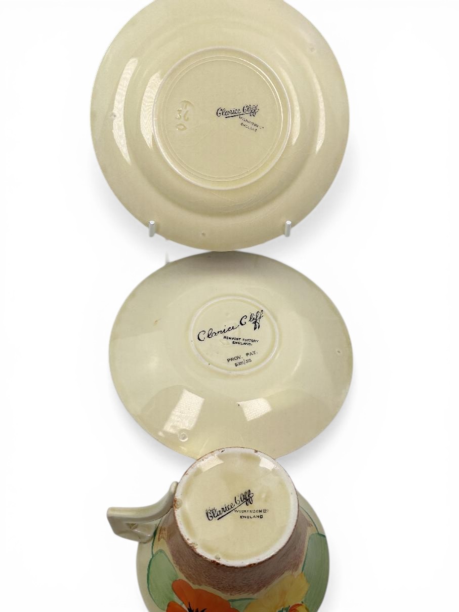 Clarice Cliff NASTURTIUM pattern daffodil trio (cup, saucer & plate). Circa 1936.