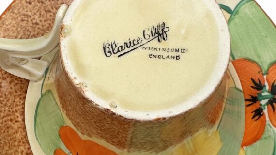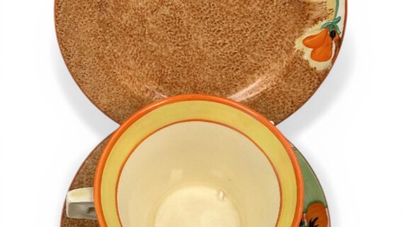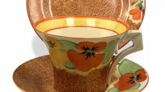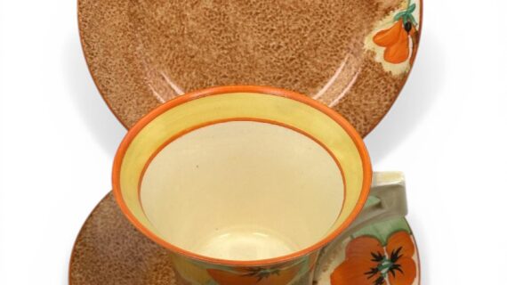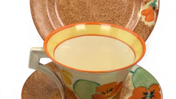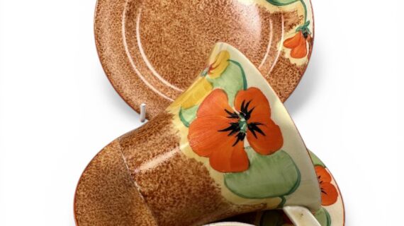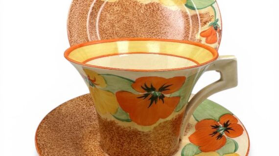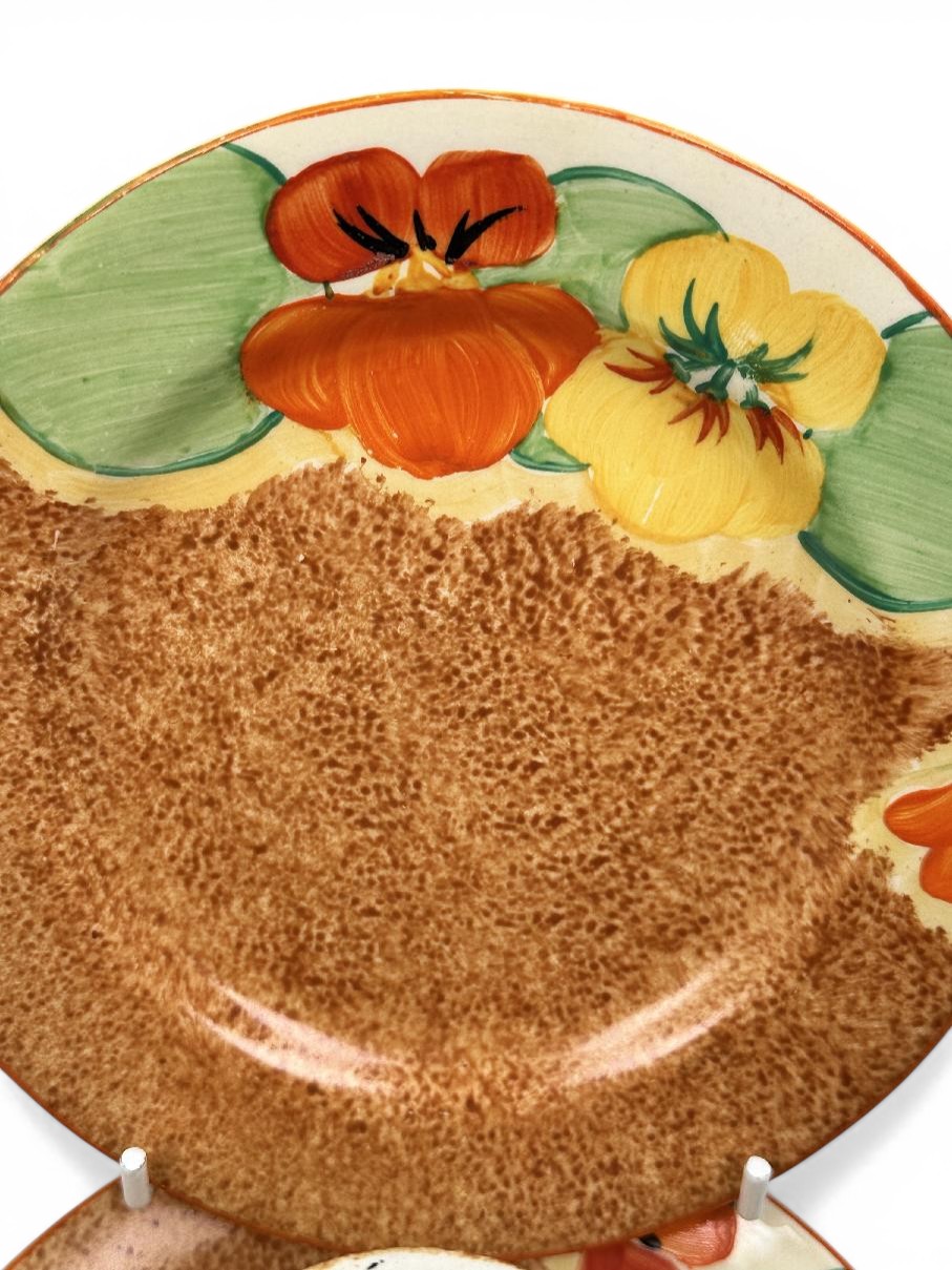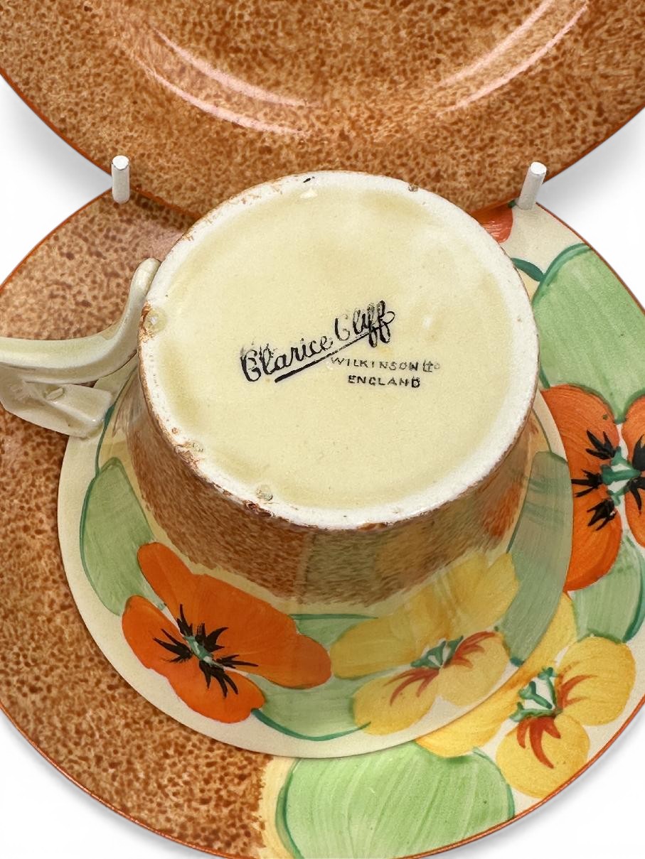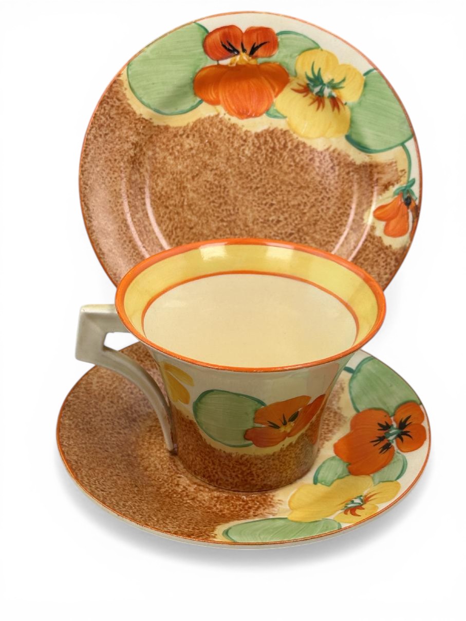 Clarice Cliff NASTURTIUM pattern daffodil trio (cup, saucer & plate). Circa 1936.