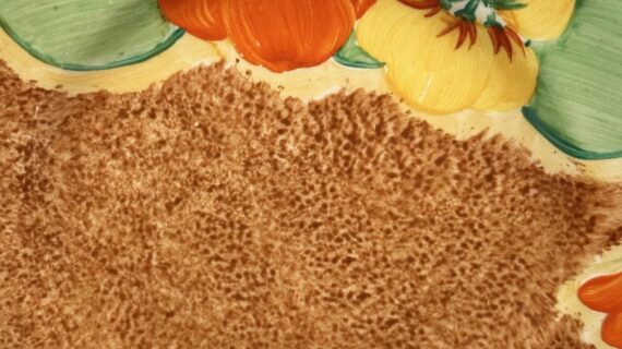 Brightly hand painted flowers on the cup, saucer and plate; brown stippling to represent the earth.