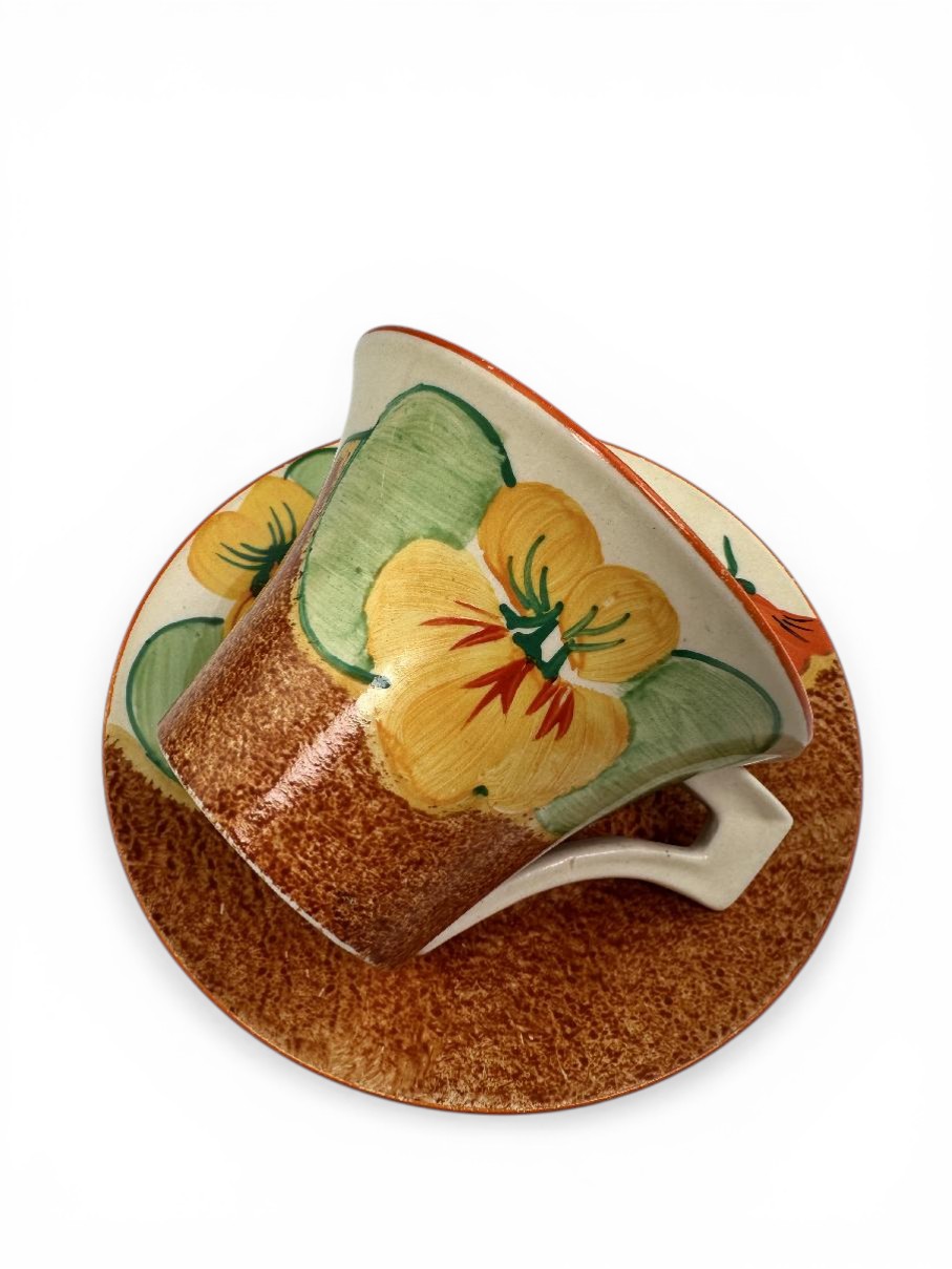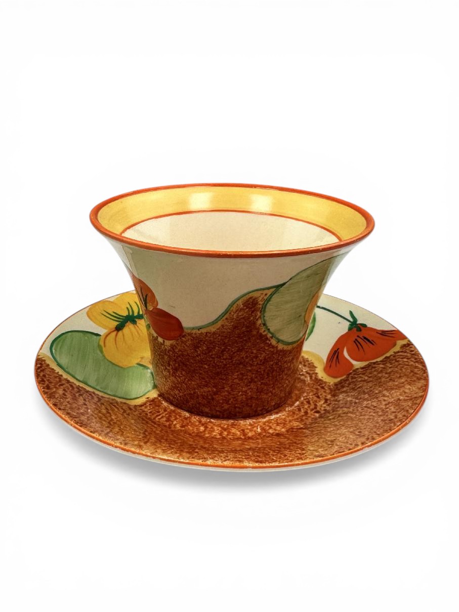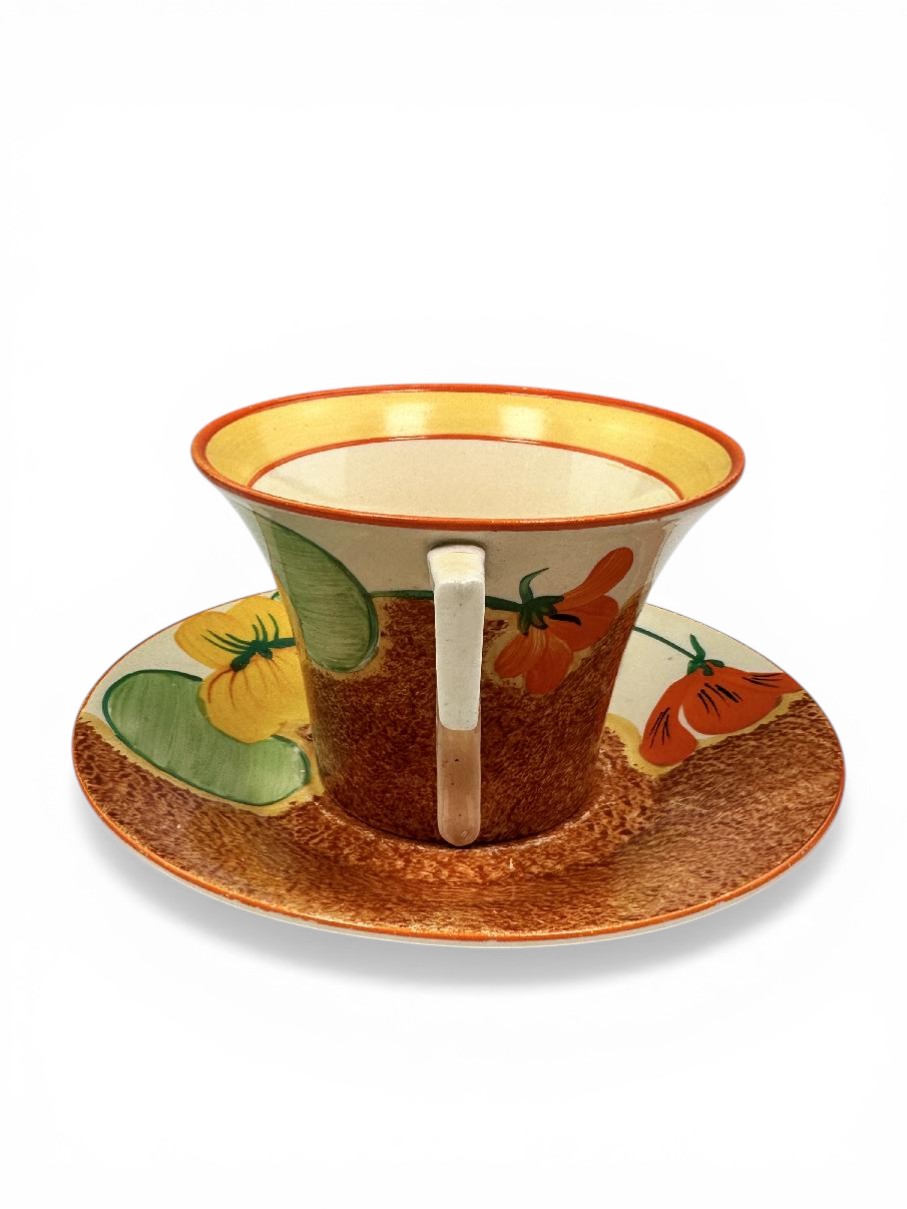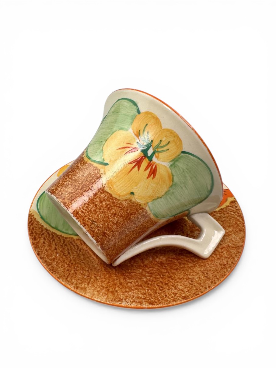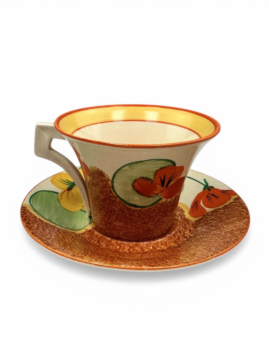 Clarice Cliff NASTURTIUM pattern daffodil shape tea cup & saucer. Circa 1932.