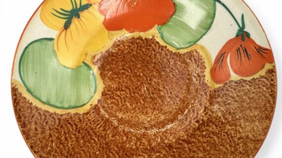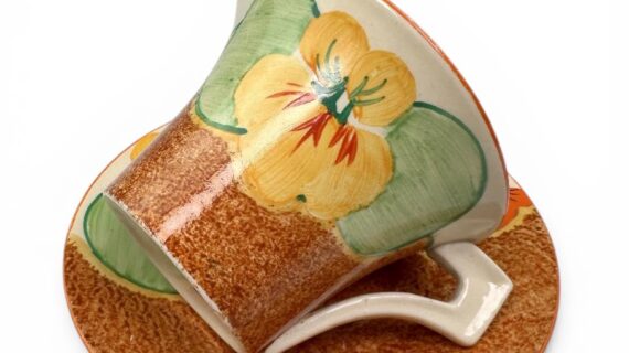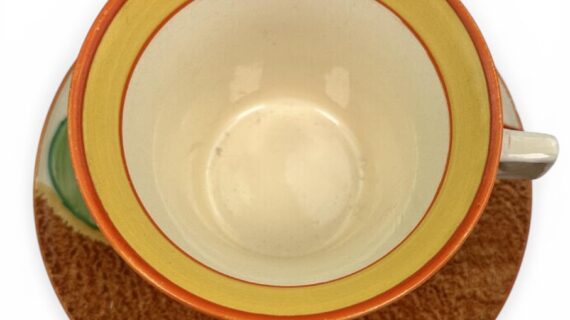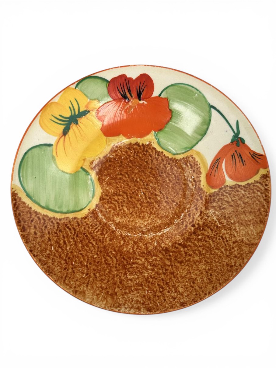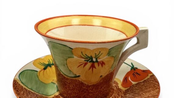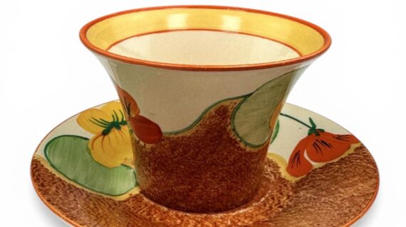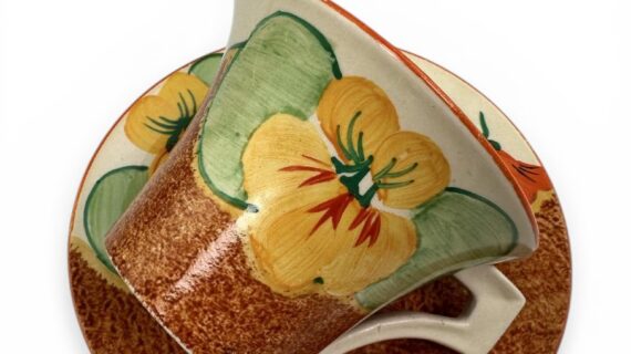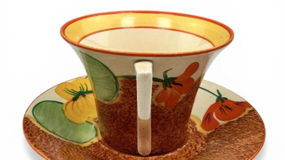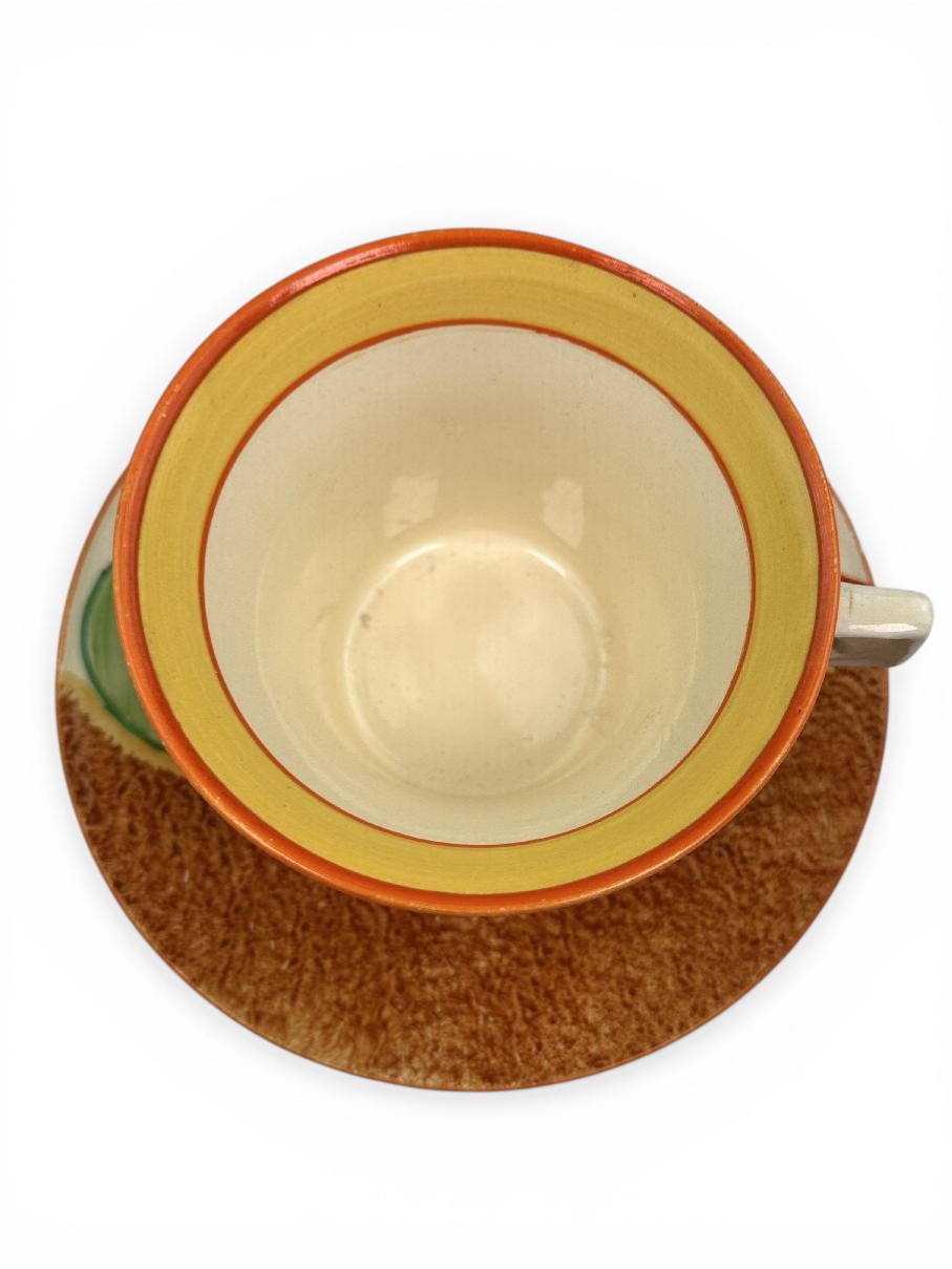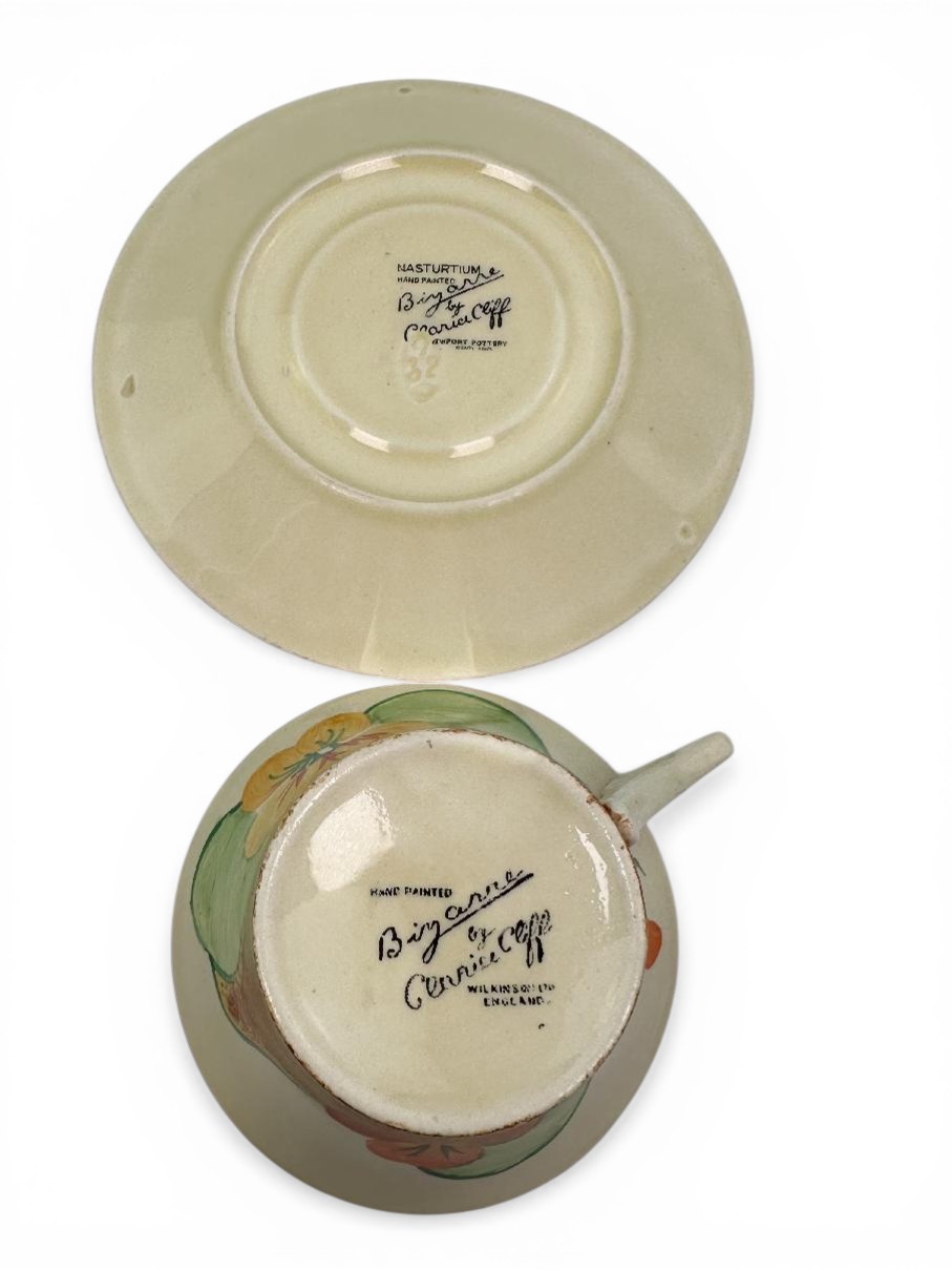 Clarice Cliff NASTURTIUM pattern daffodil shape tea cup & saucer. Circa 1932.