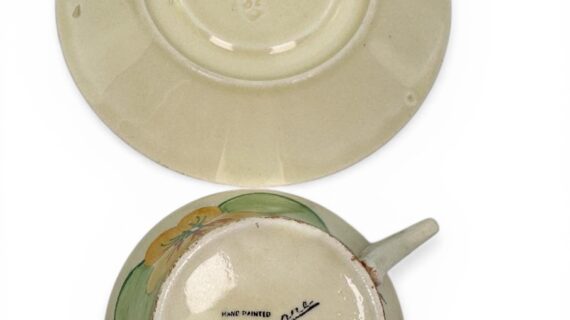 The cup is approximately 6.5cm high and the saucer is 14.5cm diameter. Saucer has an impressed date mark for 1932.