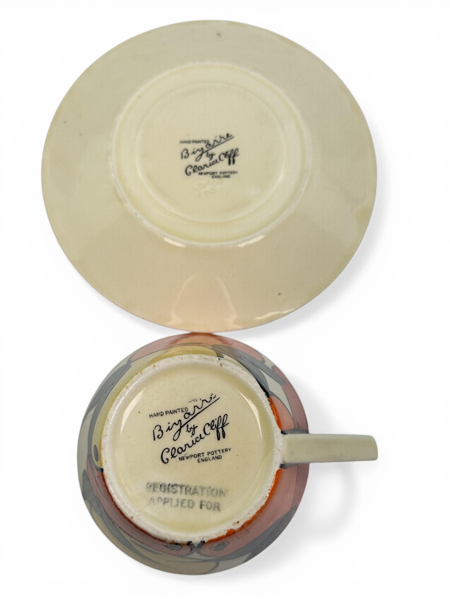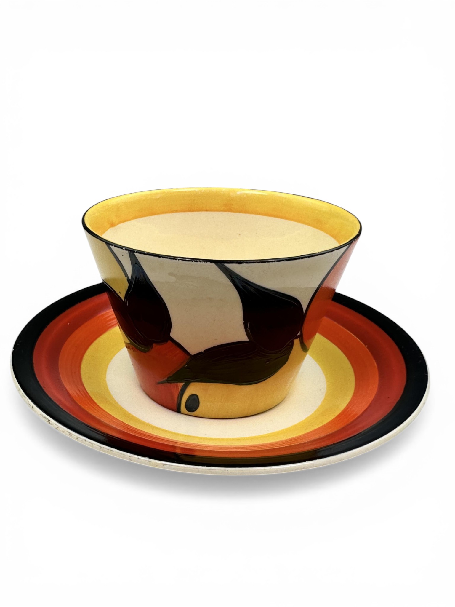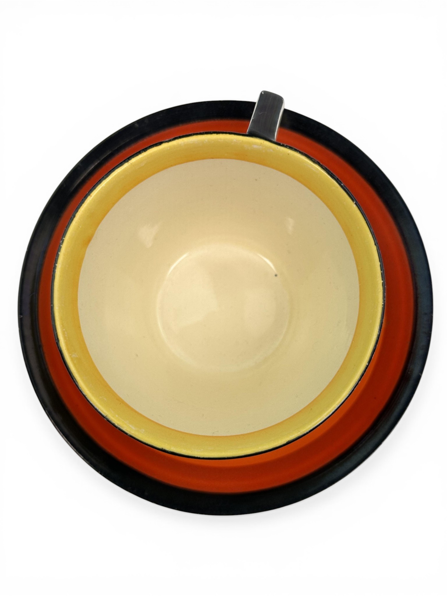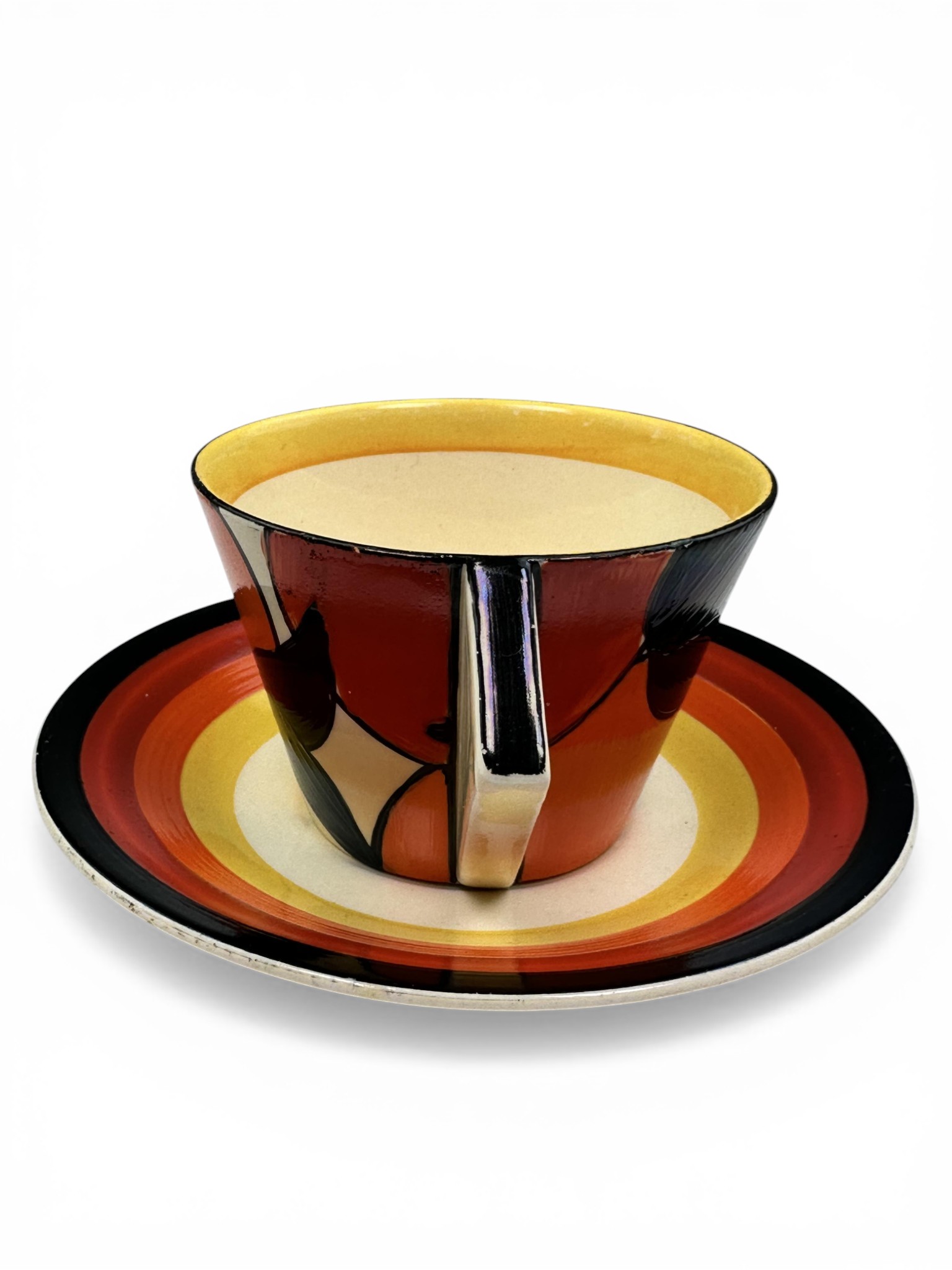 Clarice Cliff Oranges & Lemons pattern, conical cup & saucer, circa 1930.