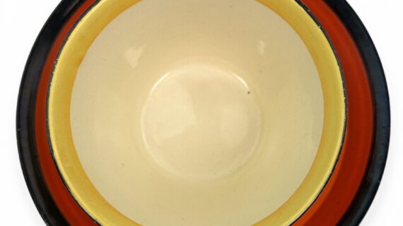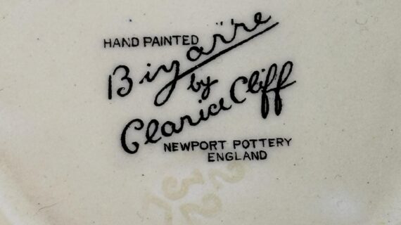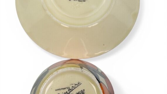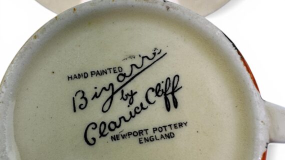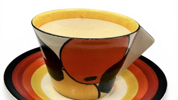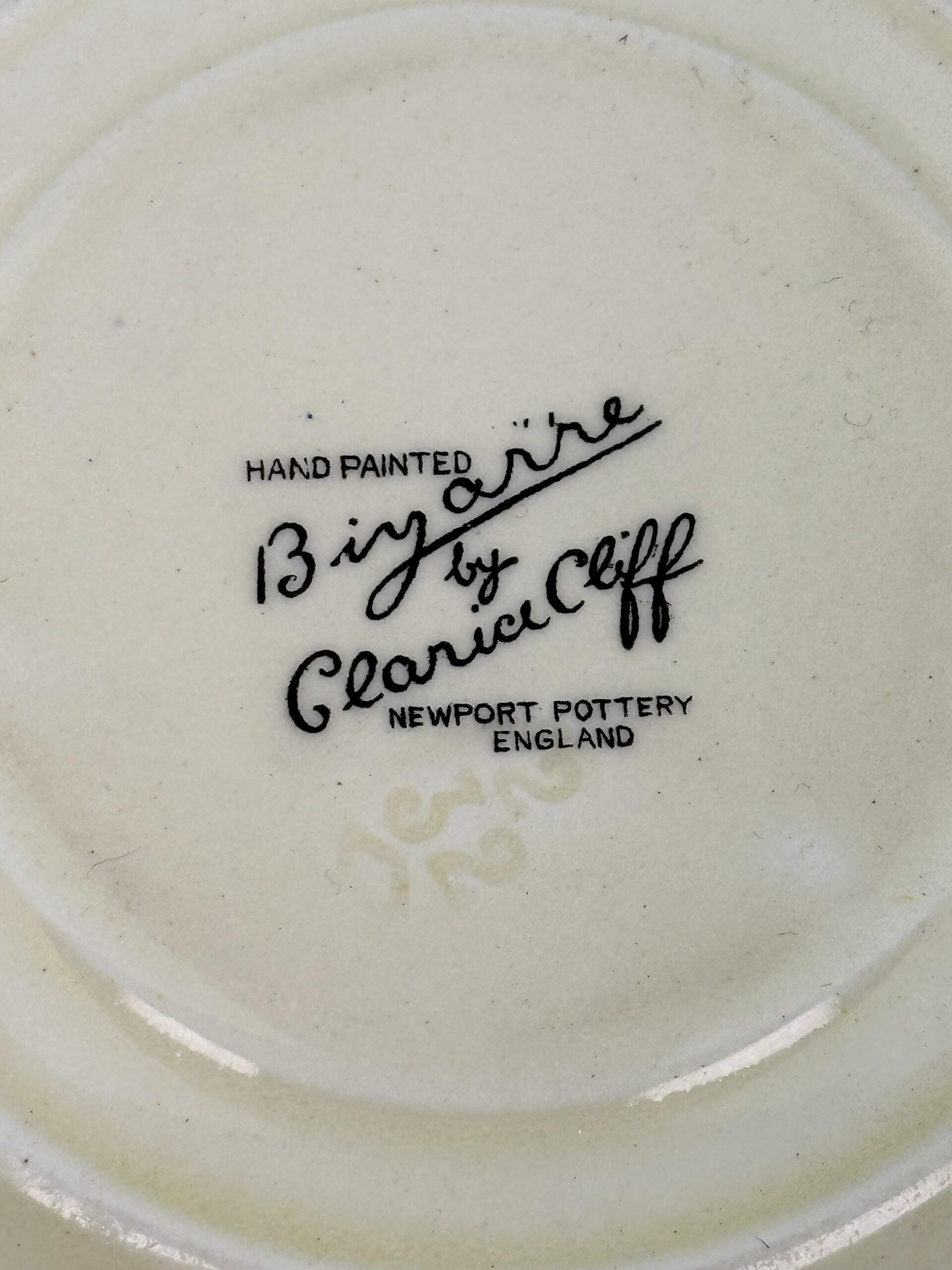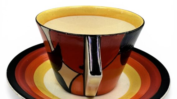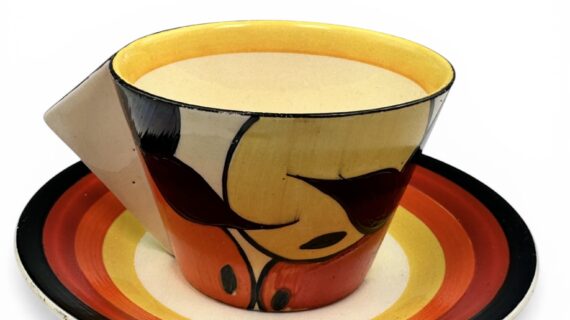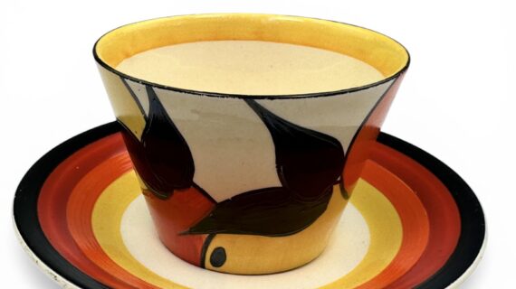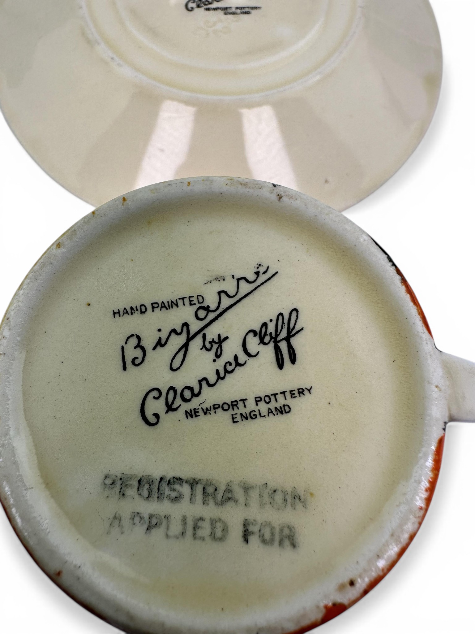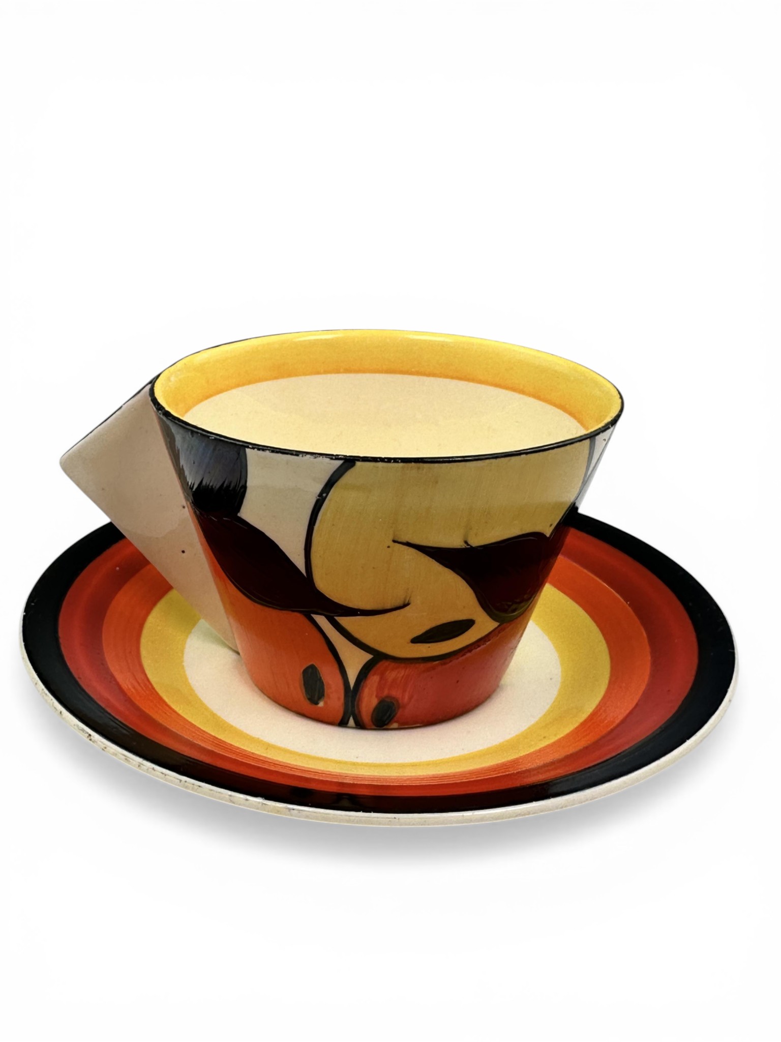 Clarice Cliff Oranges & Lemons pattern, conical cup & saucer, circa 1930.