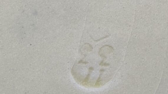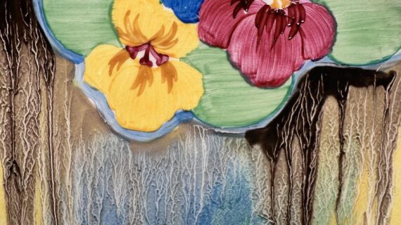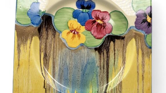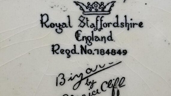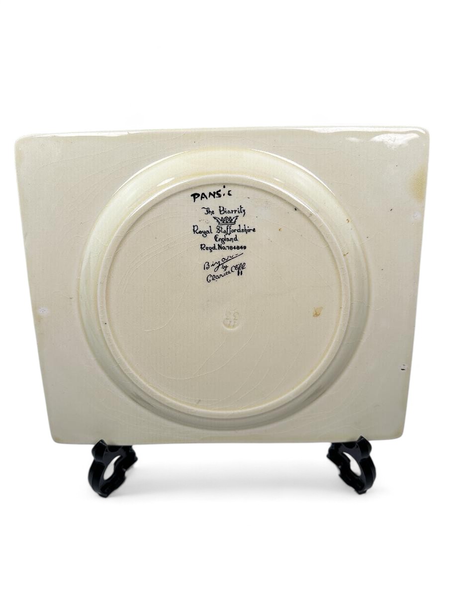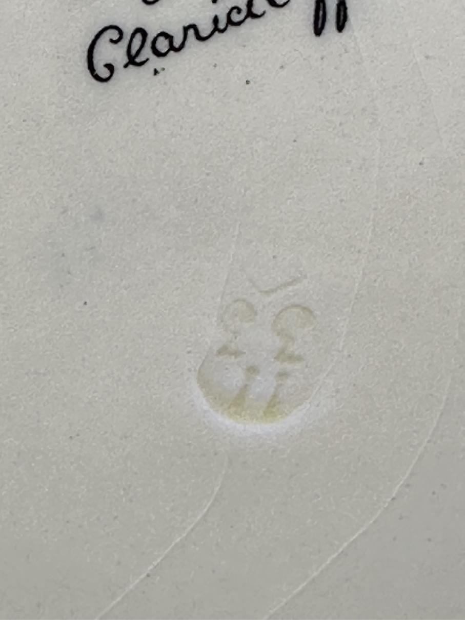 Stamped Bizarre by Clarice Cliff to the base plus a handwritten PANSIES pattern name. Also has an impressed date mark for 1933.
