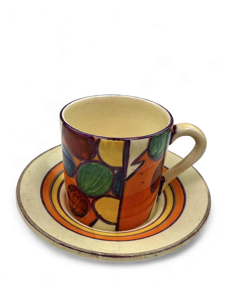 Clarice Cliff PEBBLES pattern tankard shape coffee cup and saucer.