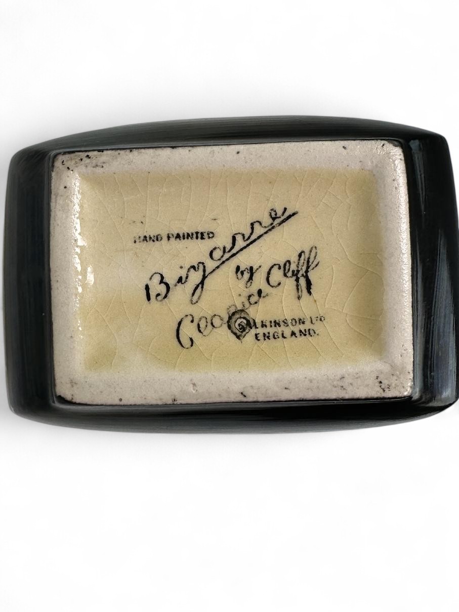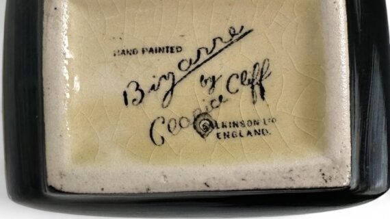 The sugar bowl has the Bizarre by Clarice Cliff stamp to its base.