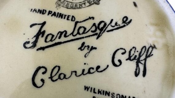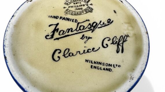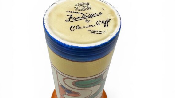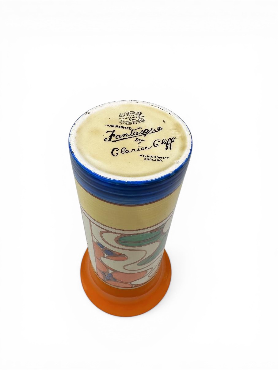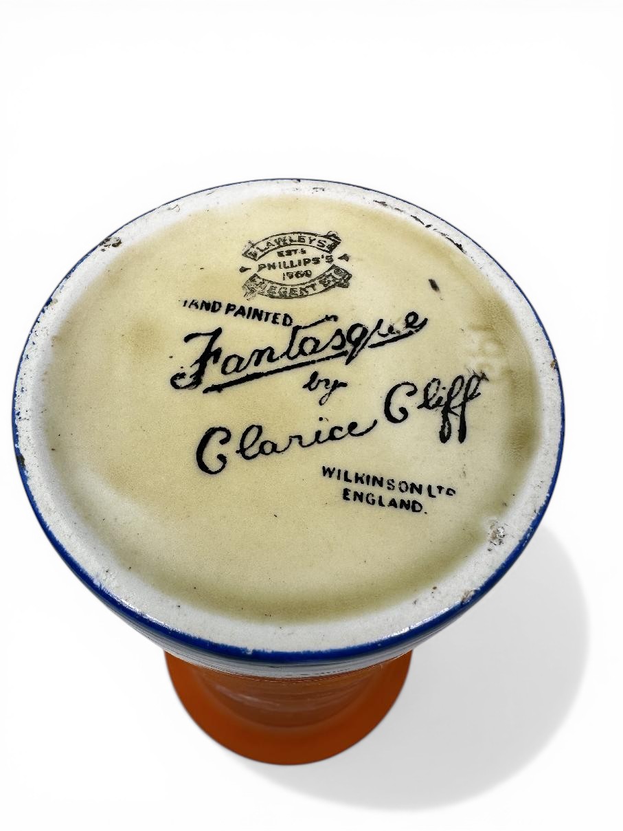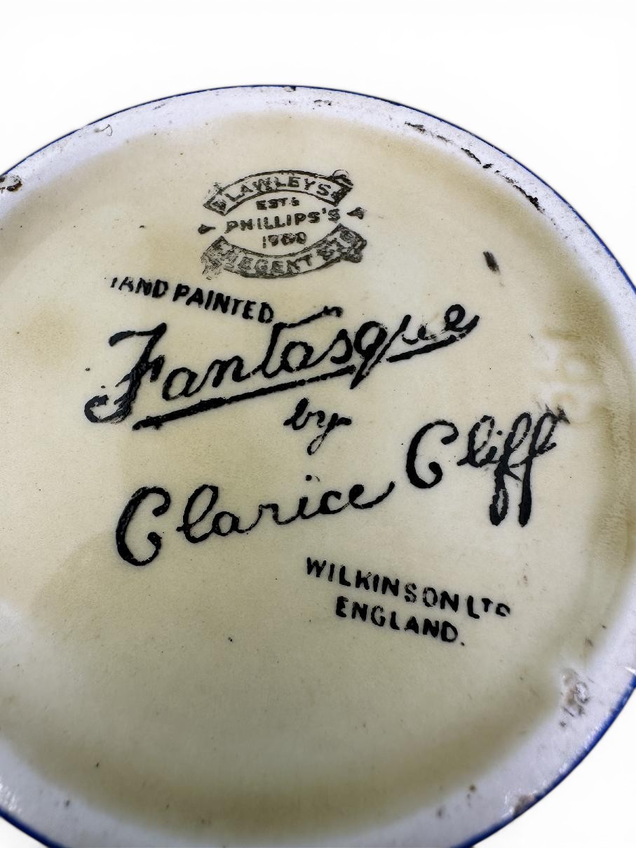 Stamped with the early Fantasque by Clarice Cliff script mark to the base plus a gold Lawleys retailer mark.