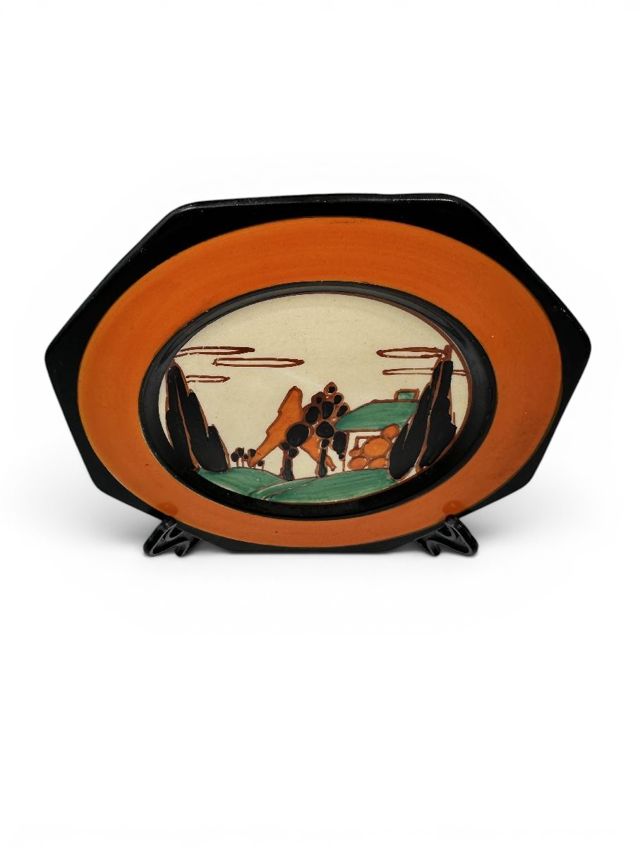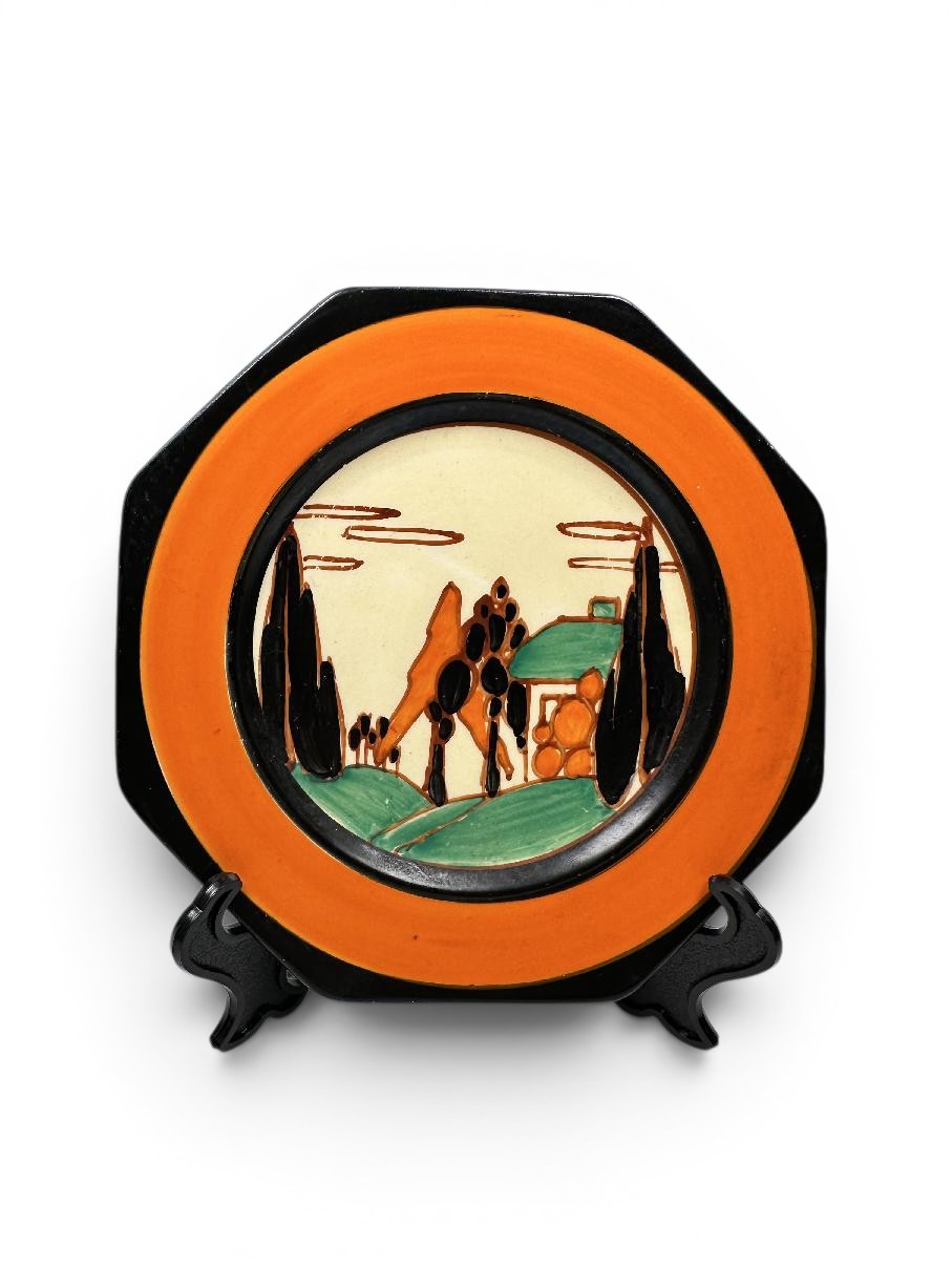 Clarice Cliff TREES & HOUSE (orange) octagonal sandwich plate, small size.
