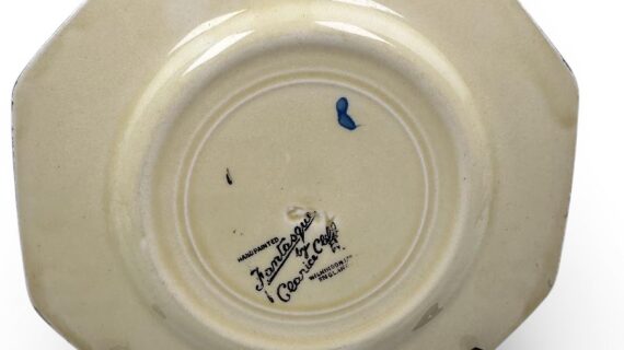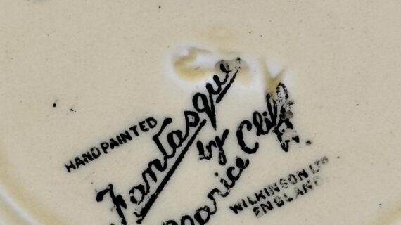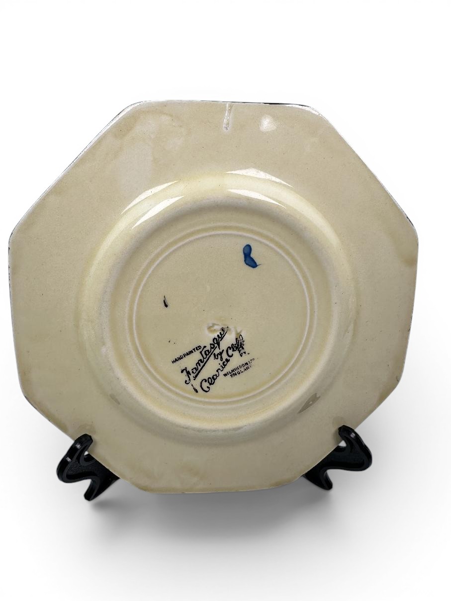 Stamped with the large script Fantasque by Clarice Cliff mark to the base. Also has an impressed date stamp (indistinct) for 1930. Width of plate is 14.5cm.