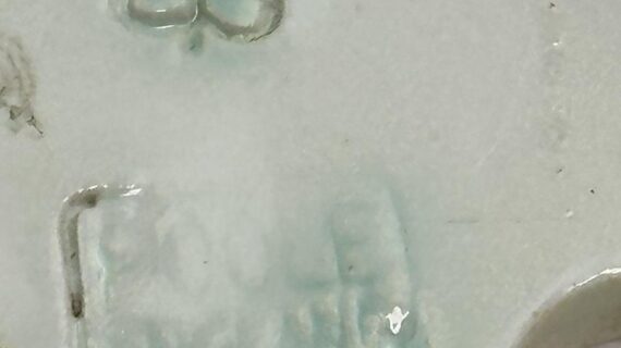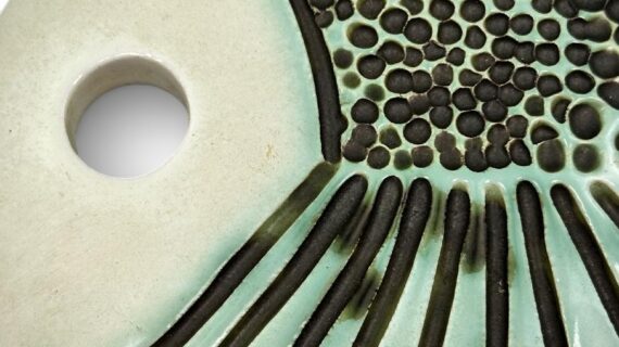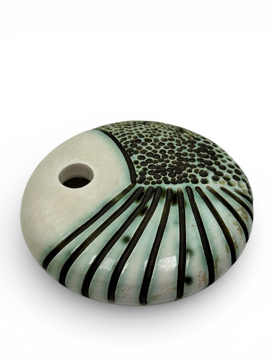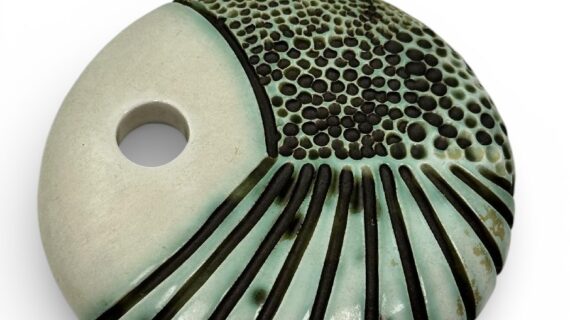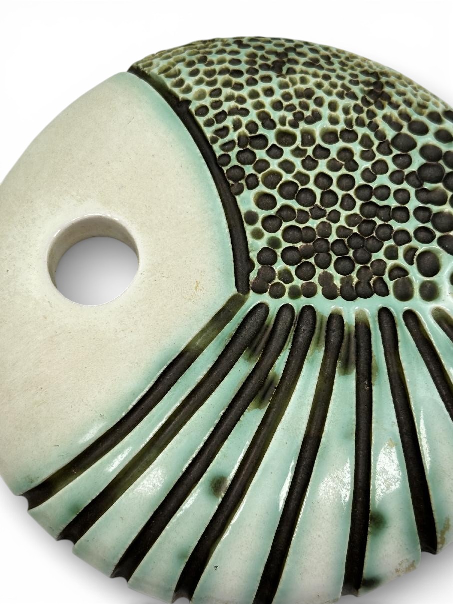 Poole Atlantis circular, flat ‘pendant’ with white/blue glaze and impressed fish-style pattern and hole for hanging.
