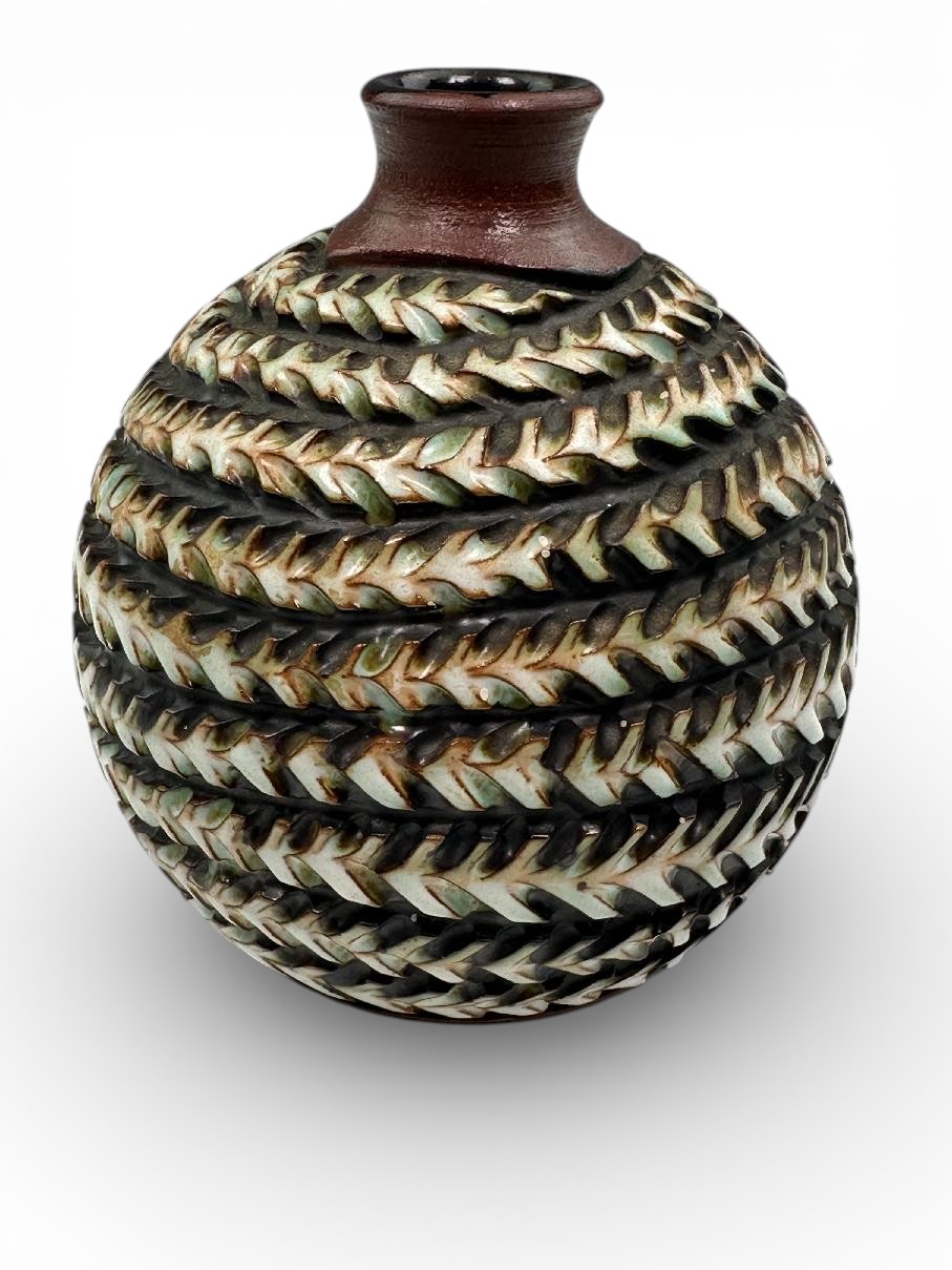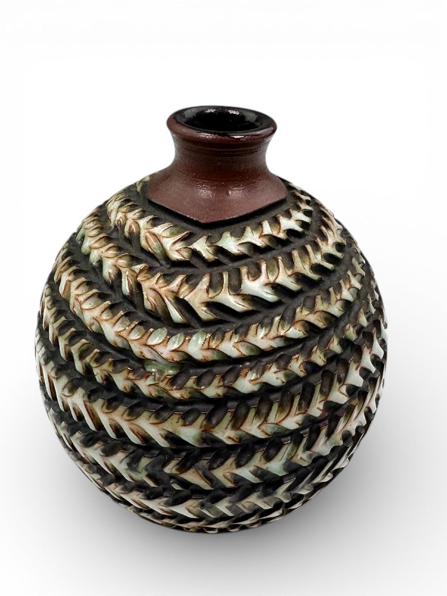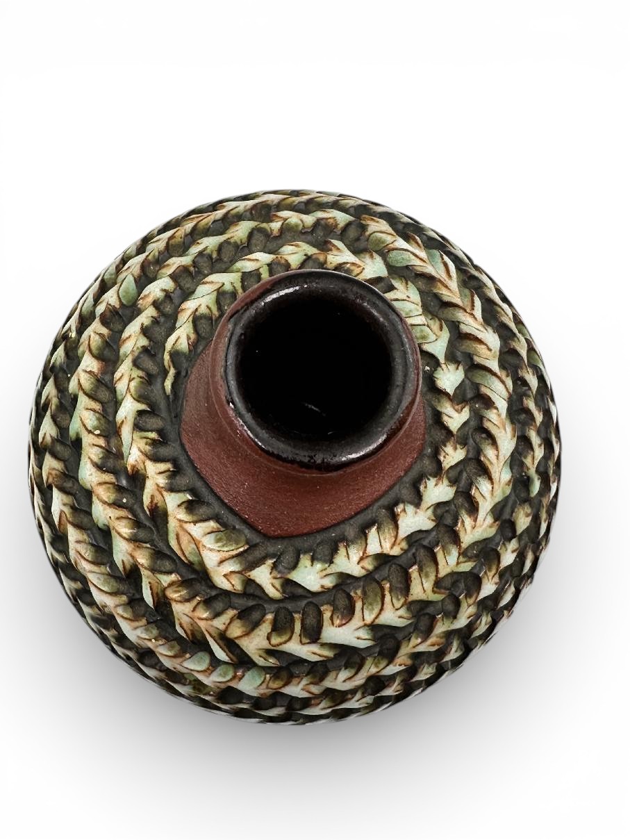Poole Atlantis vase small globe/posy vase with impressed arrows decoration and teracotta ground.
