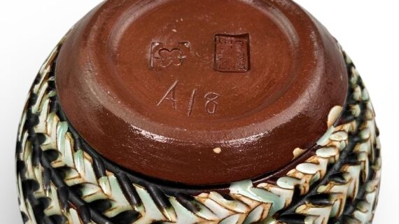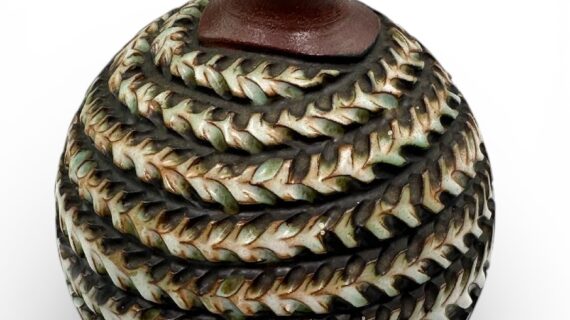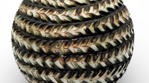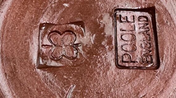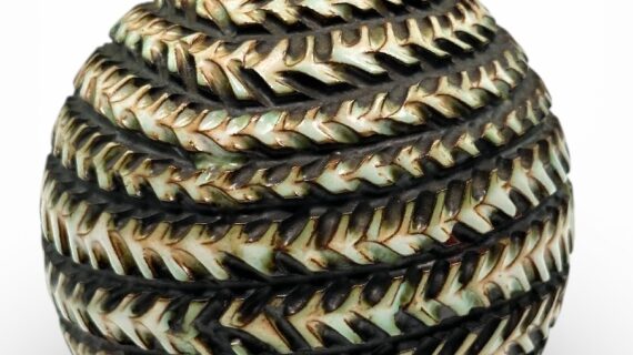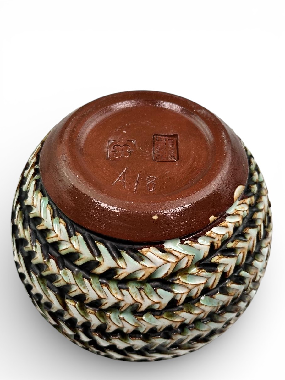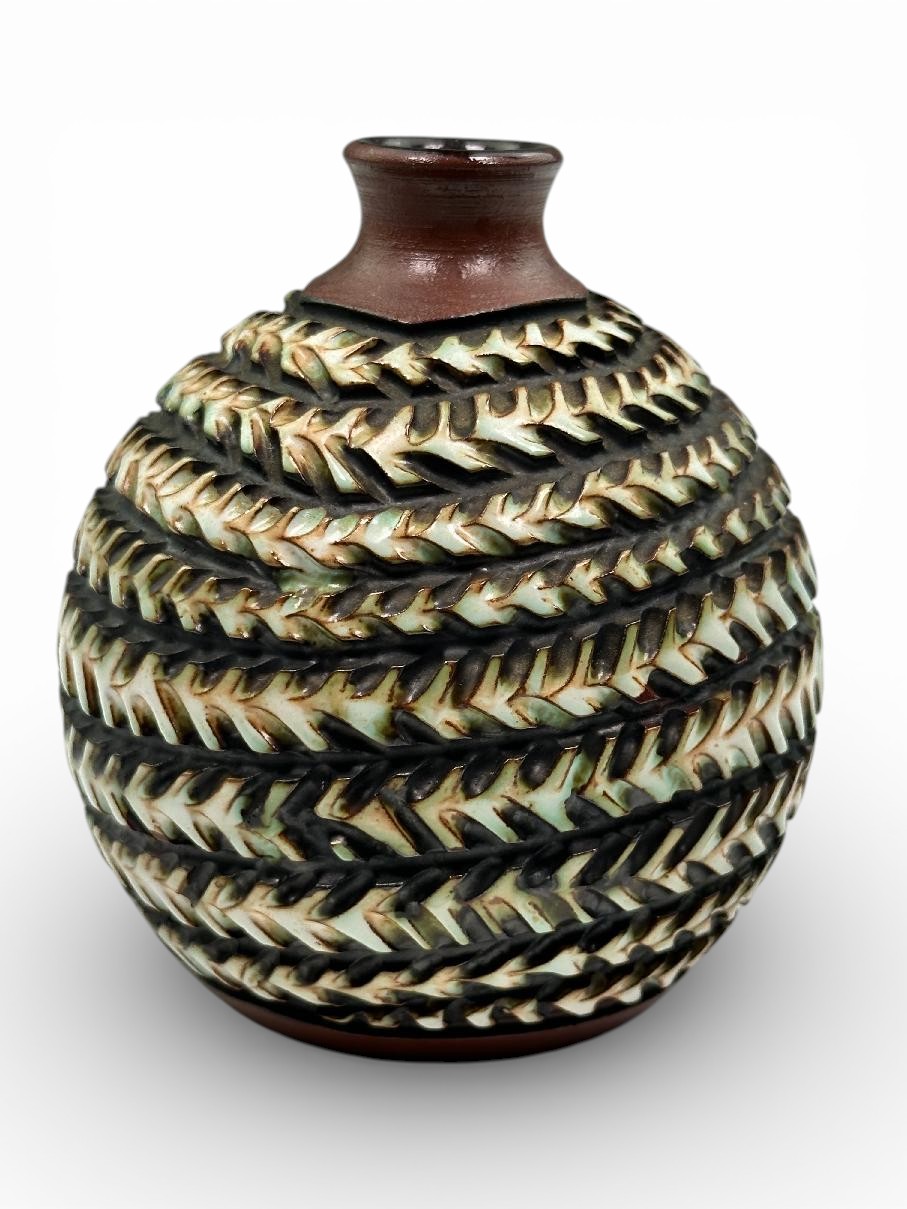 Poole Atlantis vase small globe/posy vase with impressed arrows decoration and teracotta ground.