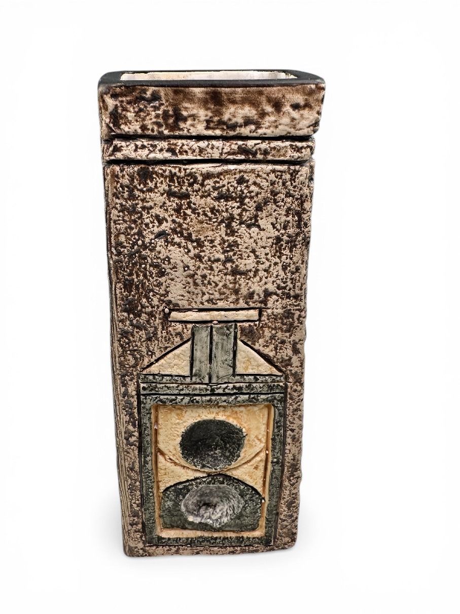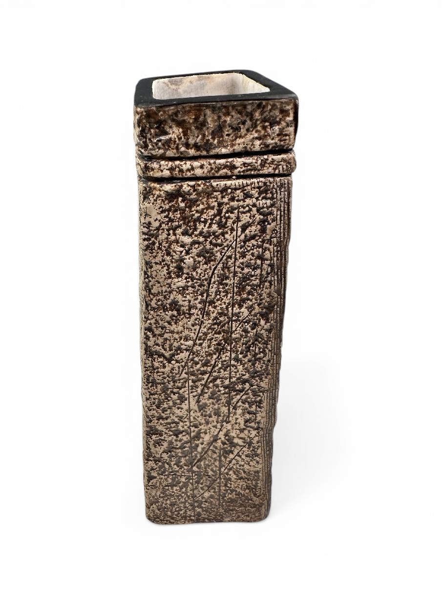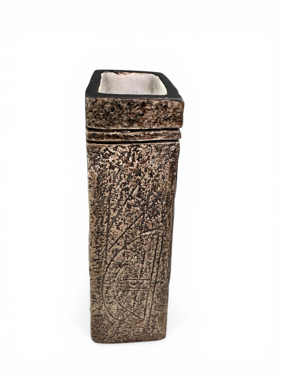 Troika coffin vase in cream/brown with abstract designs to both sides.
