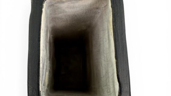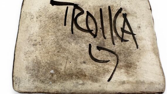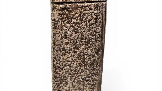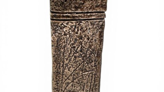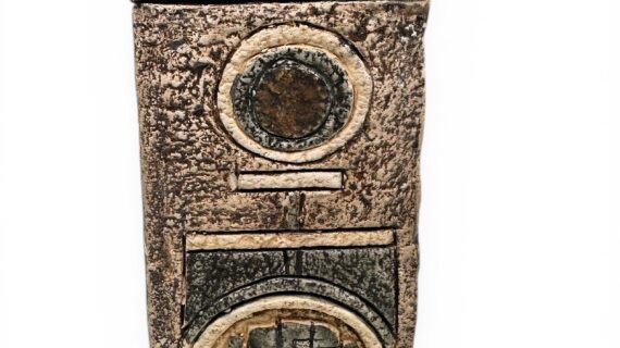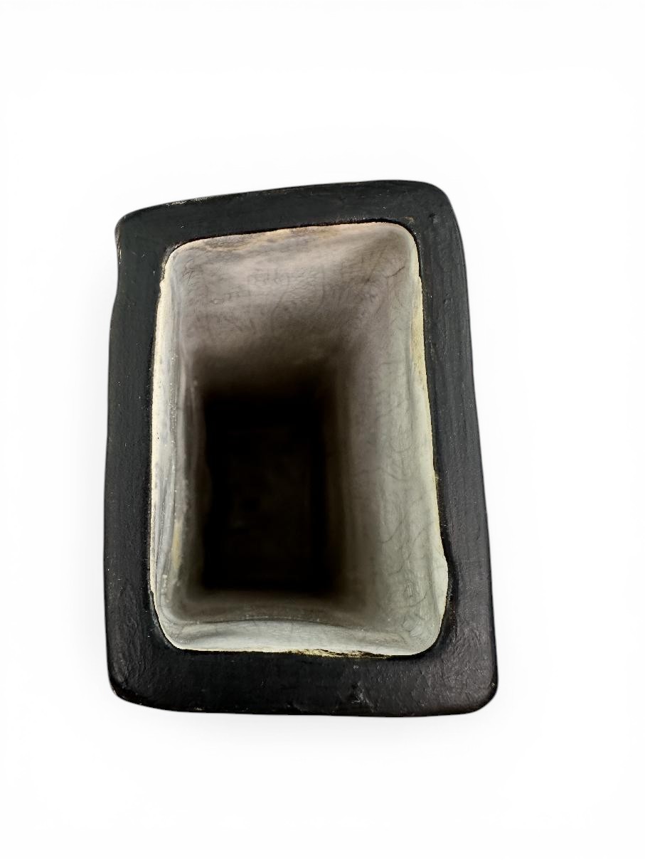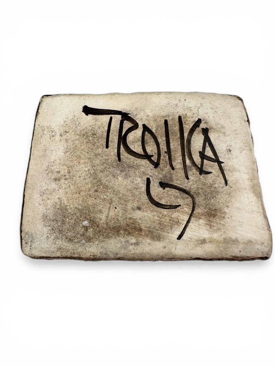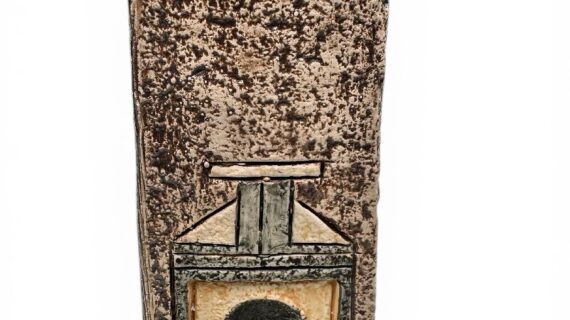 Troika coffin vase in cream/brown with abstract designs to both sides.